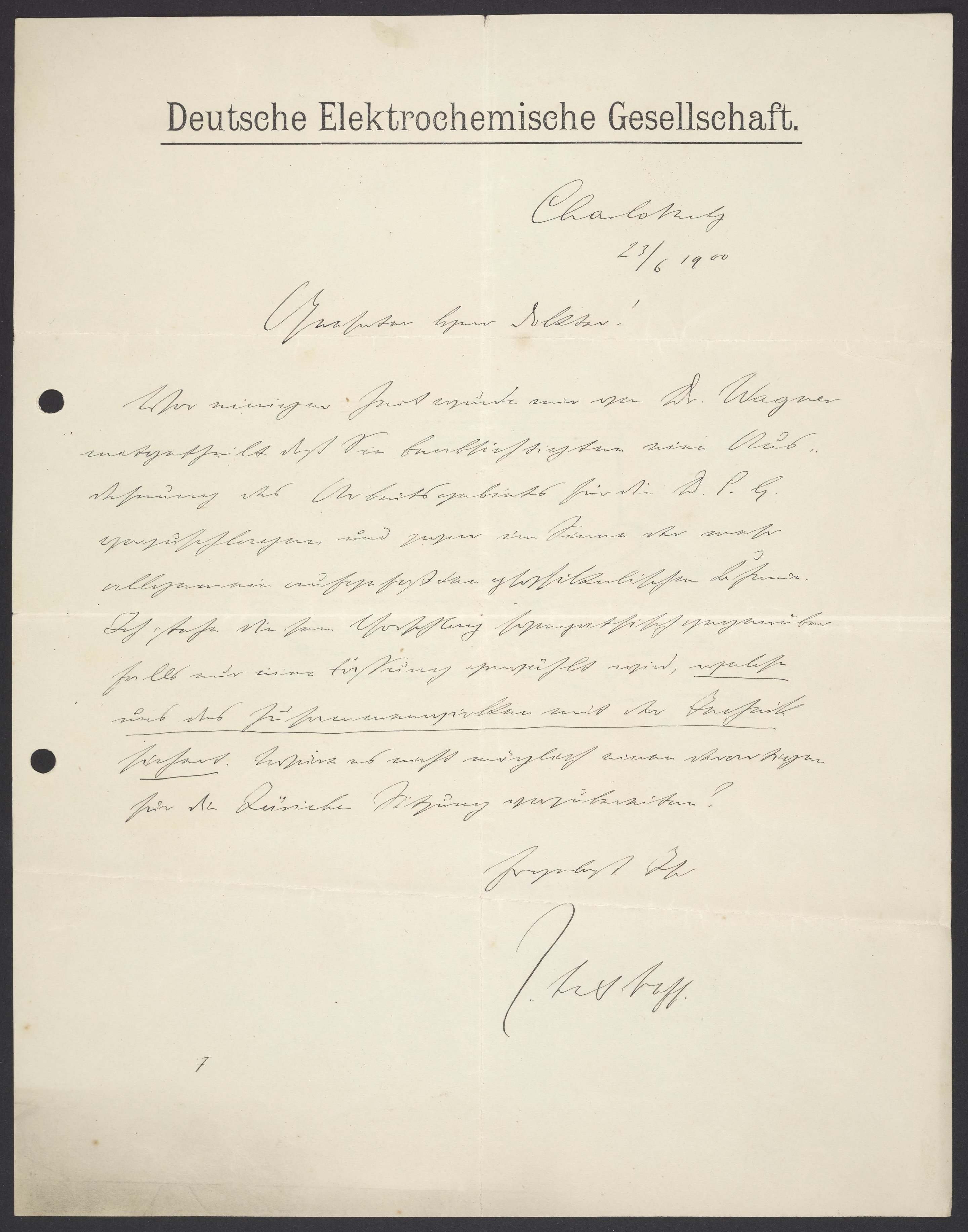 Vor eigner Zeit wurde mir von Dr. Wagner mitgetheilt daß Sie beabsichtigten eine Ausdehnung des Arbeitsgebiets für die D. P. G. vorzuschlagen und zwar im Sinne der mehr allgemein aufgefaßten physikalischen Chemie. Ich stehe diesem Vorschlag skepthisch gegenüber falls nur eine Lösung gewählt wird, welche uns das Zusammenwirken mit der Technik sichert. Wäre es nicht möglich einen derartigen für die Züricher Sitzung vorzubereiten?