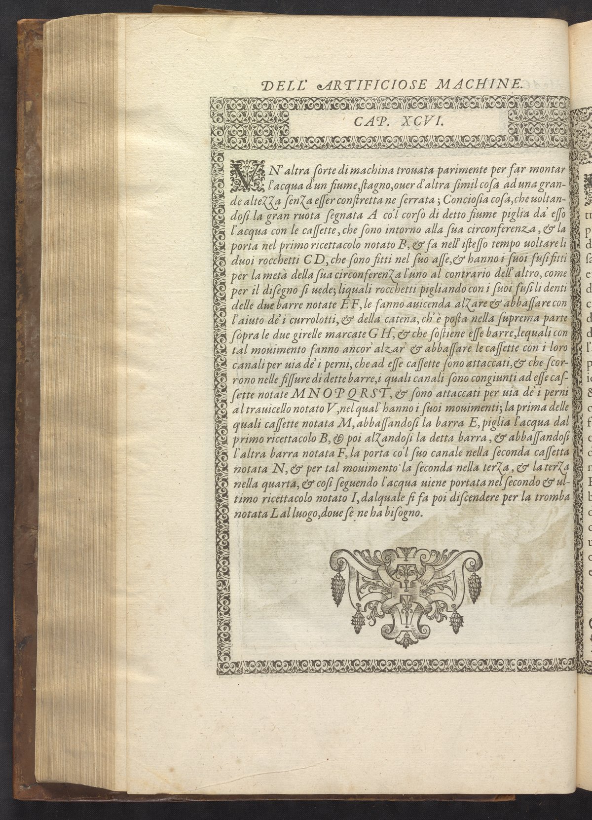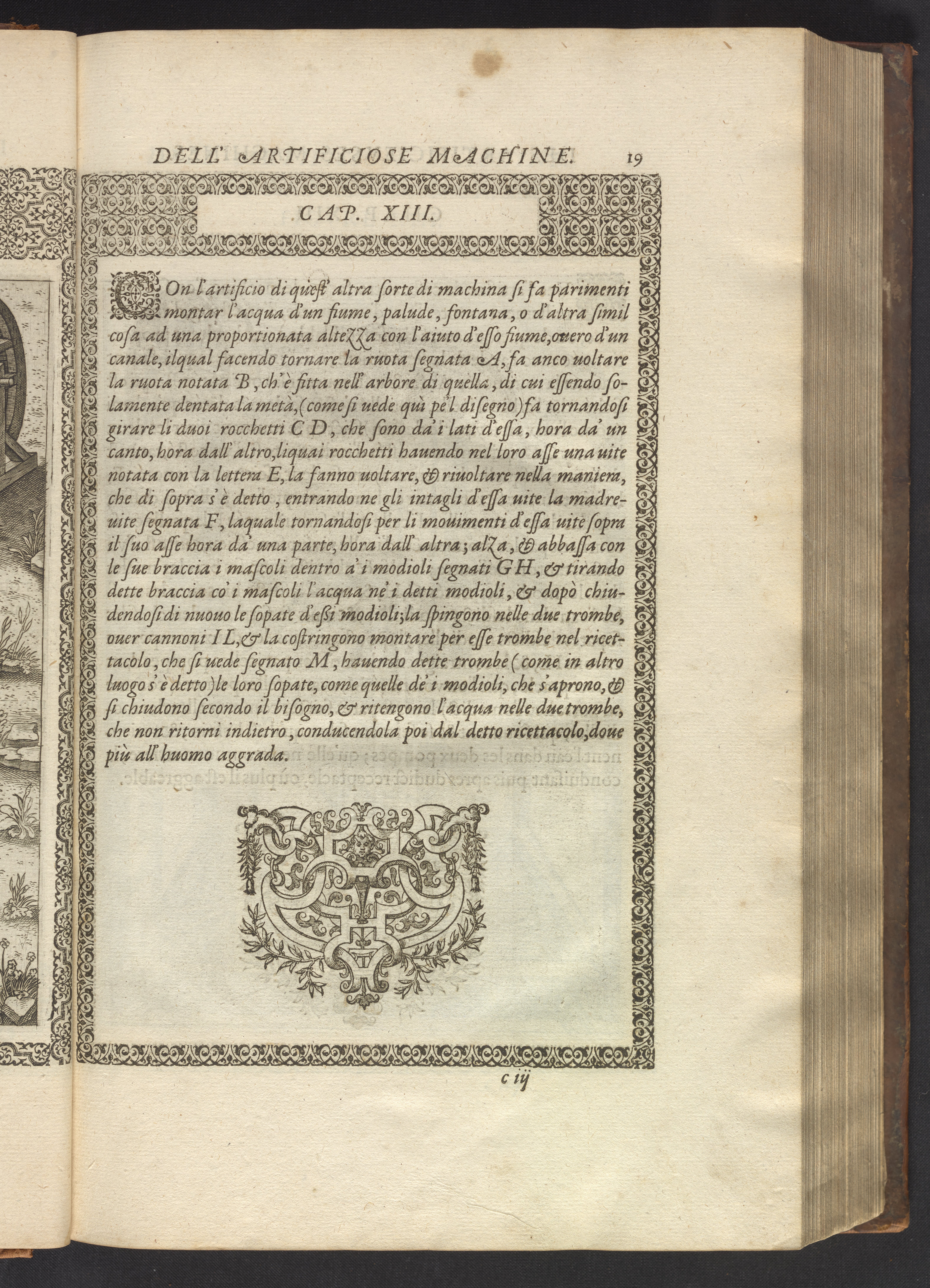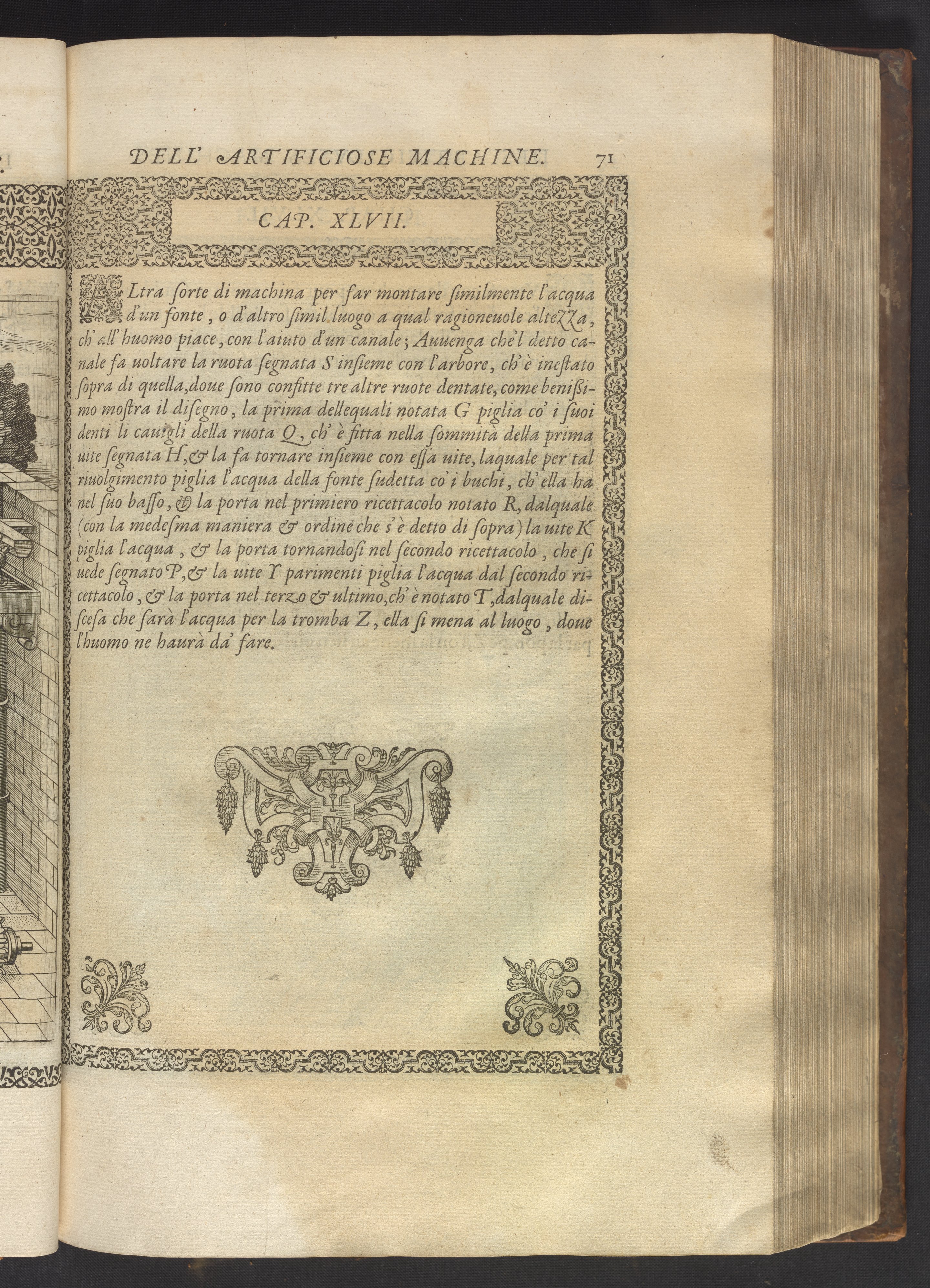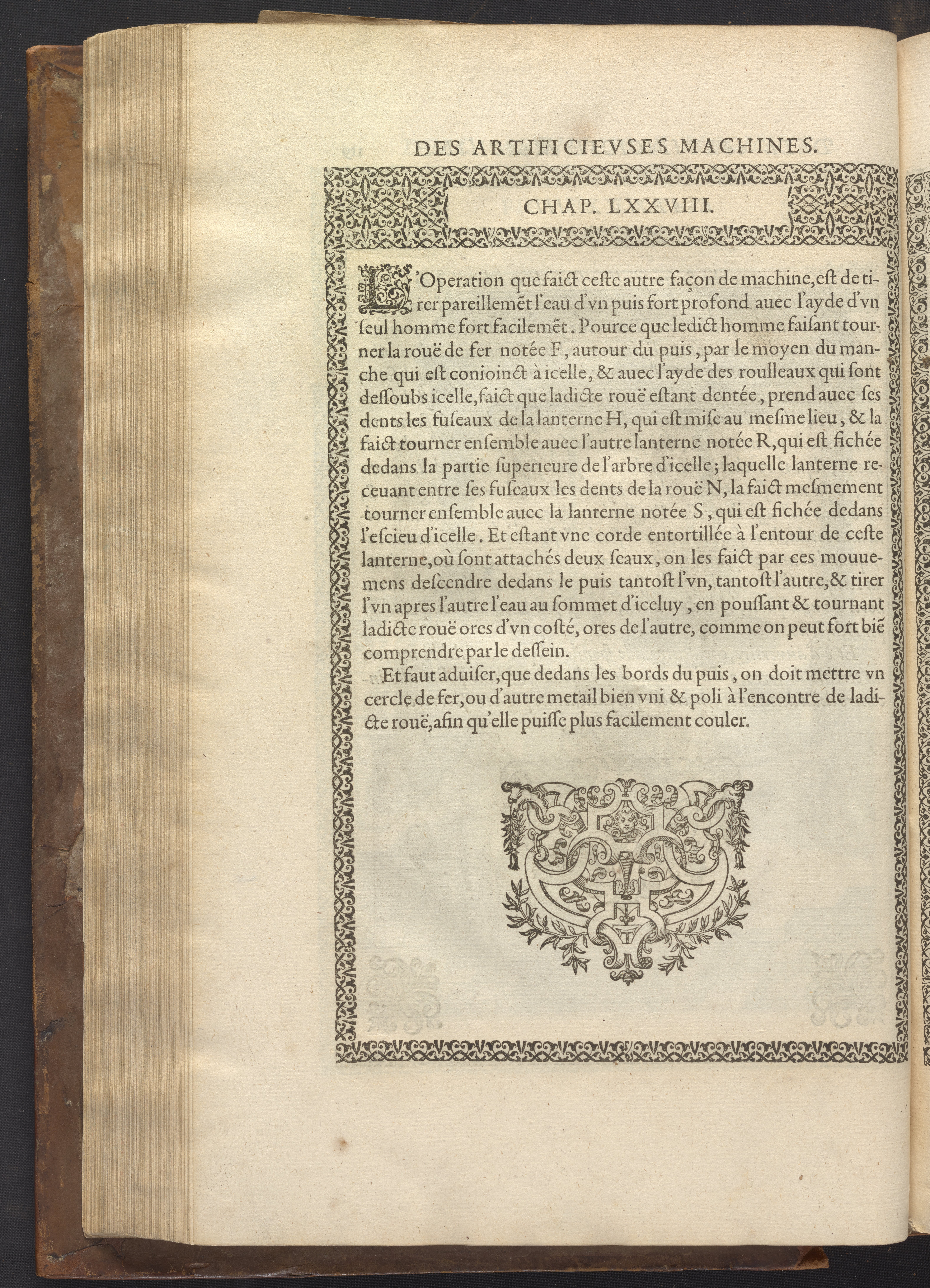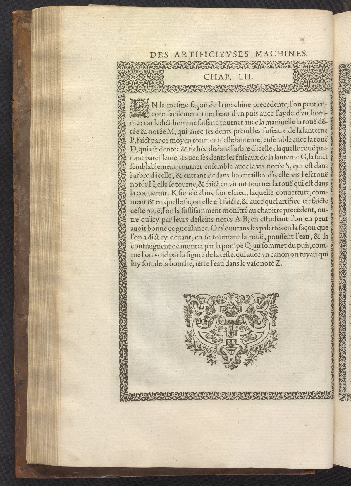 The book's engraved plates reveal the machines' inner workings through clever cut-away views into their casings. In some cases, key parts and tools are re-illustrated in the foreground for greater clarity. For the most part, the images prioritize the representation of the machine, with multiple viewpoints (eye-level, elevated, worms-eye) often conflated within a single depiction to better convey the mechanisms. Nevertheless, the plate designer was also interested in the artistic value of the plates. He created interesting surface patterns and satisfying compositions with a limited repertoire of landscape elements (e.g., stumps, turf, plants, and stones) and details of setting (e.g., brick and stonework). Additionally, conspicuous ornamental details reflect the contemporary vogue for antique motifs: machines are buttressed with strapwork volutes, while wells, fountains, spigots, and pitchers are embellished with grotesques, masks, putti, garlands, animals, and hybrid monsters.