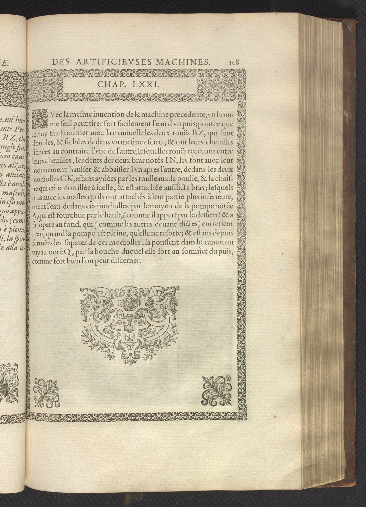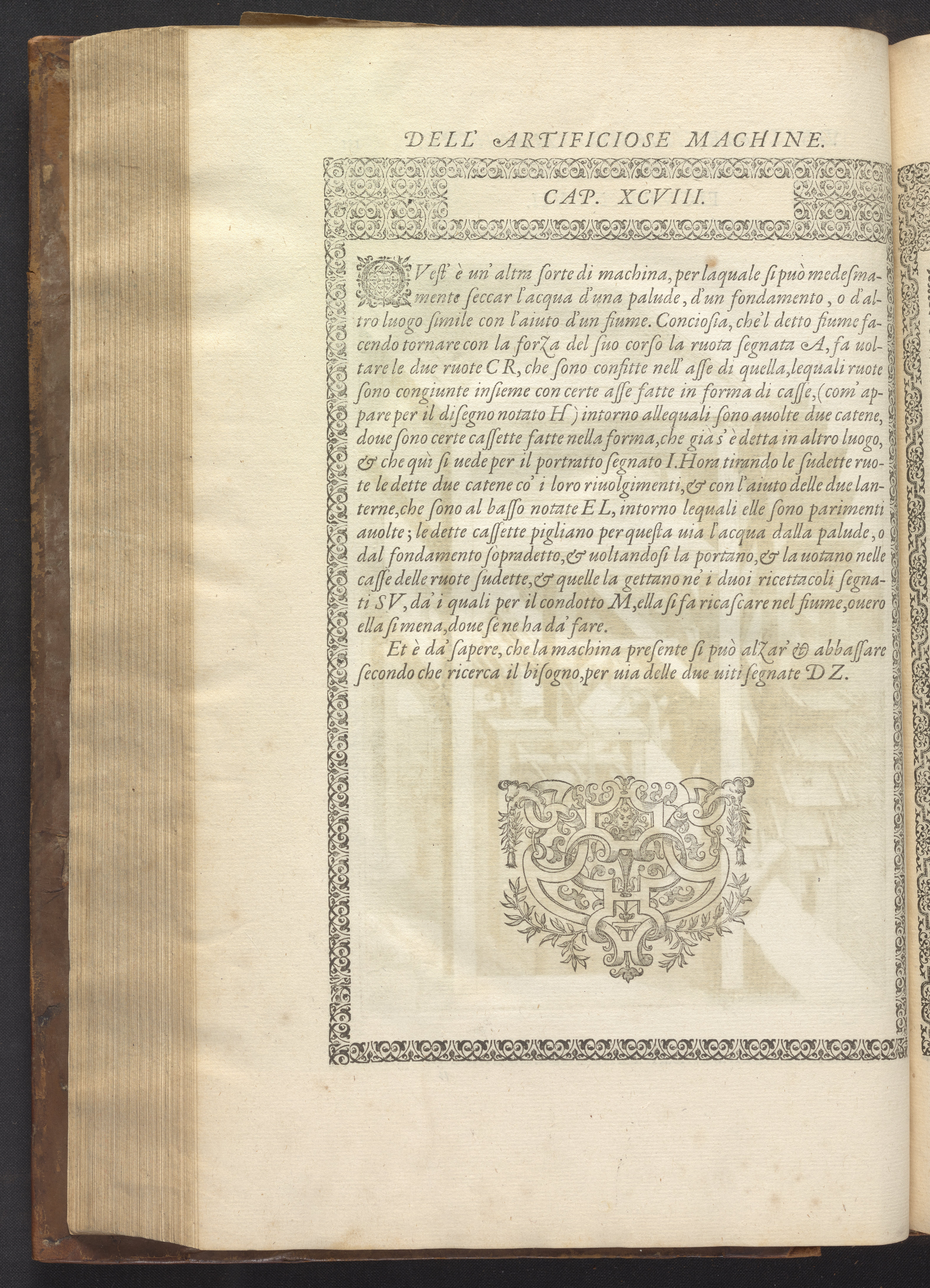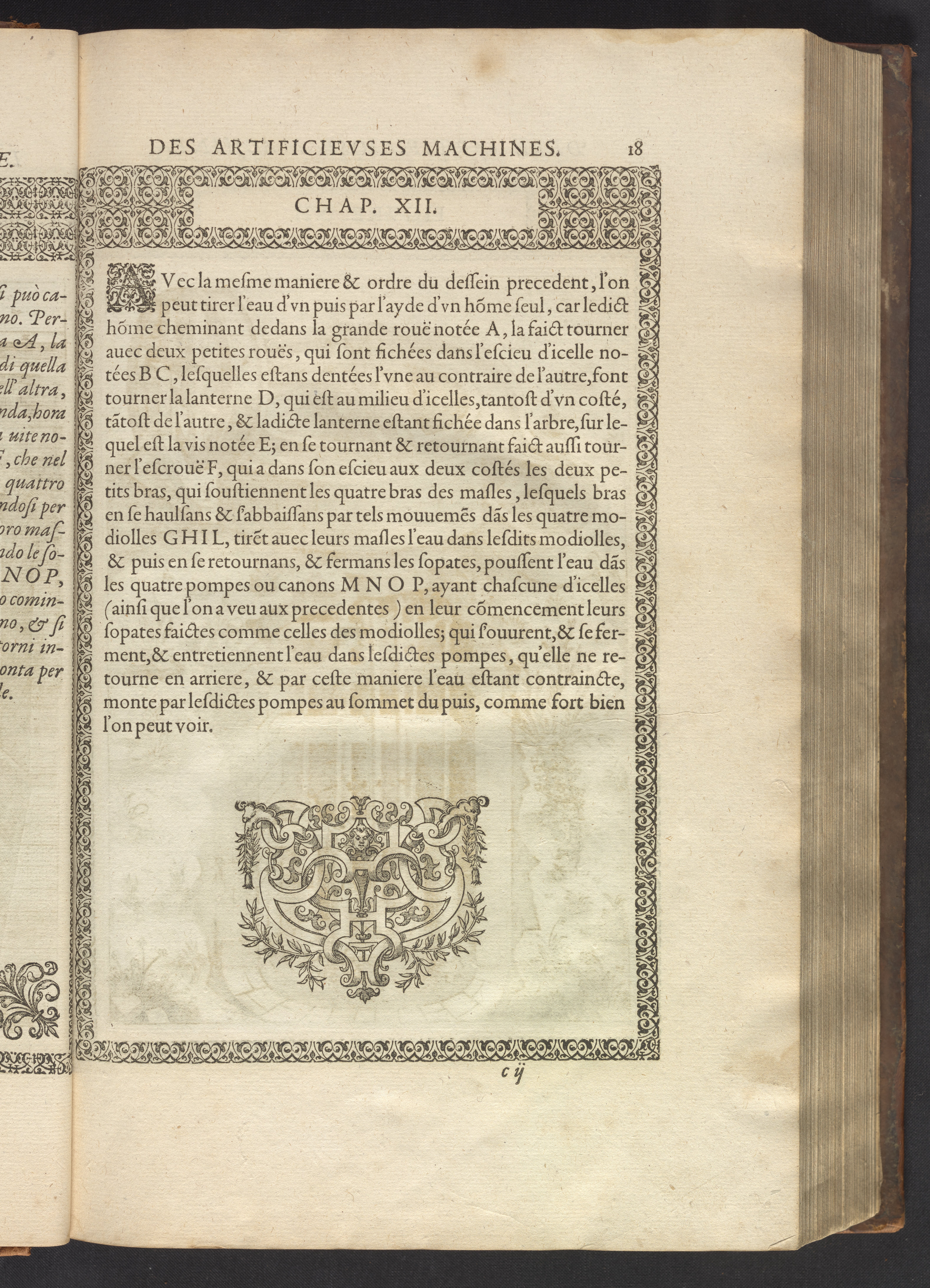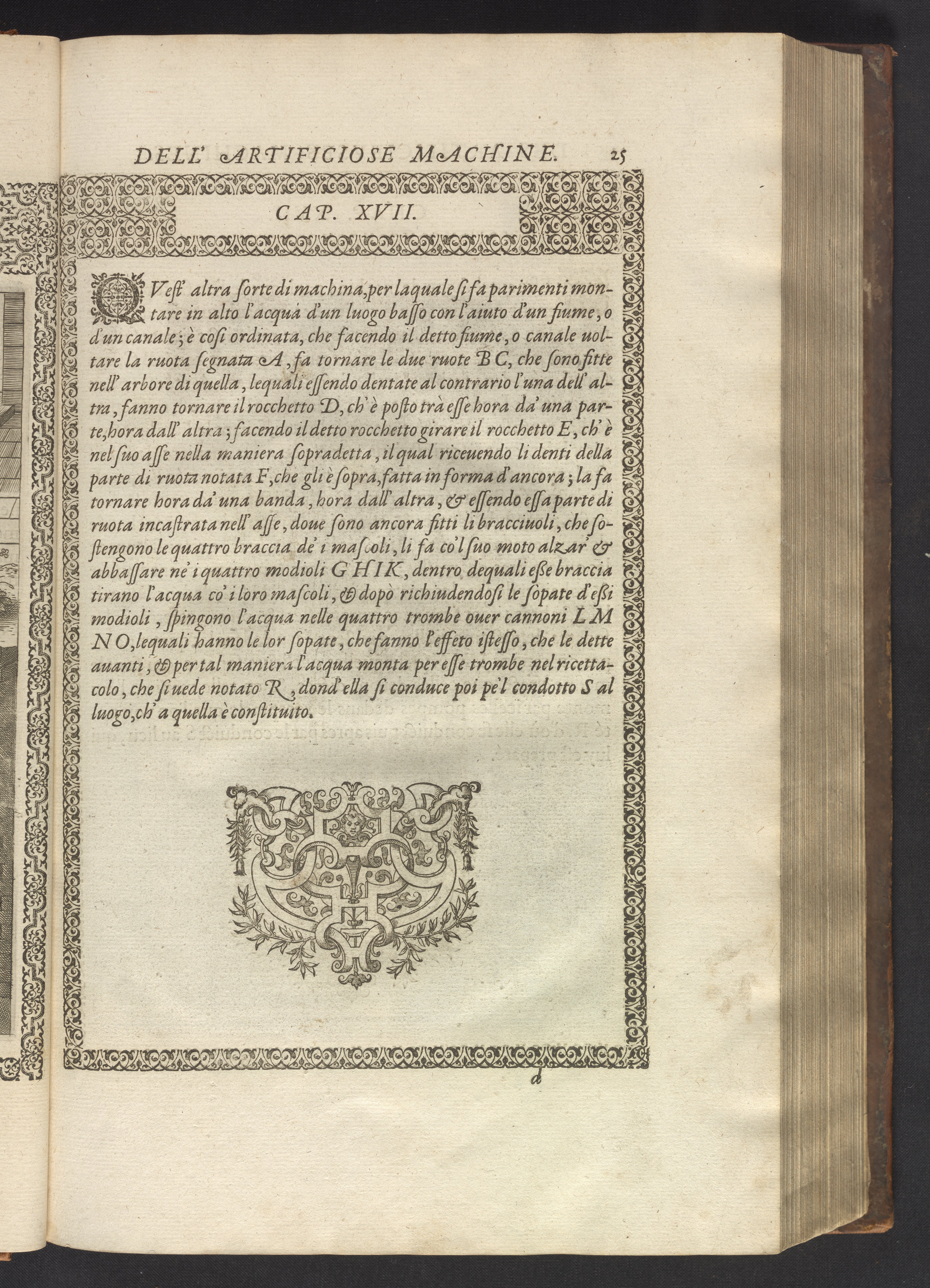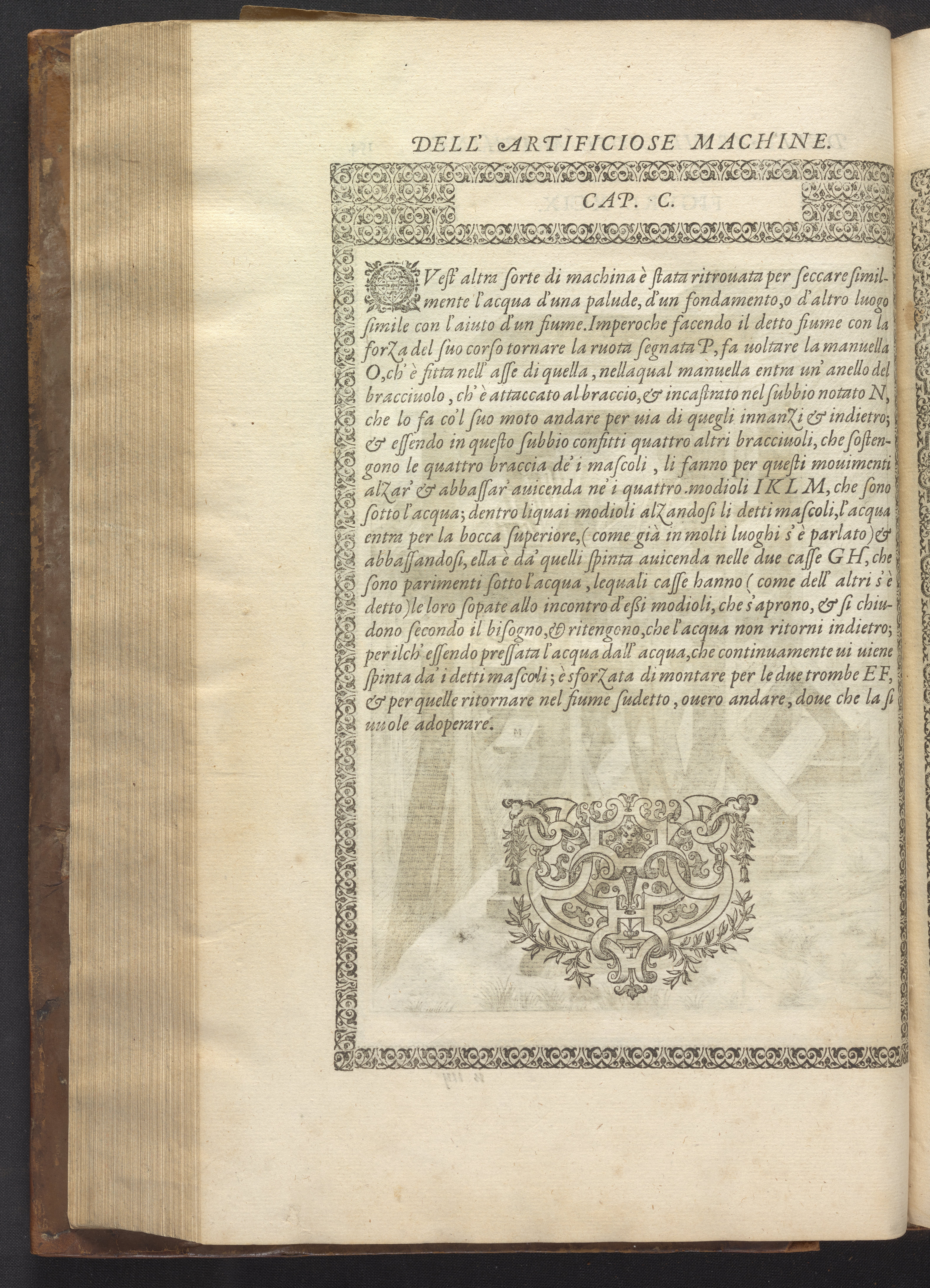 The book's engraved plates reveal the machines' inner workings through clever cut-away views into their casings. In some cases, key parts and tools are re-illustrated in the foreground for greater clarity. For the most part, the images prioritize the representation of the machine, with multiple viewpoints (eye-level, elevated, worms-eye) often conflated within a single depiction to better convey the mechanisms. Nevertheless, the plate designer was also interested in the artistic value of the plates. He created interesting surface patterns and satisfying compositions with a limited repertoire of landscape elements (e.g., stumps, turf, plants, and stones) and details of setting (e.g., brick and stonework). Additionally, conspicuous ornamental details reflect the contemporary vogue for antique motifs: machines are buttressed with strapwork volutes, while wells, fountains, spigots, and pitchers are embellished with grotesques, masks, putti, garlands, animals, and hybrid monsters.