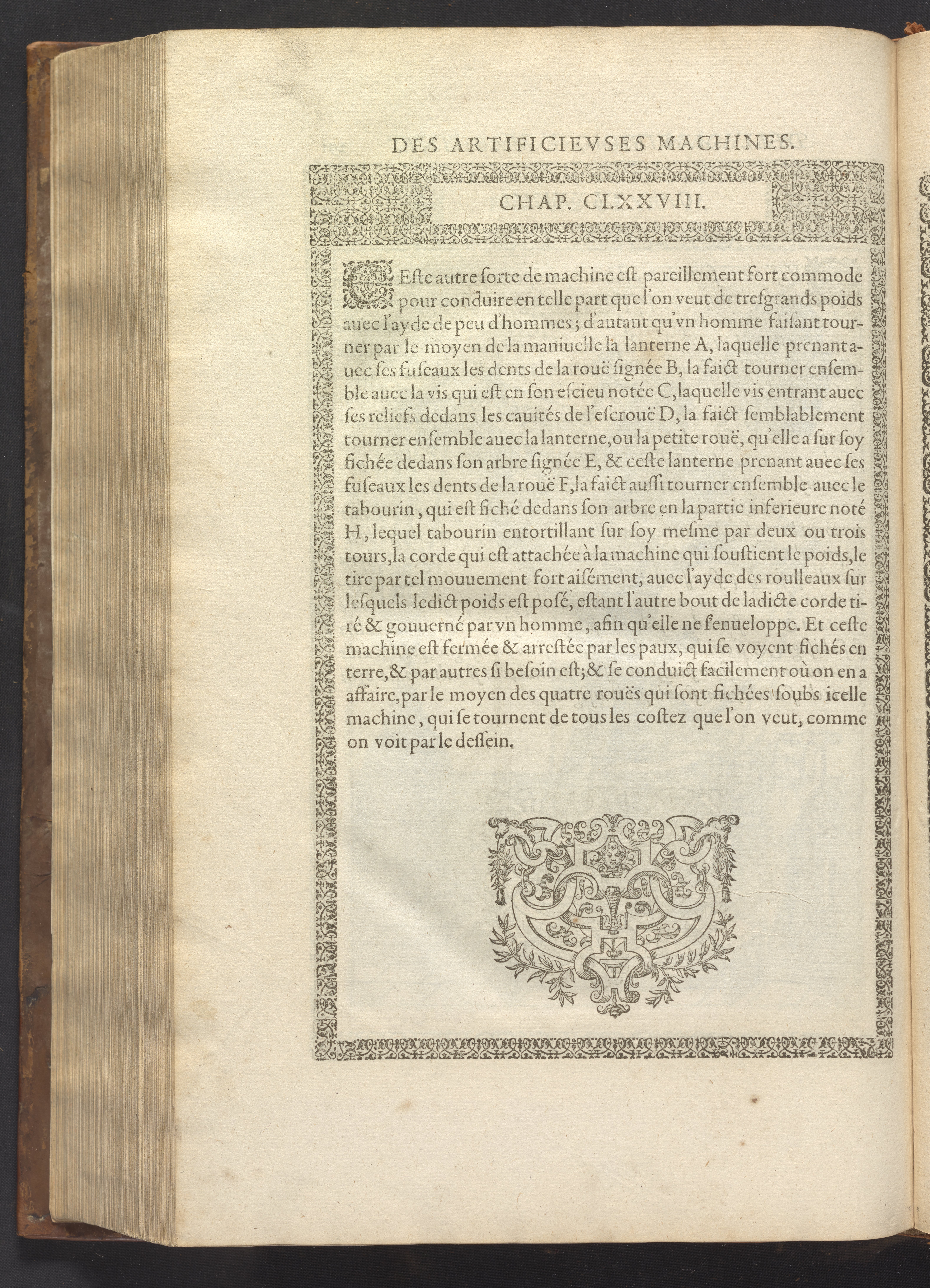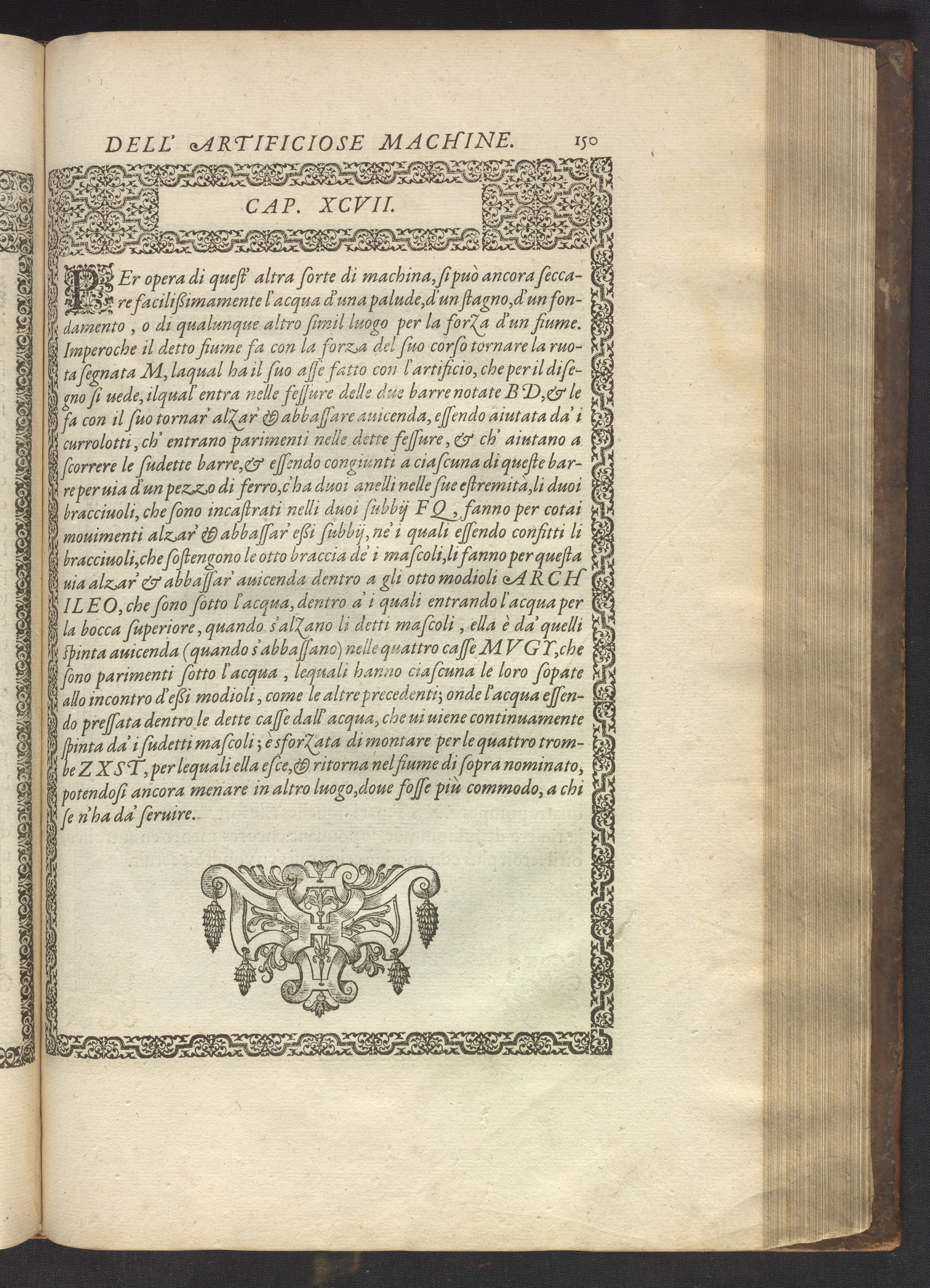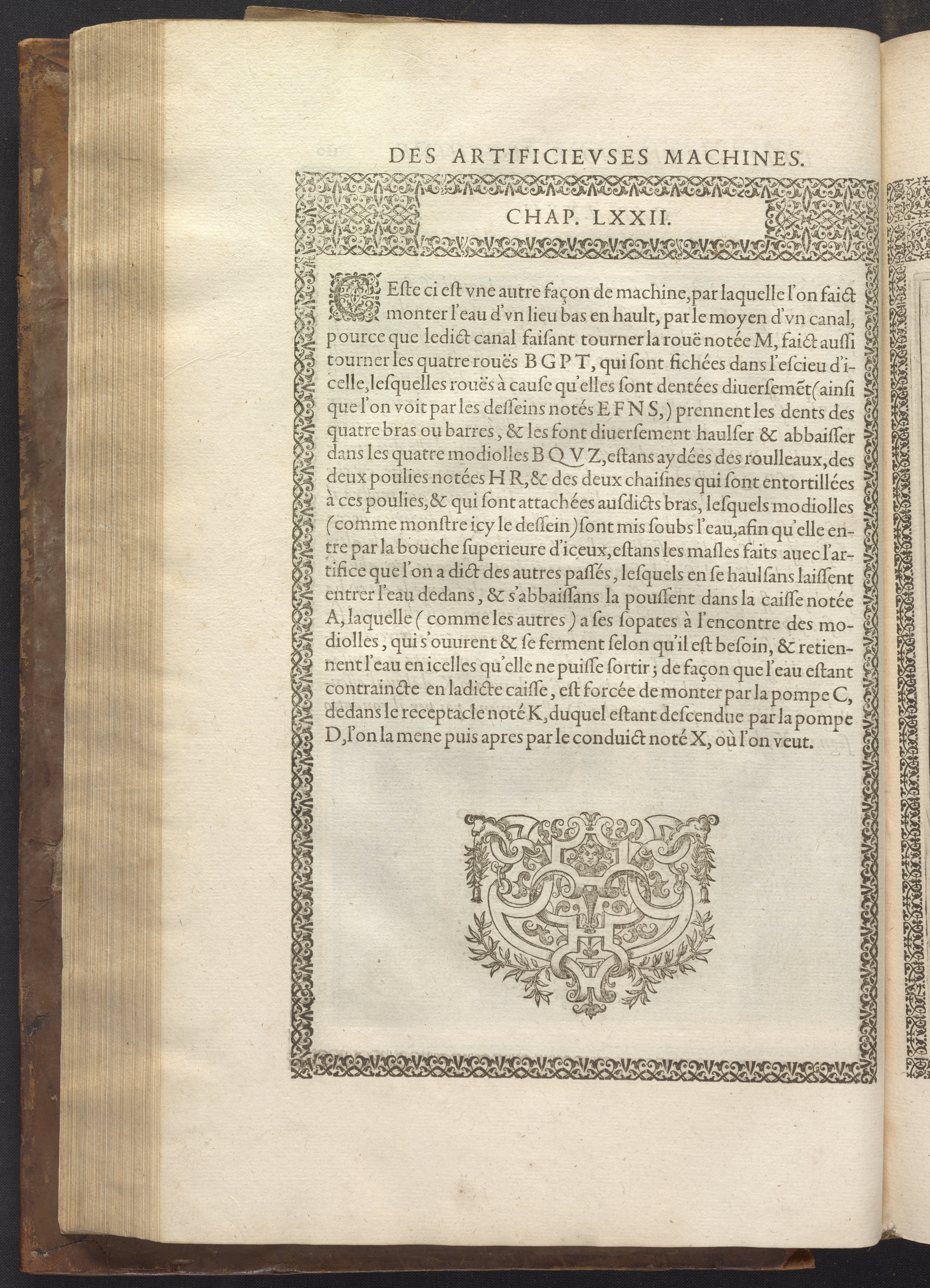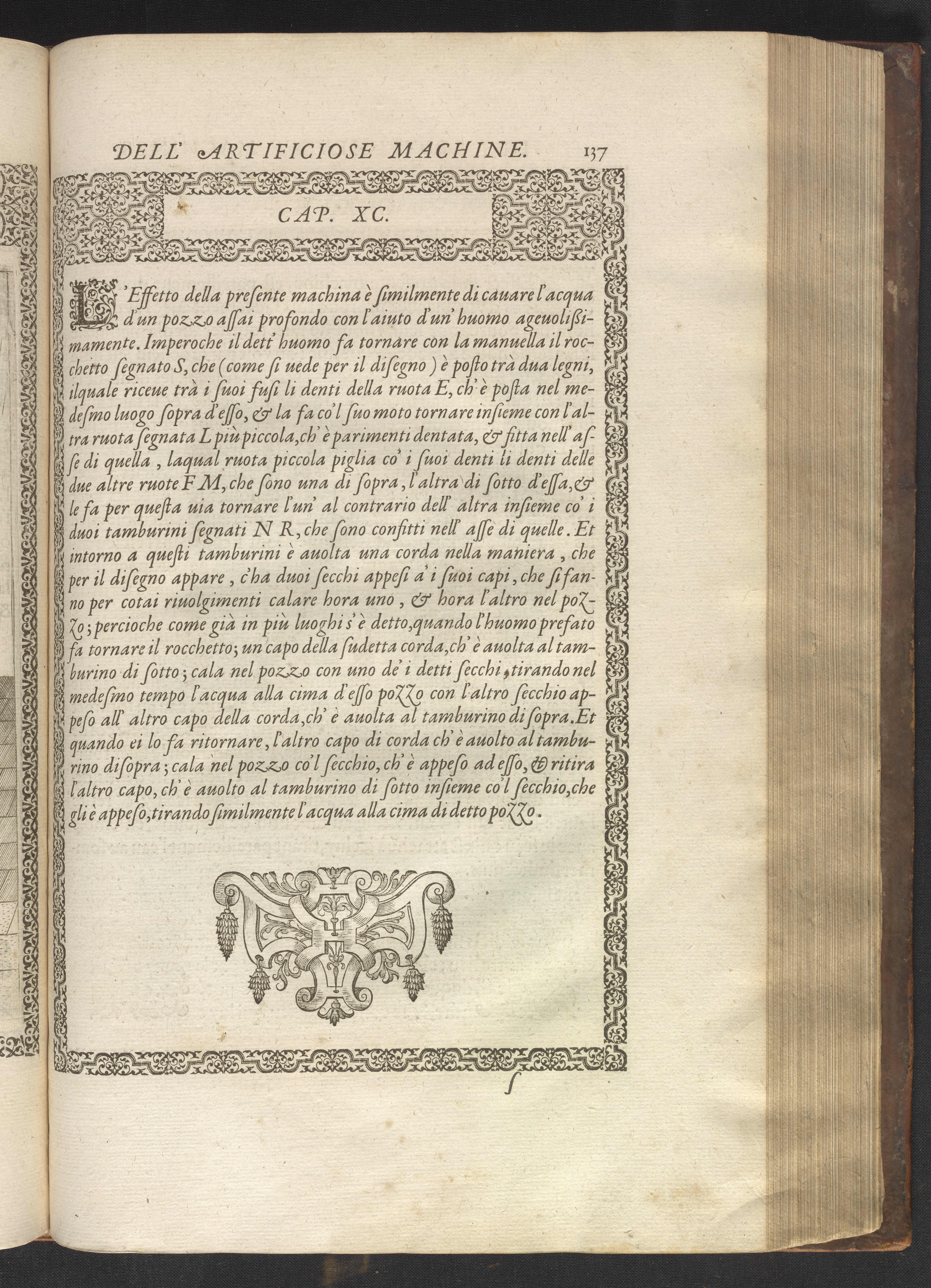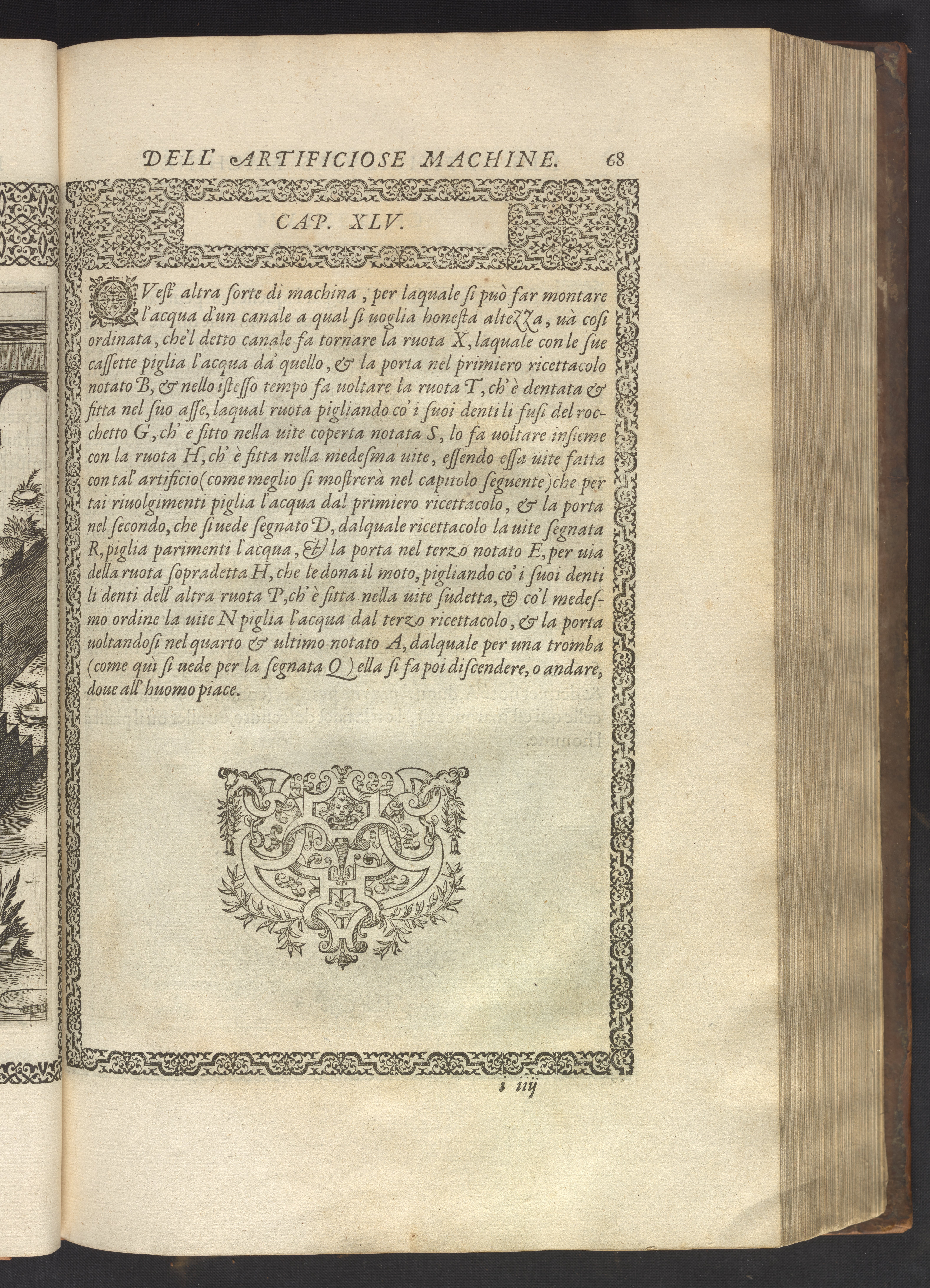 The book's engraved plates reveal the machines' inner workings through clever cut-away views into their casings. In some cases, key parts and tools are re-illustrated in the foreground for greater clarity. For the most part, the images prioritize the representation of the machine, with multiple viewpoints (eye-level, elevated, worms-eye) often conflated within a single depiction to better convey the mechanisms. Nevertheless, the plate designer was also interested in the artistic value of the plates. He created interesting surface patterns and satisfying compositions with a limited repertoire of landscape elements (e.g., stumps, turf, plants, and stones) and details of setting (e.g., brick and stonework). Additionally, conspicuous ornamental details reflect the contemporary vogue for antique motifs: machines are buttressed with strapwork volutes, while wells, fountains, spigots, and pitchers are embellished with grotesques, masks, putti, garlands, animals, and hybrid monsters.
