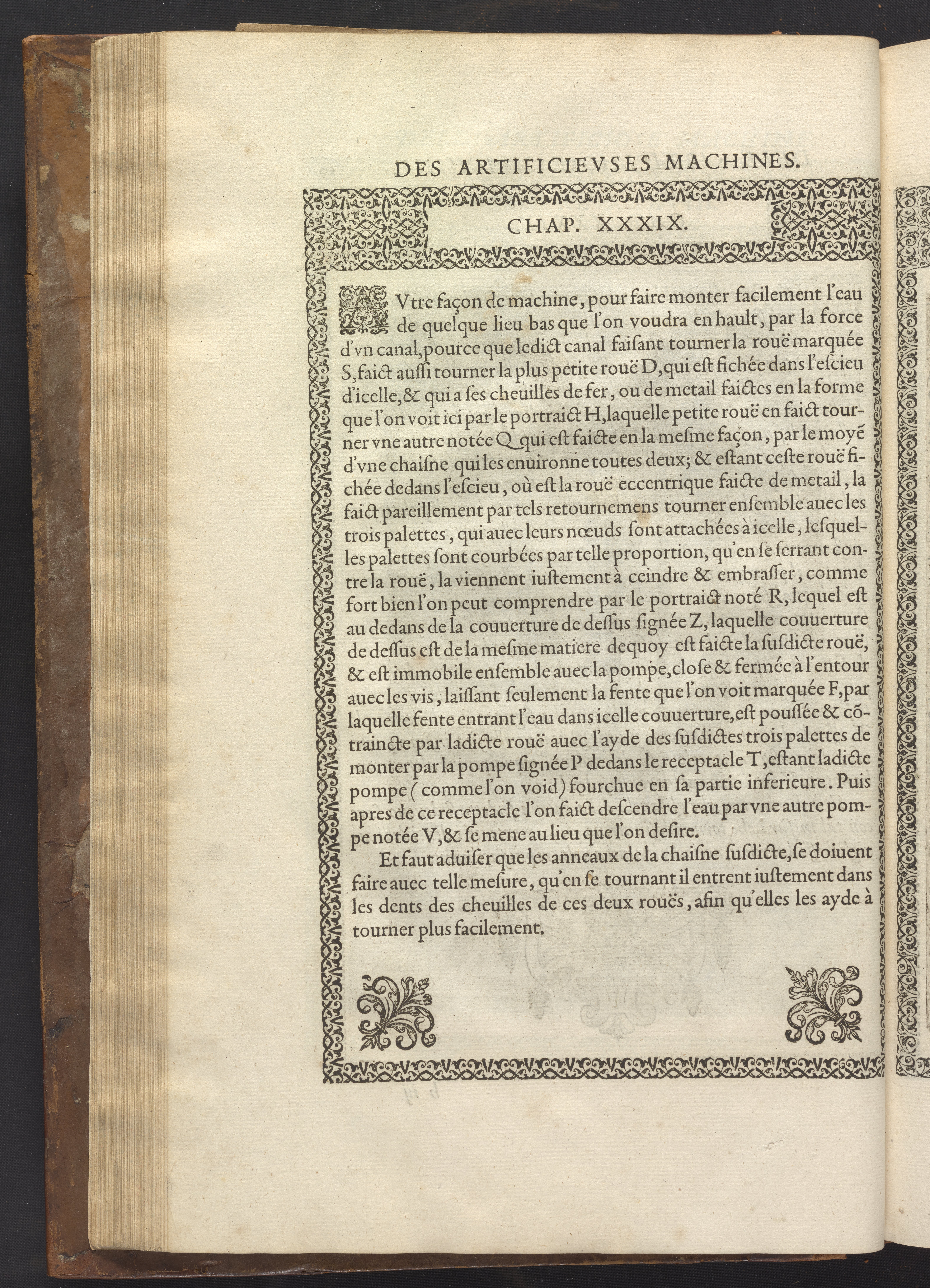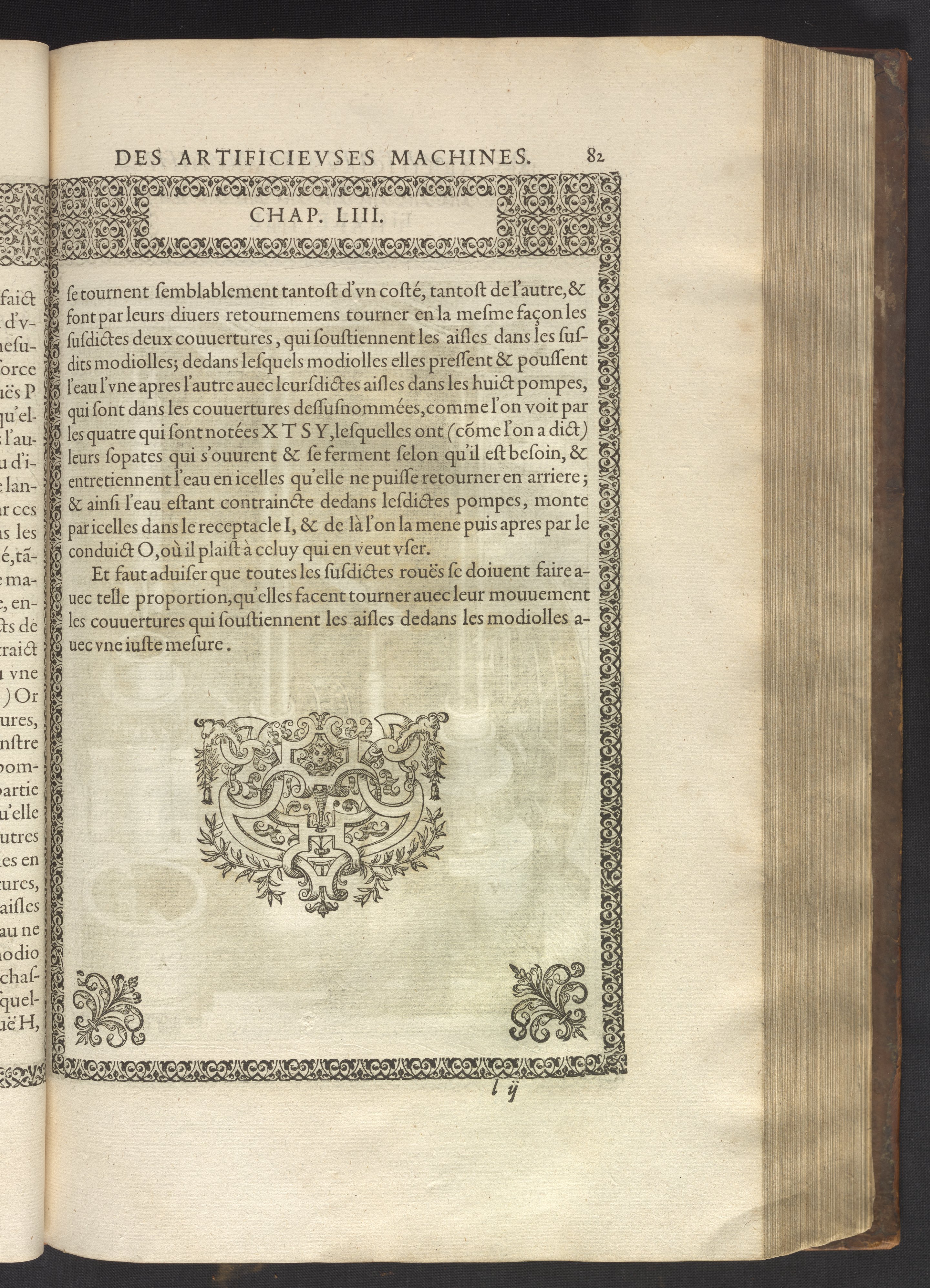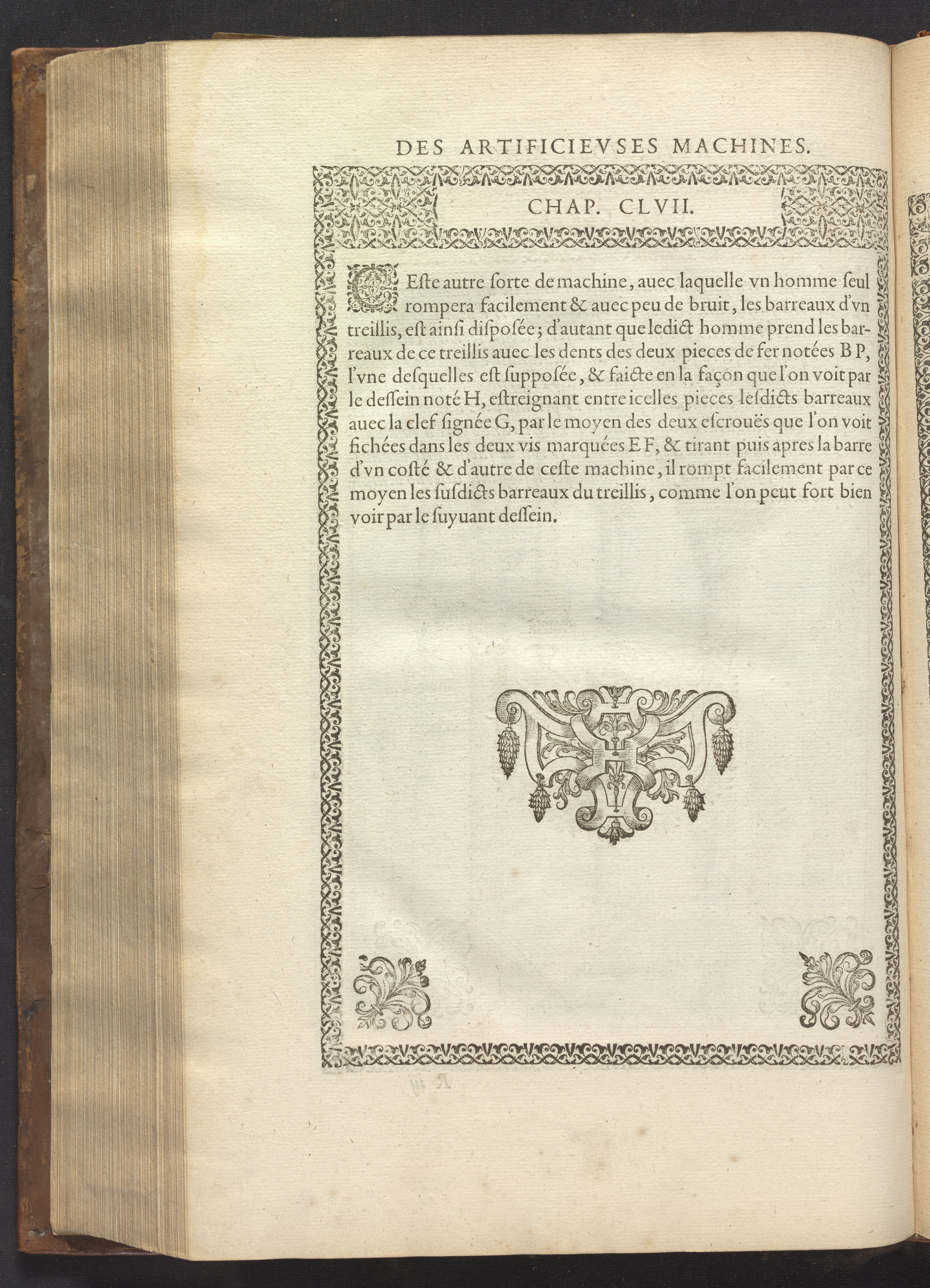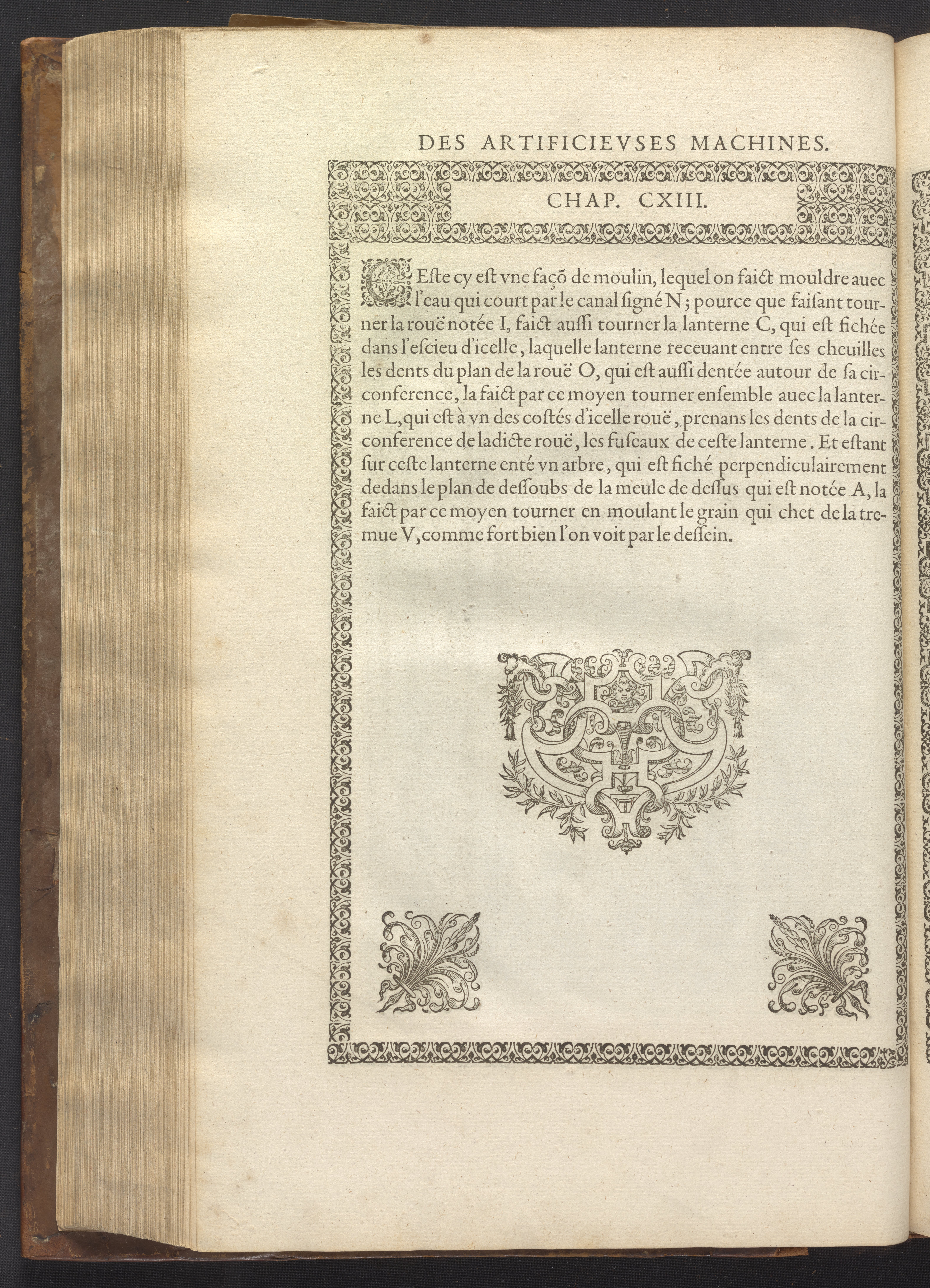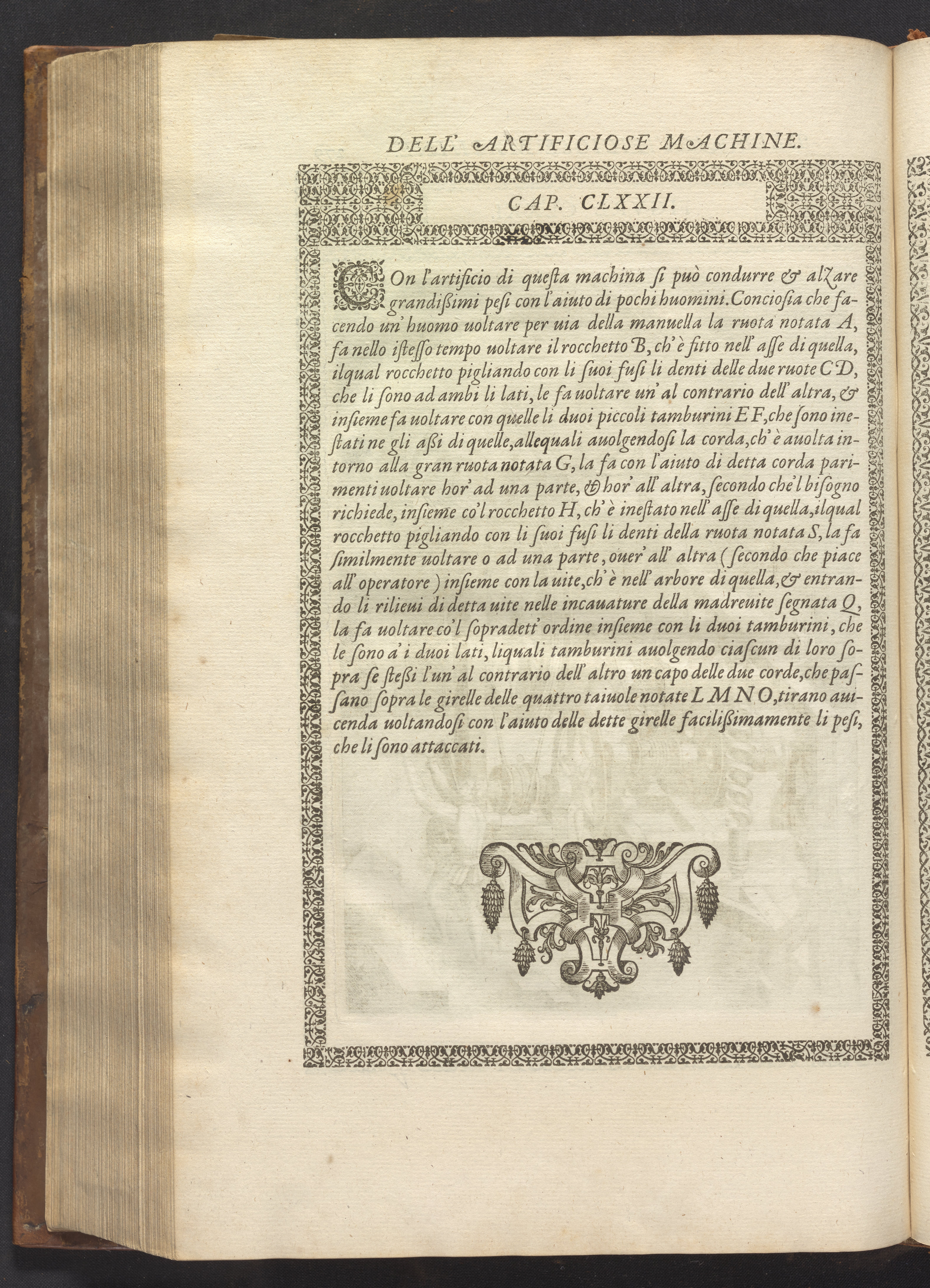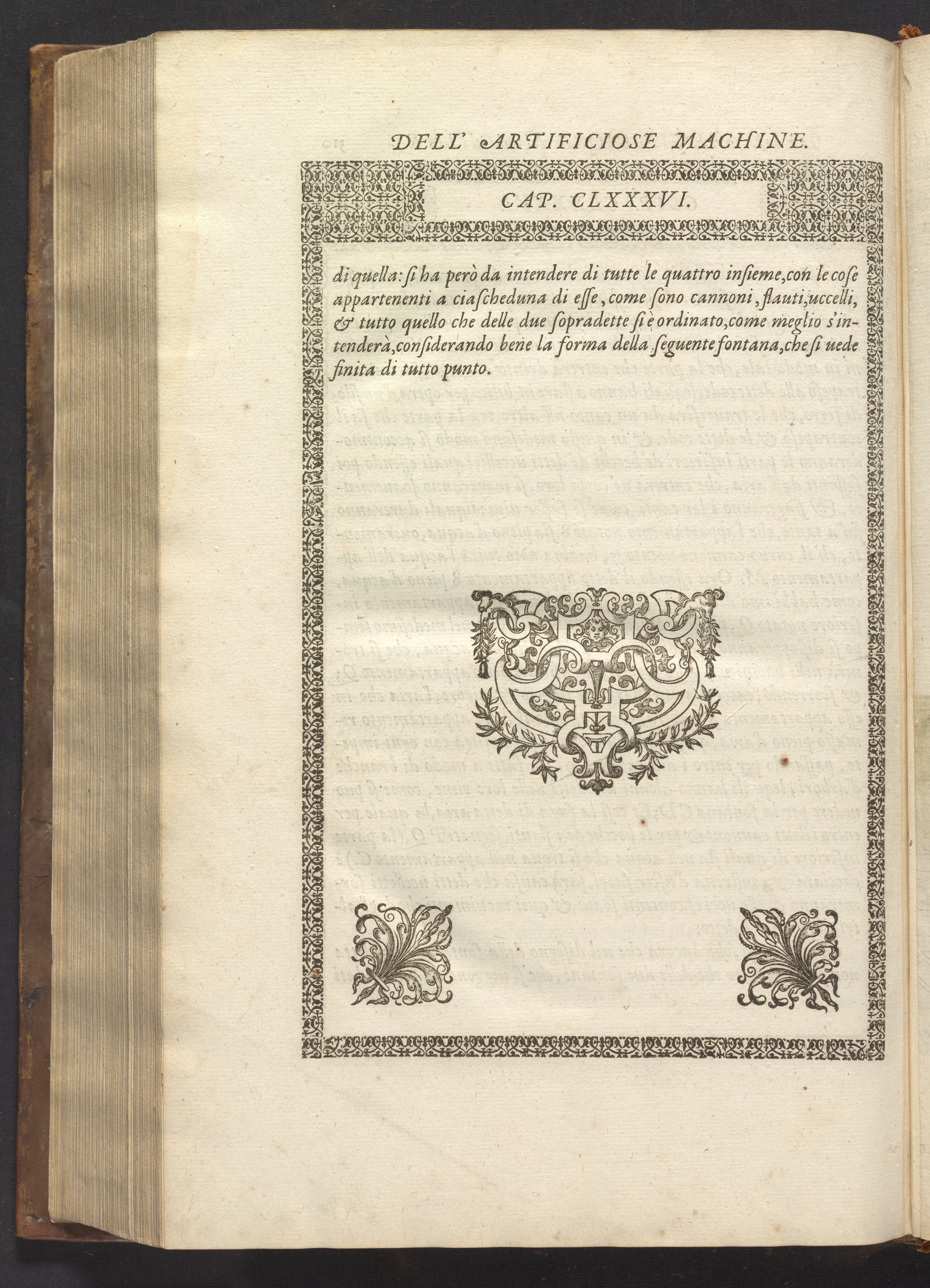 The book's engraved plates reveal the machines' inner workings through clever cut-away views into their casings. In some cases, key parts and tools are re-illustrated in the foreground for greater clarity. For the most part, the images prioritize the representation of the machine, with multiple viewpoints (eye-level, elevated, worms-eye) often conflated within a single depiction to better convey the mechanisms. Nevertheless, the plate designer was also interested in the artistic value of the plates. He created interesting surface patterns and satisfying compositions with a limited repertoire of landscape elements (e.g., stumps, turf, plants, and stones) and details of setting (e.g., brick and stonework). Additionally, conspicuous ornamental details reflect the contemporary vogue for antique motifs: machines are buttressed with strapwork volutes, while wells, fountains, spigots, and pitchers are embellished with grotesques, masks, putti, garlands, animals, and hybrid monsters.