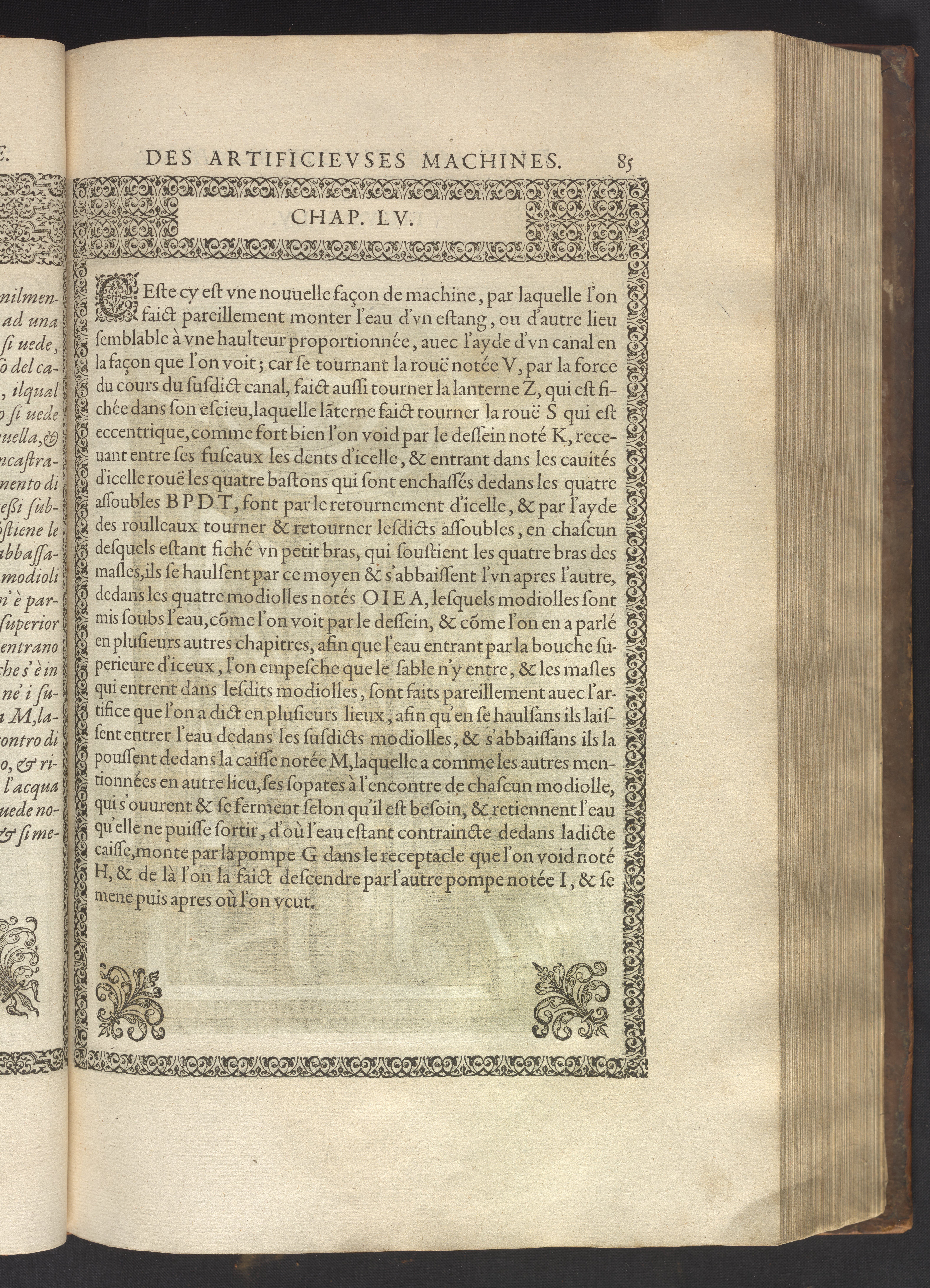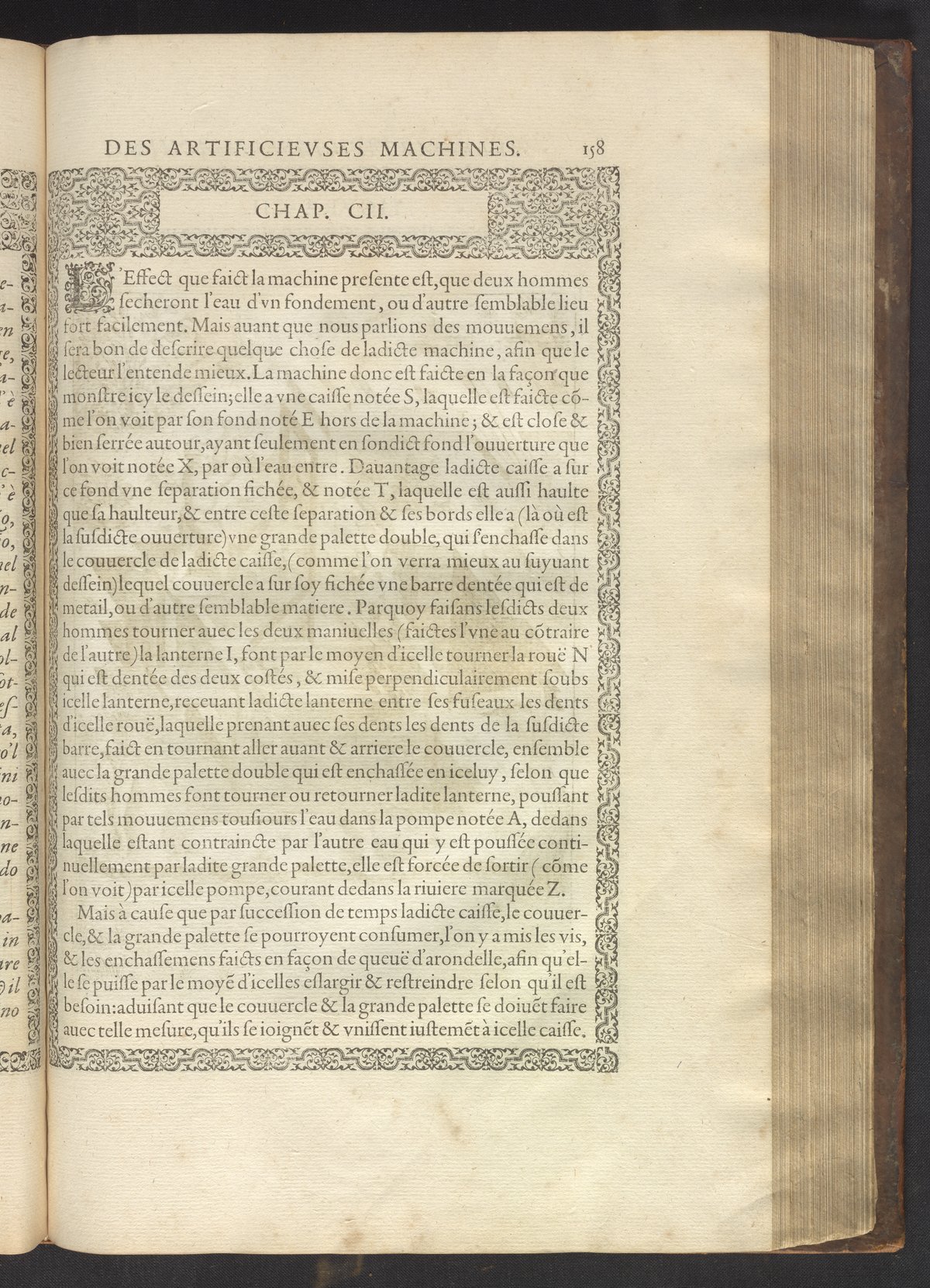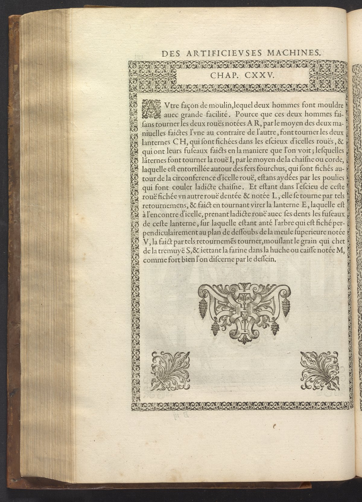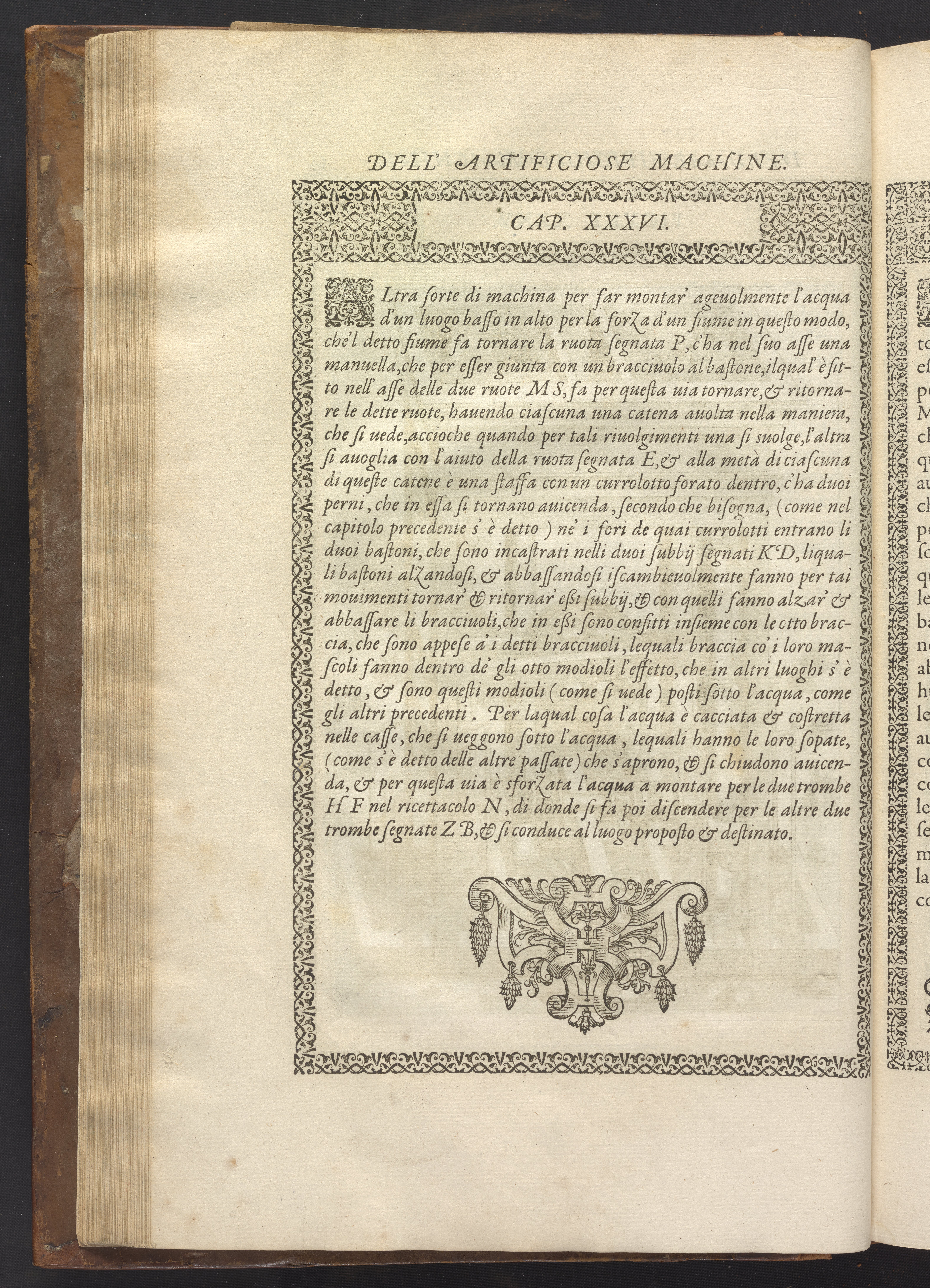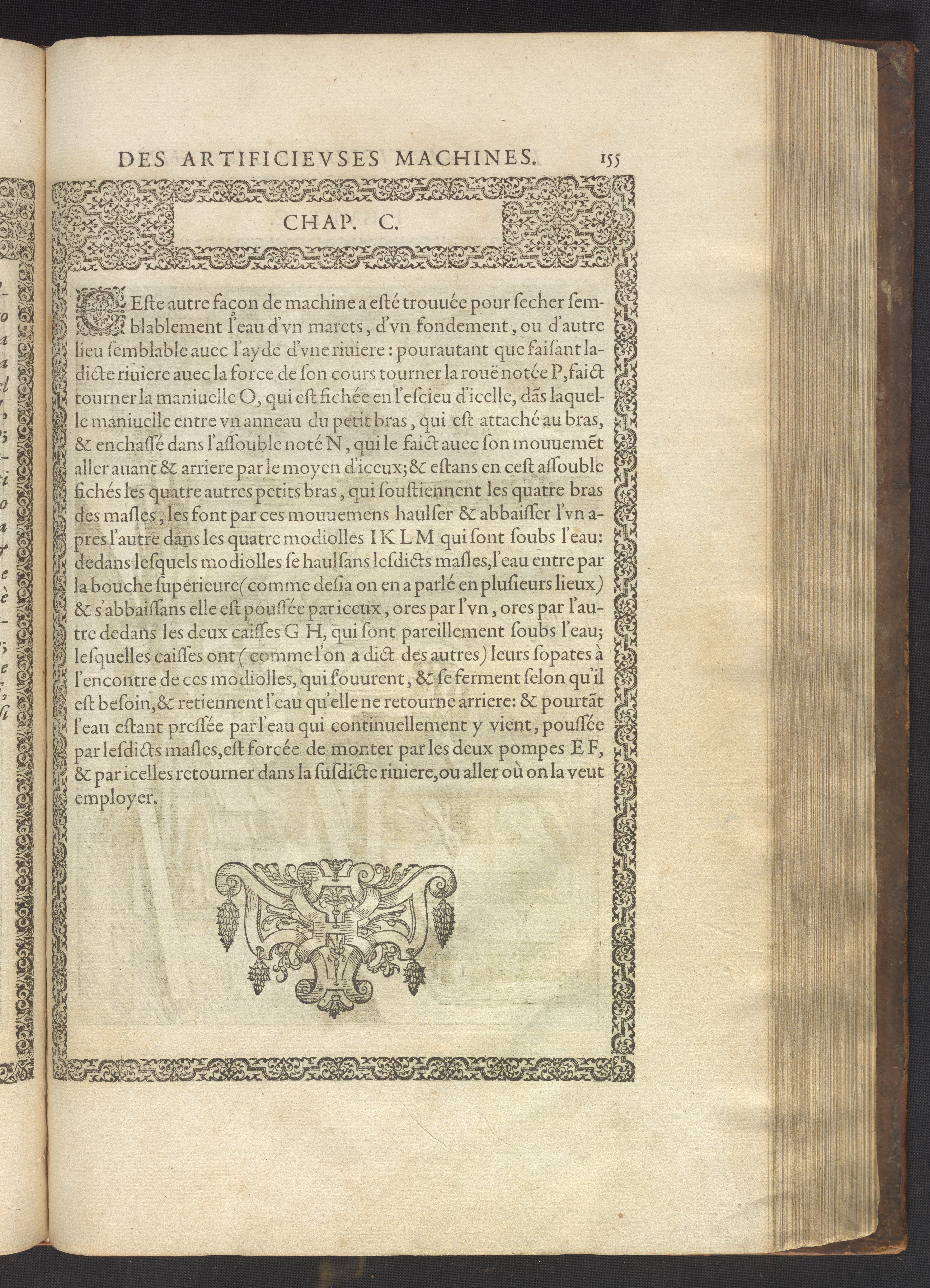 The book's engraved plates reveal the machines' inner workings through clever cut-away views into their casings. In some cases, key parts and tools are re-illustrated in the foreground for greater clarity. For the most part, the images prioritize the representation of the machine, with multiple viewpoints (eye-level, elevated, worms-eye) often conflated within a single depiction to better convey the mechanisms. Nevertheless, the plate designer was also interested in the artistic value of the plates. He created interesting surface patterns and satisfying compositions with a limited repertoire of landscape elements (e.g., stumps, turf, plants, and stones) and details of setting (e.g., brick and stonework). Additionally, conspicuous ornamental details reflect the contemporary vogue for antique motifs: machines are buttressed with strapwork volutes, while wells, fountains, spigots, and pitchers are embellished with grotesques, masks, putti, garlands, animals, and hybrid monsters.