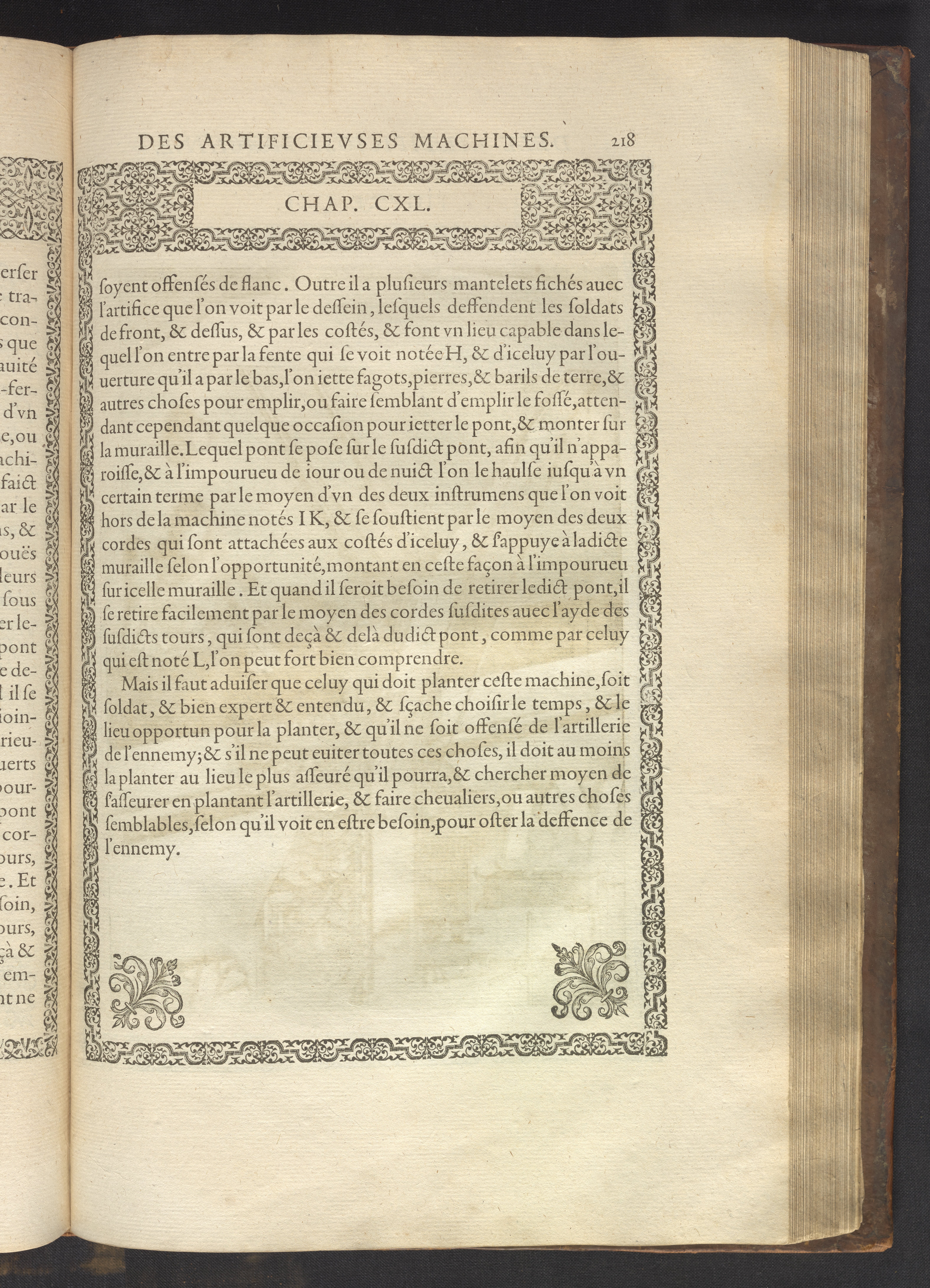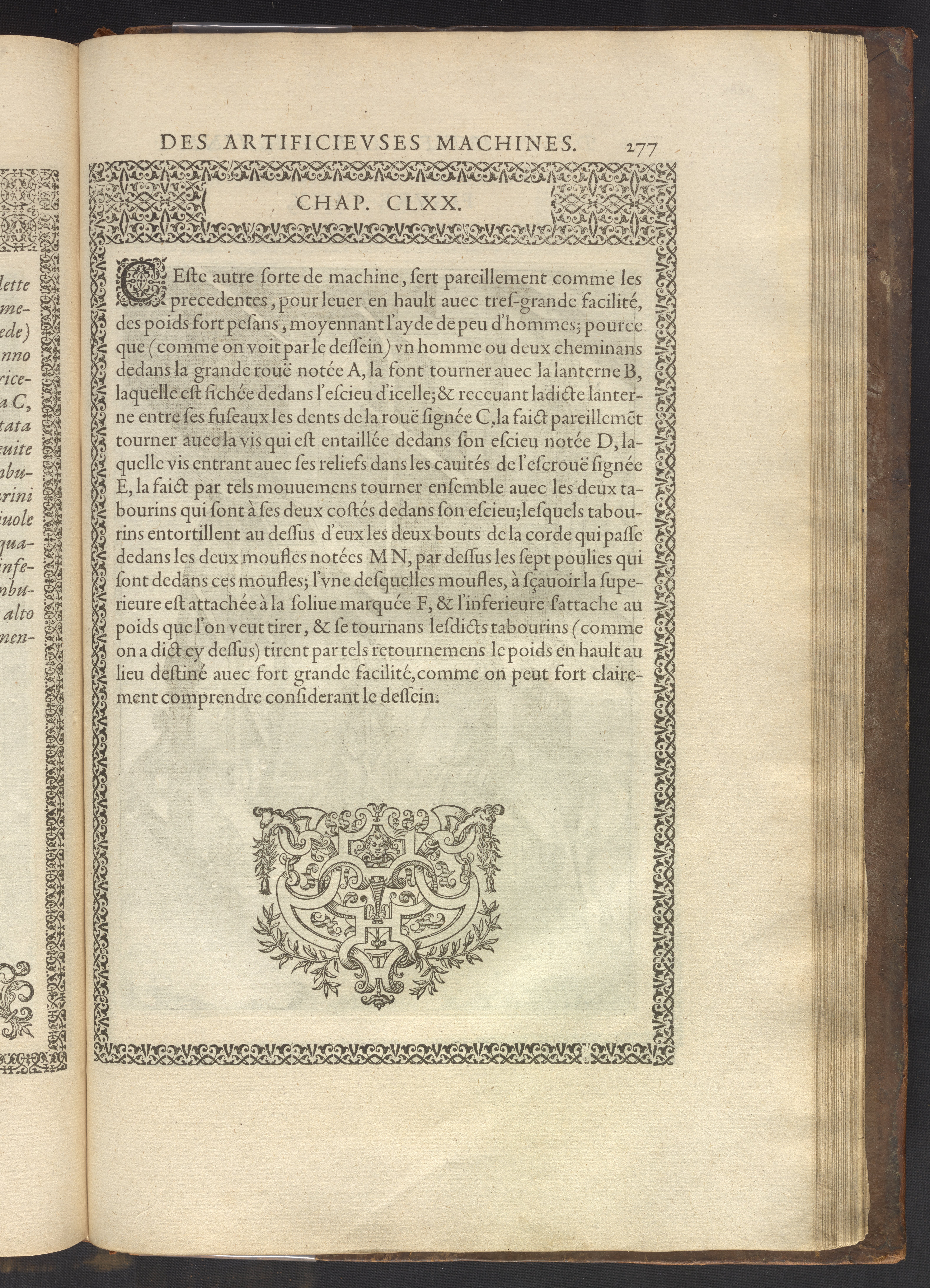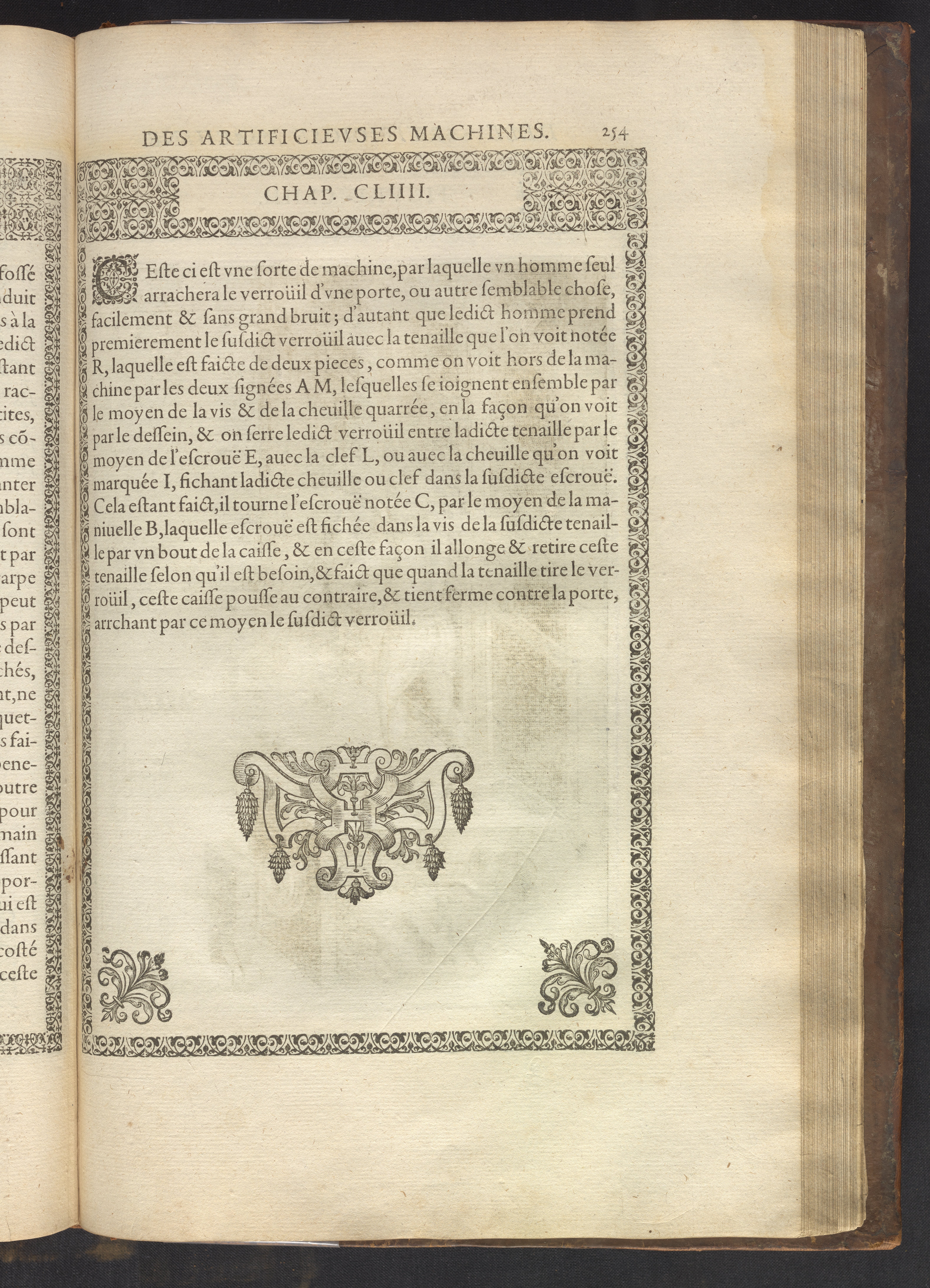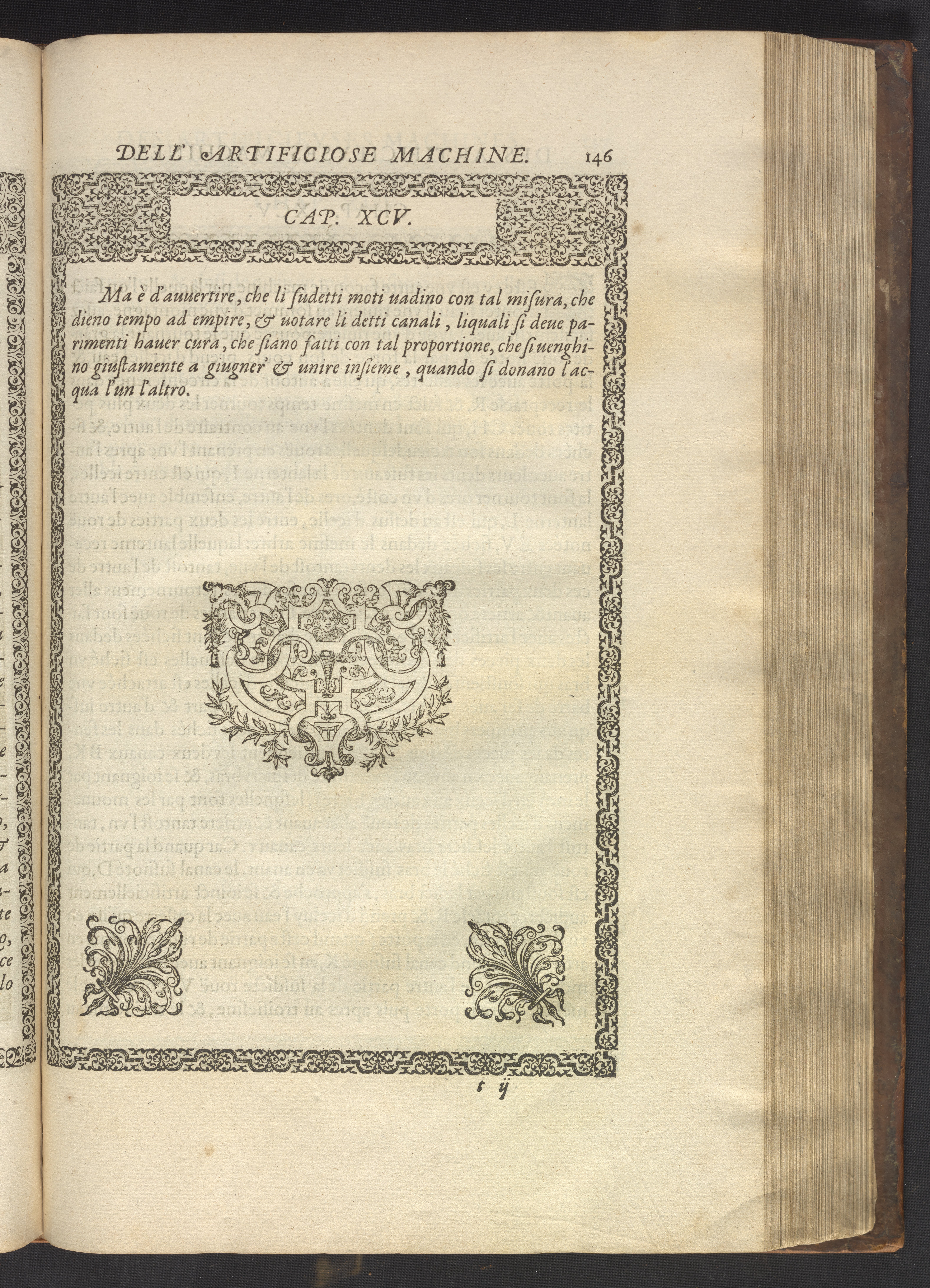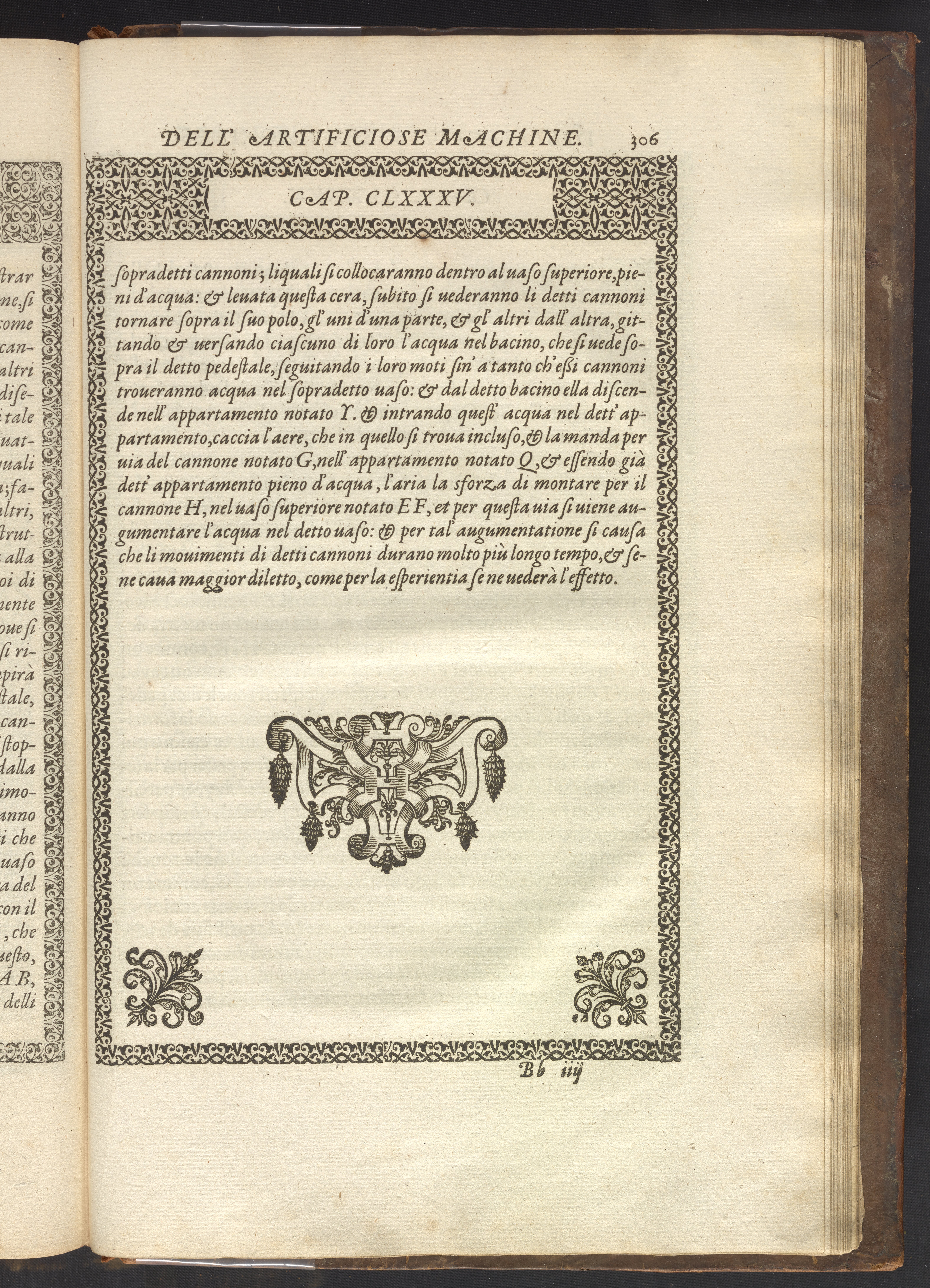The book's engraved plates reveal the machines' inner workings through clever cut-away views into their casings. In some cases, key parts and tools are re-illustrated in the foreground for greater clarity. For the most part, the images prioritize the representation of the machine, with multiple viewpoints (eye-level, elevated, worms-eye) often conflated within a single depiction to better convey the mechanisms. Nevertheless, the plate designer was also interested in the artistic value of the plates. He created interesting surface patterns and satisfying compositions with a limited repertoire of landscape elements (e.g., stumps, turf, plants, and stones) and details of setting (e.g., brick and stonework). Additionally, conspicuous ornamental details reflect the contemporary vogue for antique motifs: machines are buttressed with strapwork volutes, while wells, fountains, spigots, and pitchers are embellished with grotesques, masks, putti, garlands, animals, and hybrid monsters.