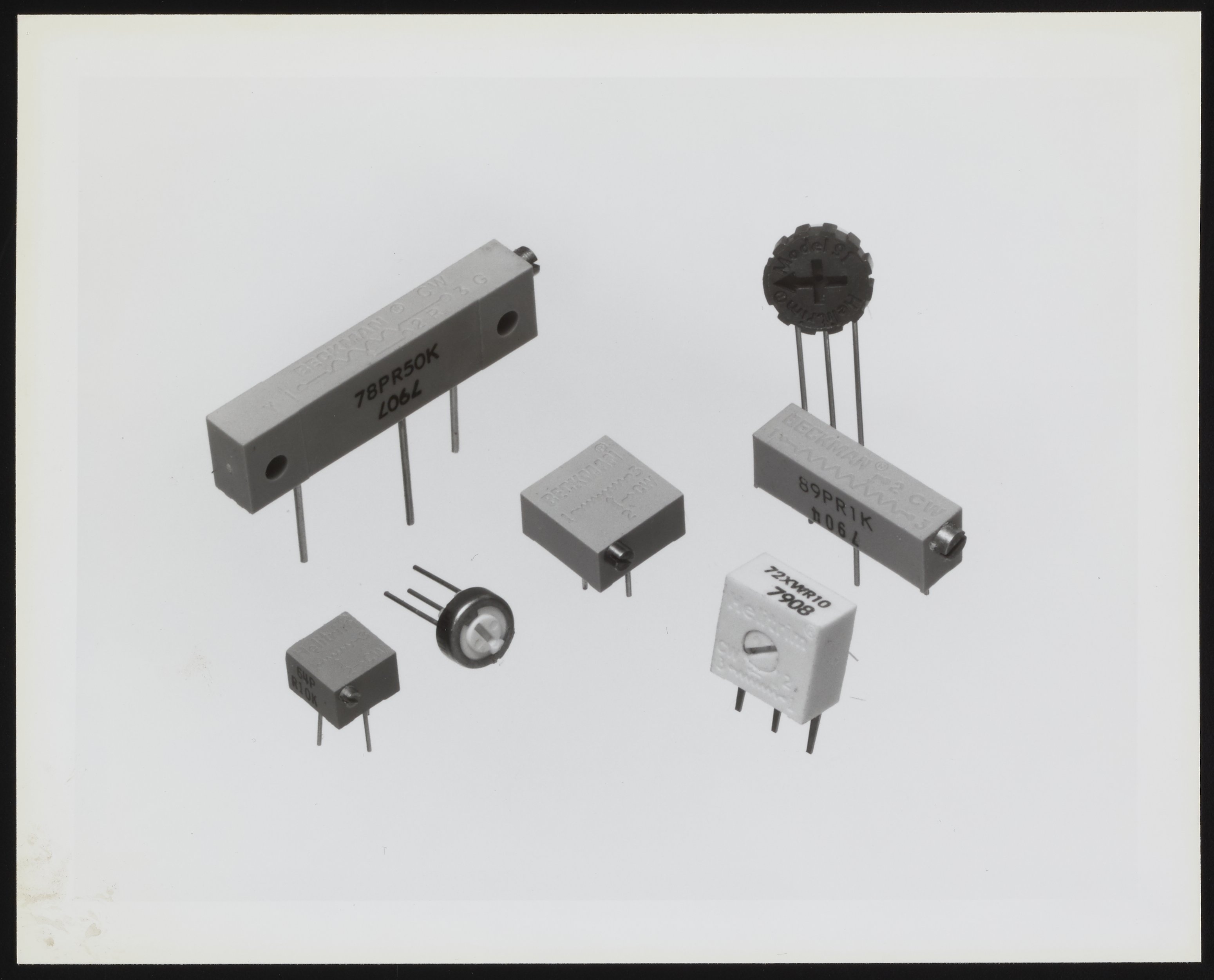 Small JPG1200 x 964px — 180 KBLarge JPG2880 x 2313px — 700 KBFull-sized JPG3110 x 2498px — 790 KBOriginal fileTIFF — 3110 x 2498px — 22.3 MBPotentiometers regulate the flow of electricity, like the volume dial on a radio. In 1940, Arnold O. Beckman was unsatisfied with dials on the market, so he designed his own helical potentiometers, or helipots, for use in his popular pH meter. The precision of this dial caught the eye of the MIT Radiation Laboratory’s secret radar project during World War II. Beckman redesigned the helipot to meet the needs of the United States military and set up a separate company, also called Helipot, to keep up with the demand for these knobs. In the 1950s, Helipot was reincorporated into Beckman Instruments as the Helipot Division and continued to make potentiometers and other electrical components for decades, those tiny dials becoming staples of the electronics manufacturing industry.
