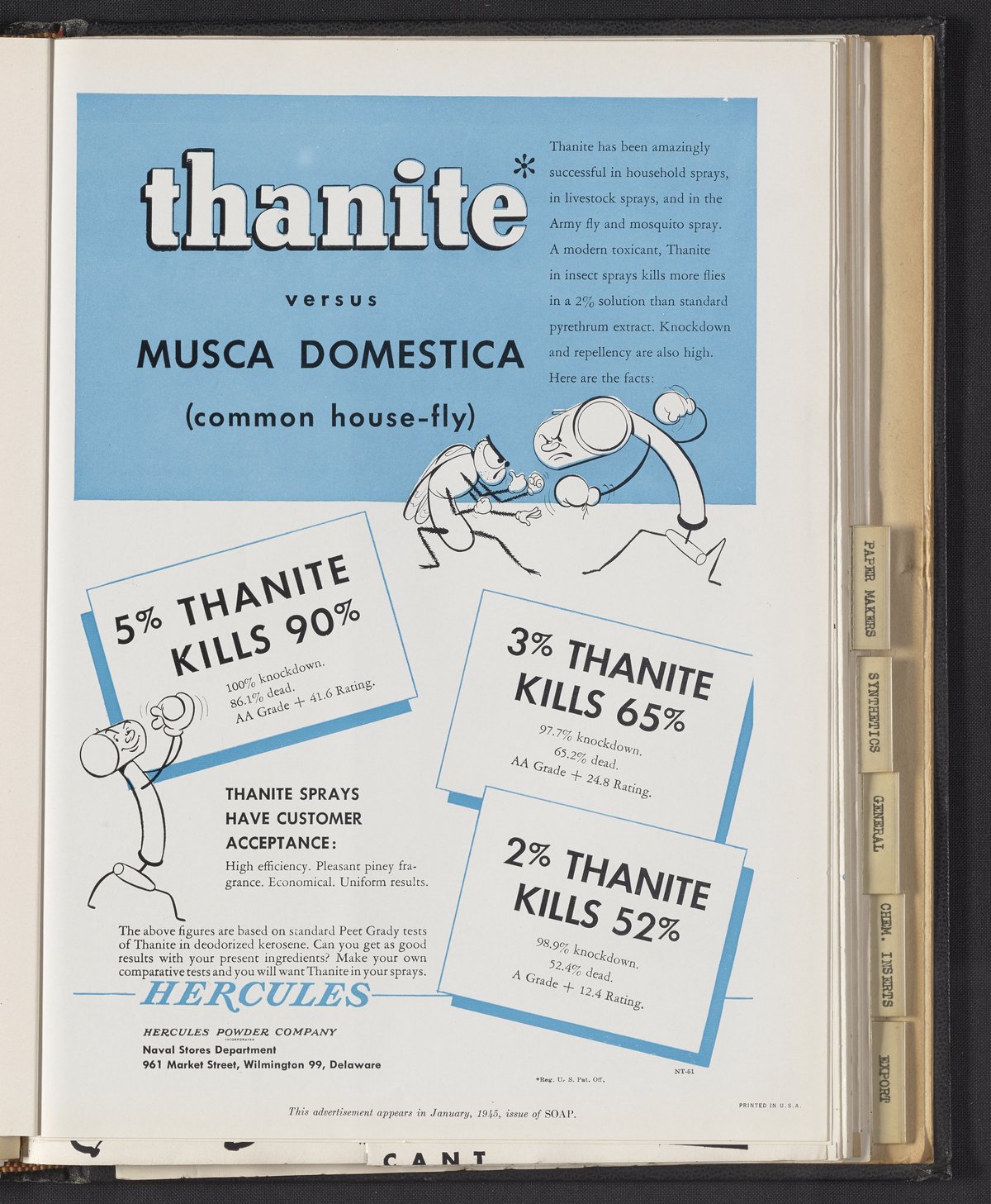 Hercules Incorporated. “Thanite Versus Musca Domestica (Common House-Fly).” 1945 Hercules Advertisements, 1945. Records of Hercules Incorporated, Volume 1945. Science History Institute. Philadelphia. https://digital.sciencehistory.org/works/4b29b677v.