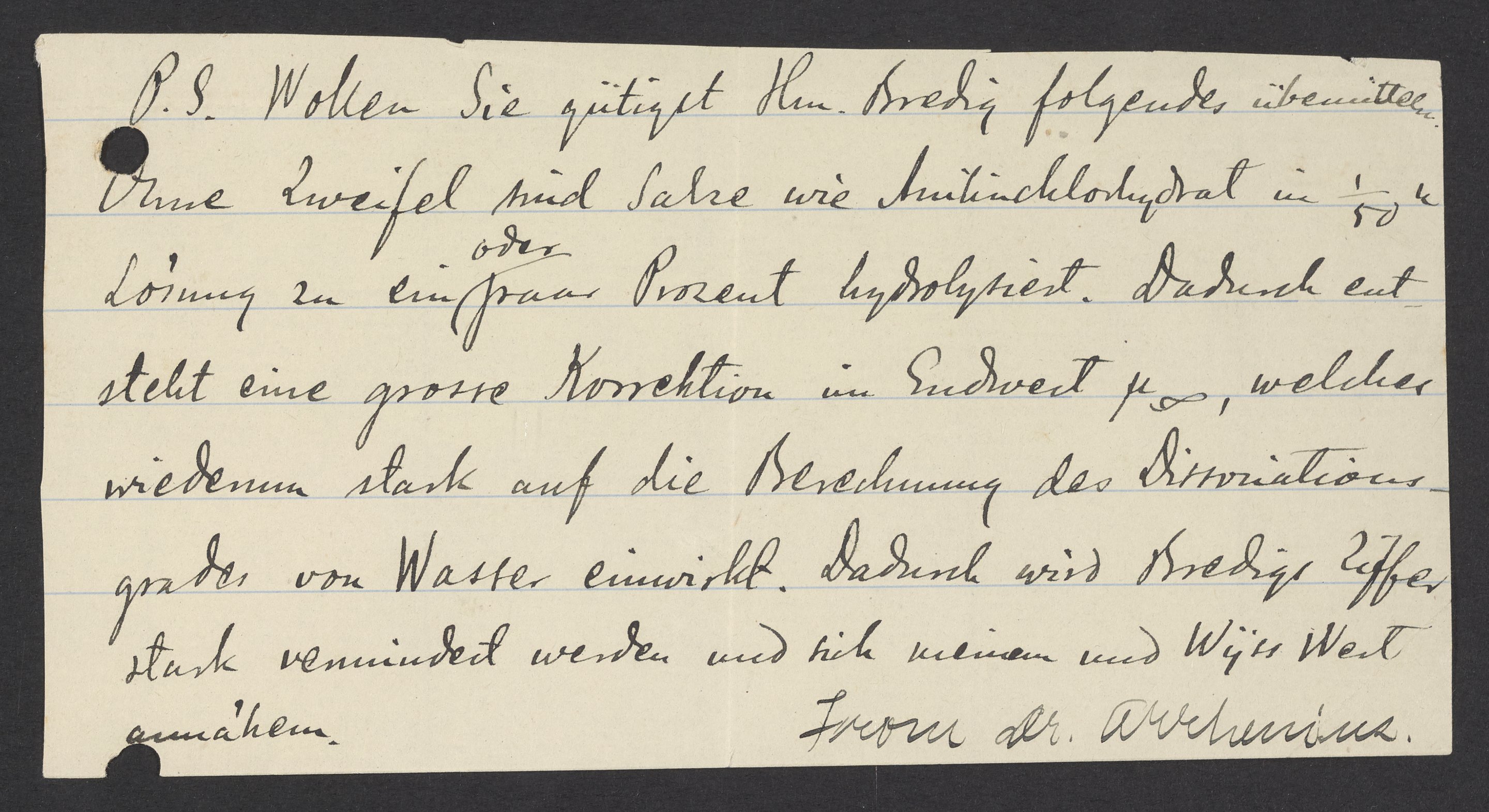 P.S. Wollen Sie gütigst Herrn Bredig folgendes übermitteln? Ohne Zweifel sind Salze wie Anilinchlorhydrat in 1/50 Lösung zu ein oder paar Prozent hydrolysiert. Dadurch entsteht eine grosse Korrektion im Endwert μ ∞, welches wiederum stark auf die Berechnung des Dissozationsgrades von Wasser einwirkt. Dadurch wird Bredigs Ziffer stark vermindert werden und sich meinen und Wyss‘ Wert annähern.