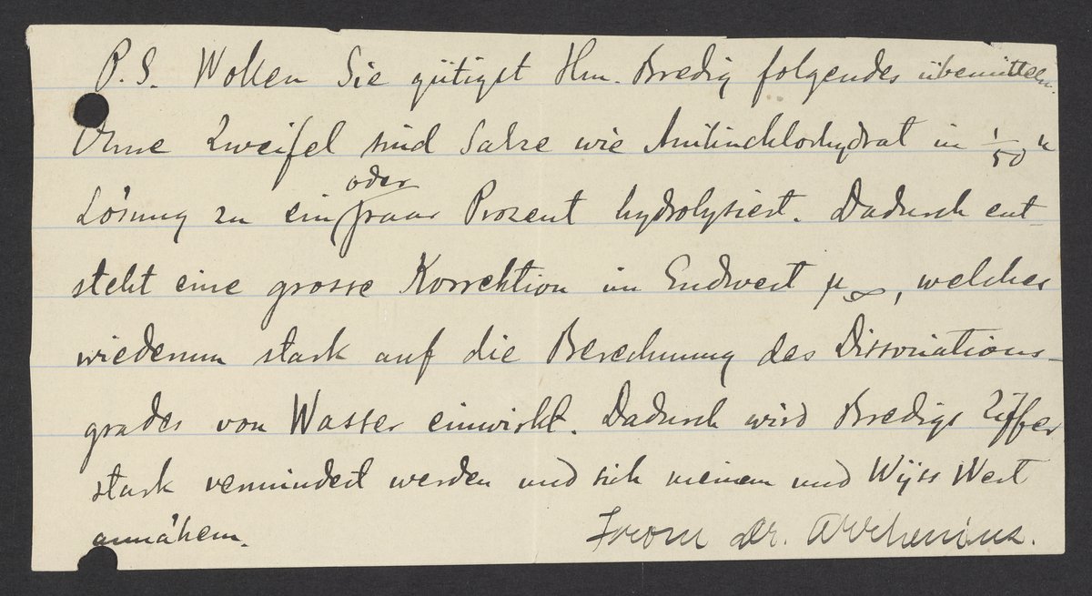 P.S. Would you kindly convey the following news to Mr. Bredig? Undoubtedly, salts like aniline chlorohydrate are hydrolyzed at one or a few percent in 1/50 solution. This yields a substantial correction in the final value μ ∞, which in turn has a strong effect on the calculation of the degree of water dissociation. As a result, Mr. Bredig's value will decrease and will come closer to the one determined by me and Mr. Wys.