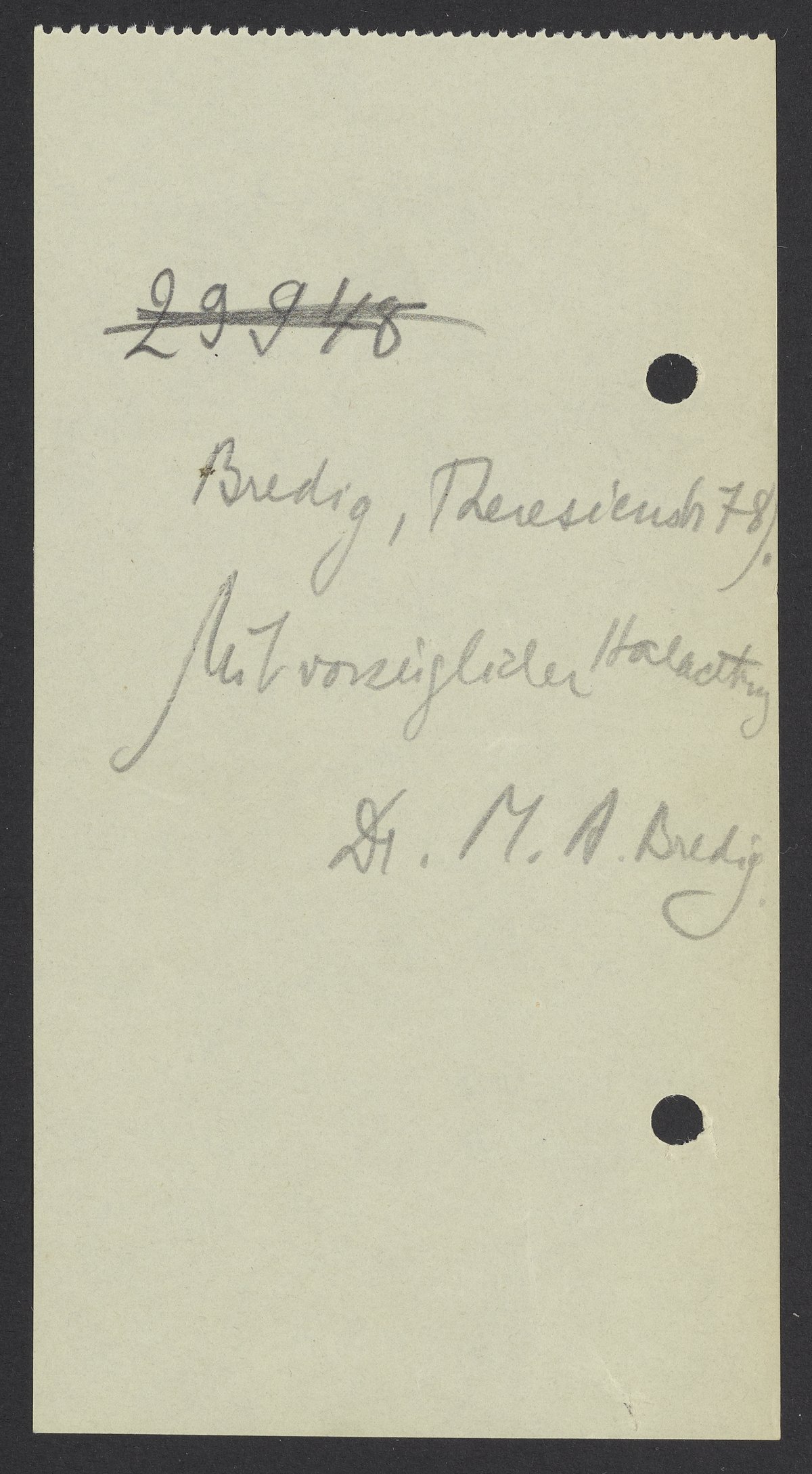 Euer Exzellenz danke ich auf Ergebenste für die Verlängerung meines Stipendiums durch die Notgemeinschaft der Deutschen Wissenschaft! Ich bekomme Überweisung auf mein Postscheckkonto München 29948 (Dr. Max A. Bredig, Theresienstr. 78).