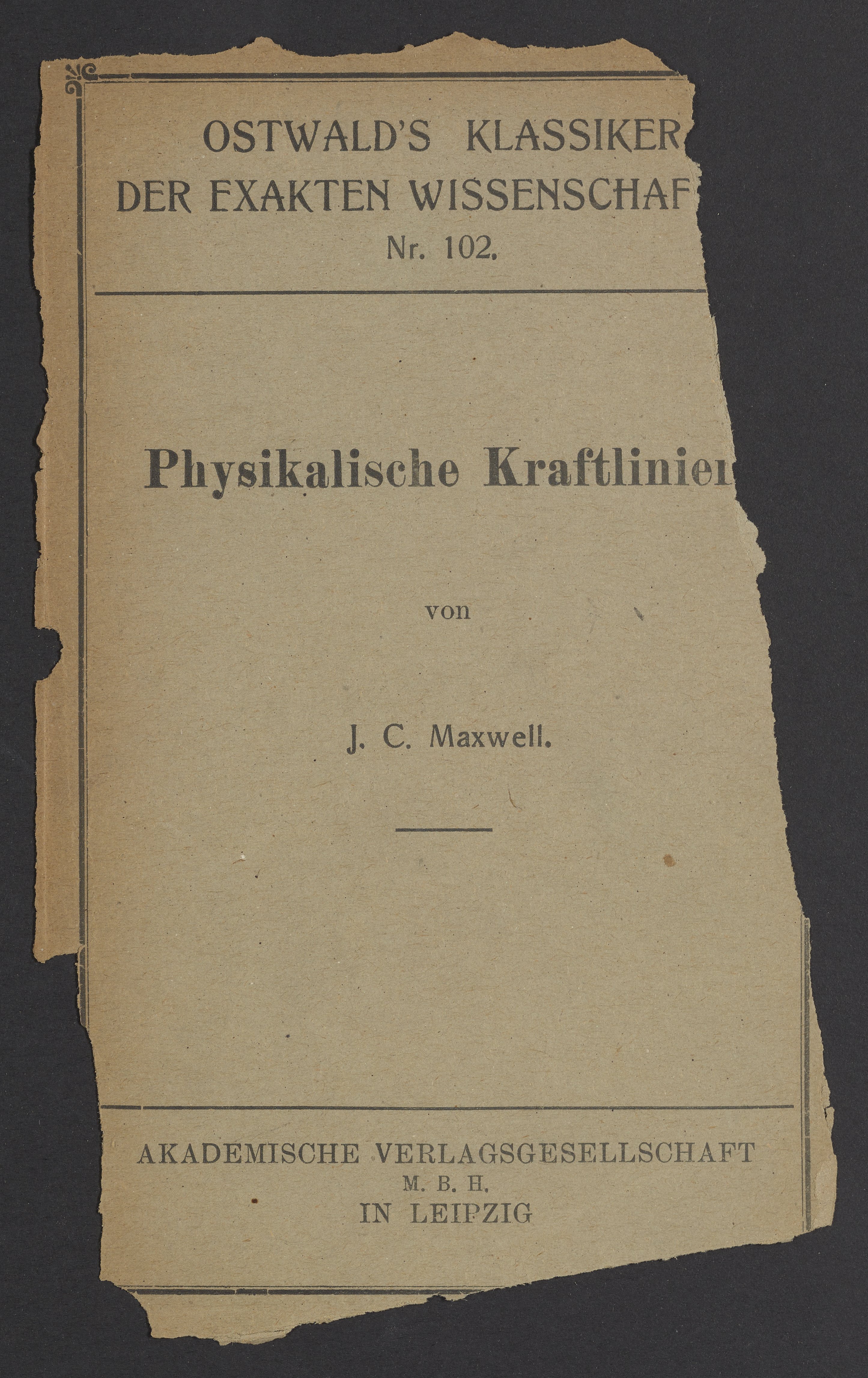 Maxwell, James Clerk. “Cover of Physikalische Kraftlinien,” 1898. Papers of Georg and Max Bredig, Box 4, Folder 30. Science History Institute. Philadelphia. https://digital.sciencehistory.org/works/4d6rp9w.