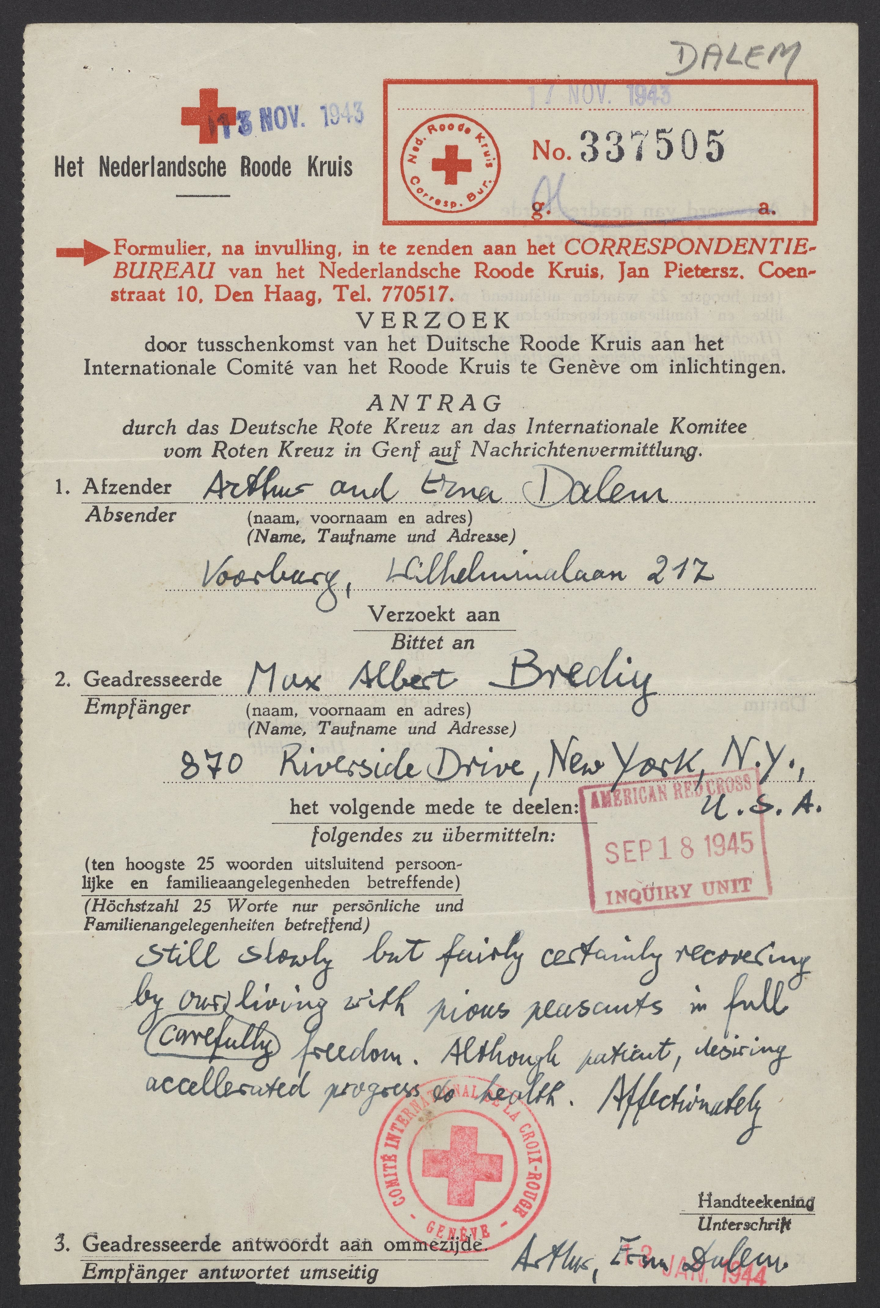 Message from Arthur and Erna Dalem (Alfred and Eva Schnell) to Max Bredig, December 30, 19431943-Dec-30 (sent), 1945-Sep-18 (received)