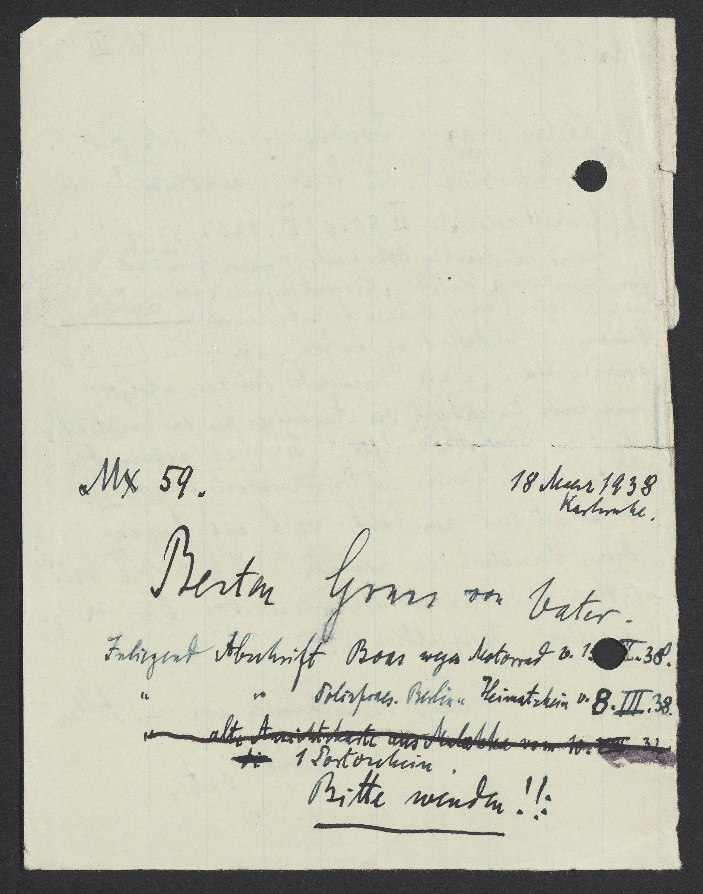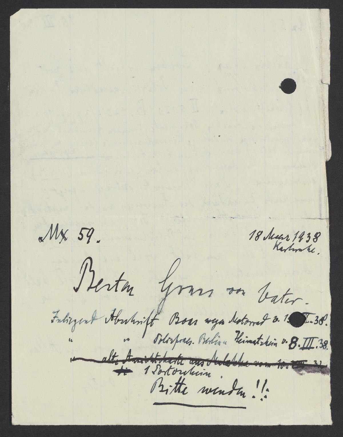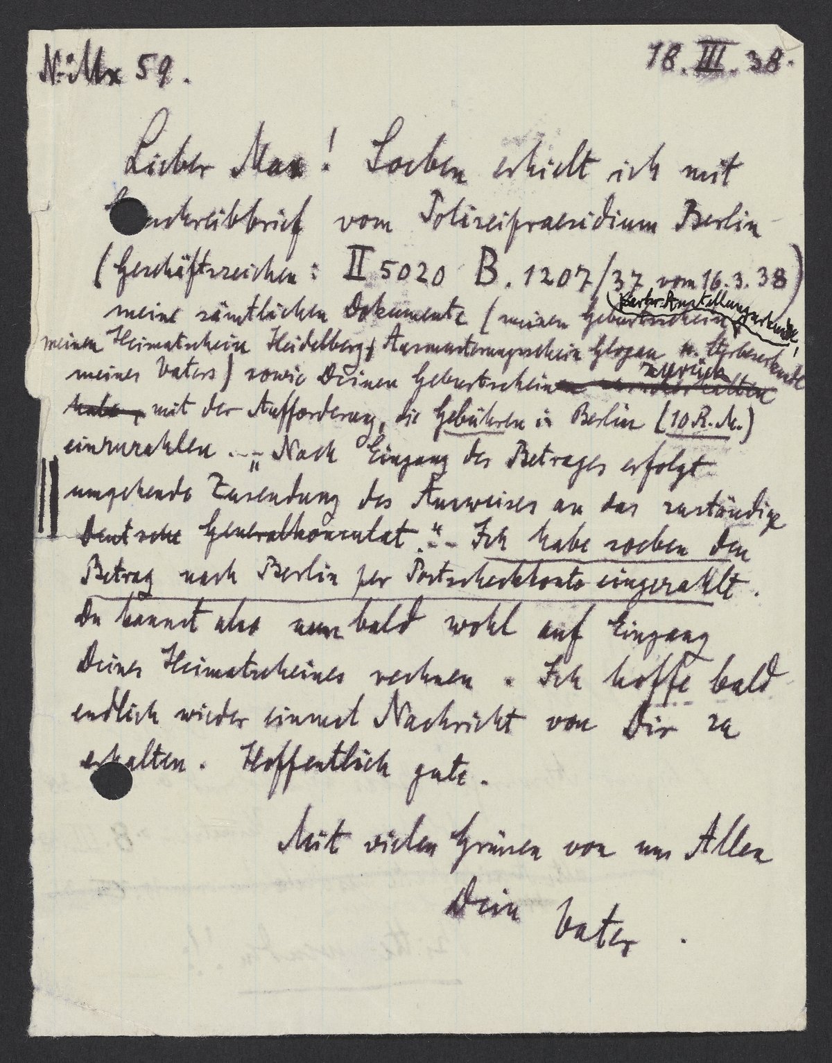 Lieber Max! Soeben erhielt ich mit Anschreibbrief vom Polizeipräsidium Berlin (Geschäftsreihen: II 5020 B. 1207137 vom 16. 3. 38) meine sämtlichen Dokumente (meinen Geburtsschein, meinen Heimatschein Heidelberg, Ausmusterungsschein Glogau, u. Sterbekunde meines Vaters) sowie Deinen Geburtsschein zurück mit der Aufforderung, die Gebühren in Berlin (10 R.M.) einzuzahlen. „Nach Eingang des Betrages erfolgt umgekehrte Zusendung des Ausweises an das zuständige Deutsche Generalkonsulat.“ Ich habe soeben den Betrag nach Berlin per Postscheckkonto eingesandt. Du kannst also nun bald wohl auf Eingang Deines Heimatscheines suchen. Ich hoffe bald endlich wieder innere Nachricht von Dir zu erhalten. Hoffentlich gute.