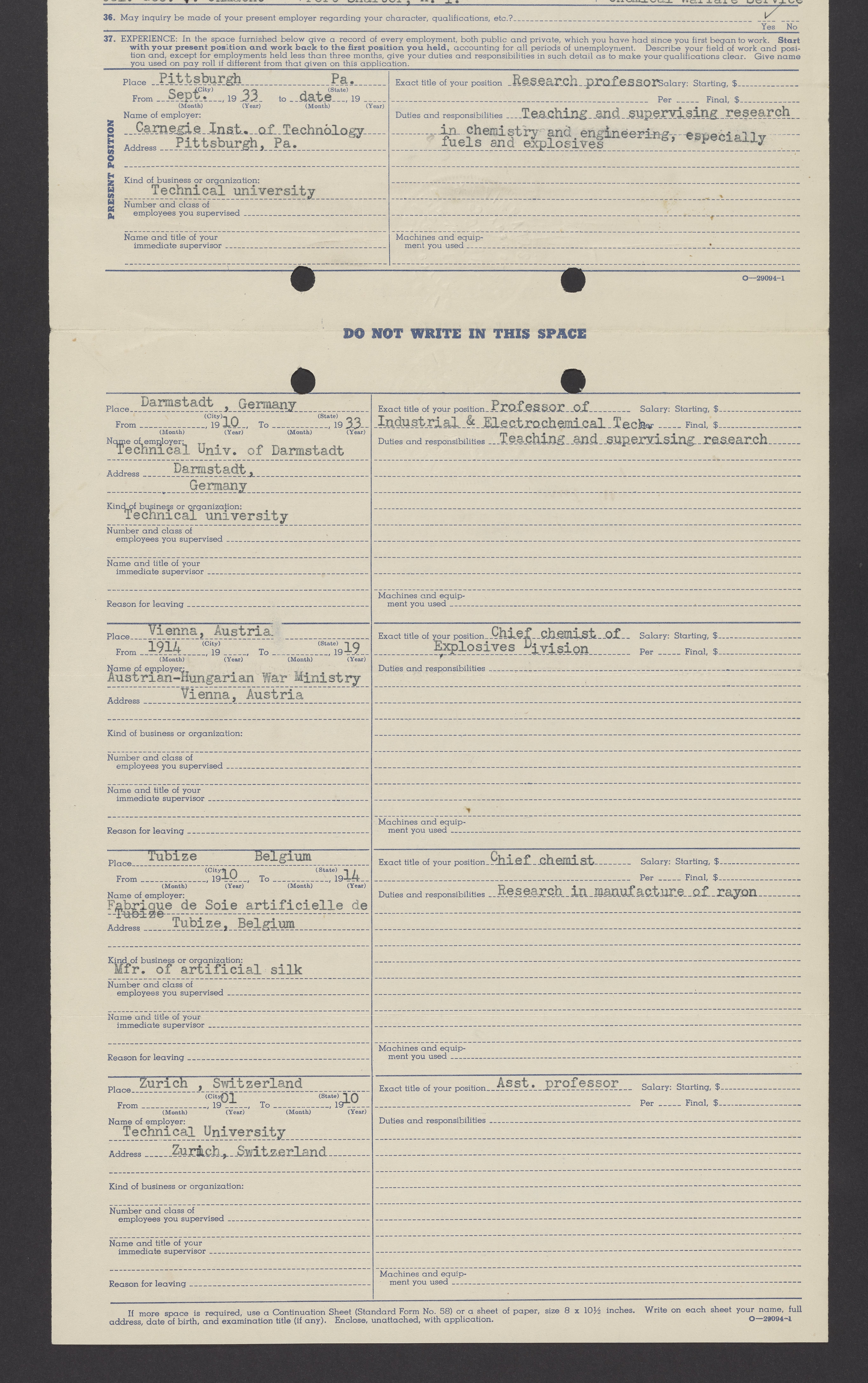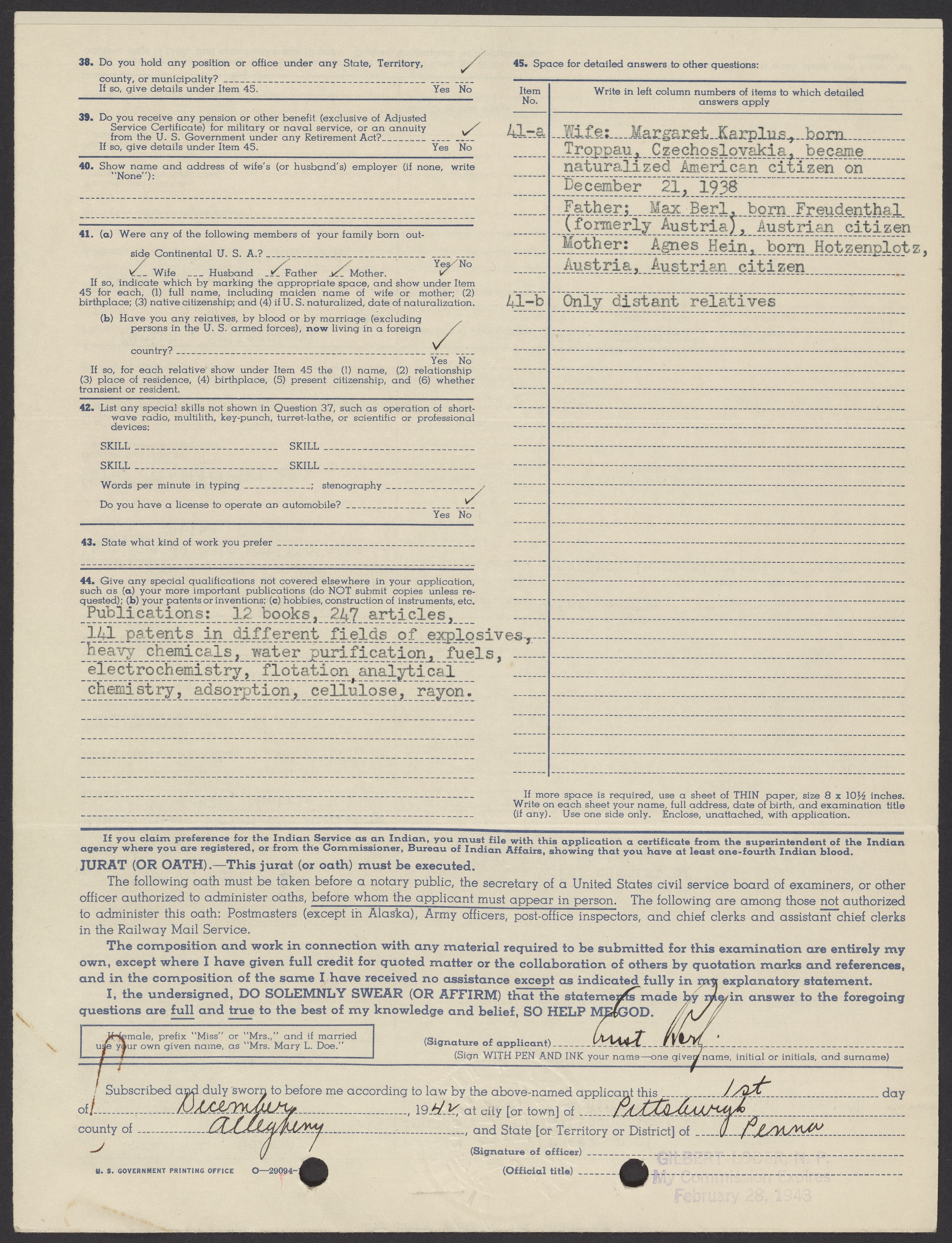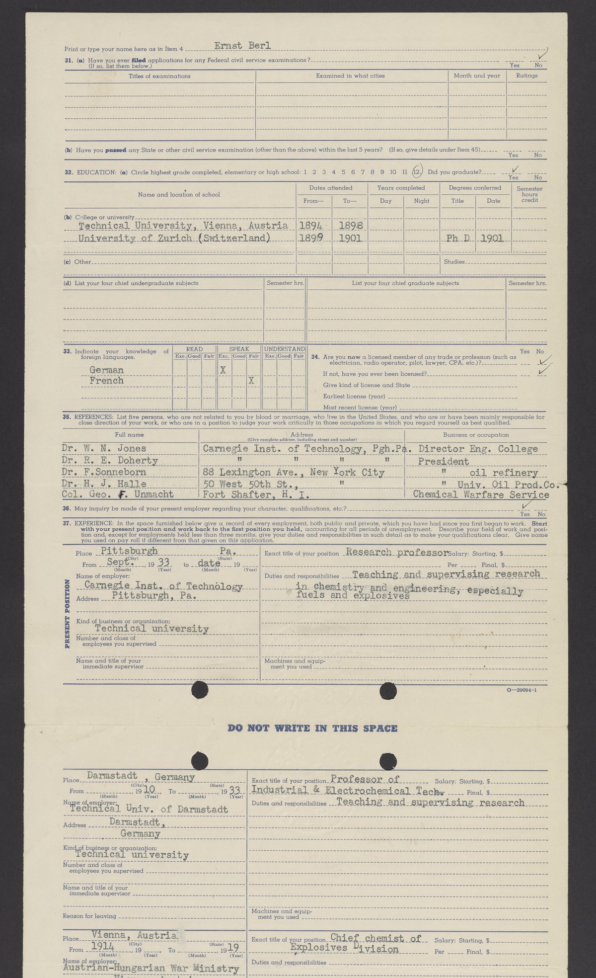 Small JPG1200 x 1565px — 434 KBLarge JPG2880 x 3756px — 2.2 MBFull-sized JPG5050 x 6586px — 6.3 MBOriginal fileTIFF — 5050 x 6586px — 95.2 MBErnst Berl's (1877-1946) application for federal employment, completed November 30, 1942, while Berl was living in Pittsburgh, Pennsylvania.