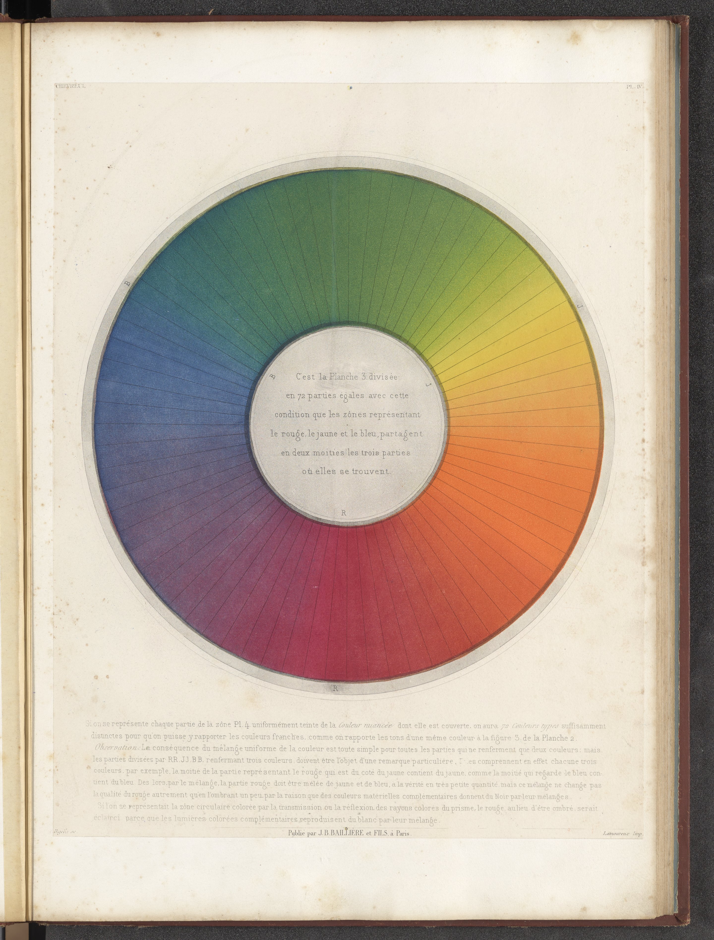 Chevreul, M. E. (Michel Eugène). “Plate IV: Zone Circulaire Divisée En 72 Parties Égales.” In Des Couleurs Et De Leurs Applications Aux Arts Industriels à l'Aide Des Cercles Chromatiques. Paris, France: J.-B. Baillière et fils, 1864. https://digital.sciencehistory.org/works/4j03cz85n.