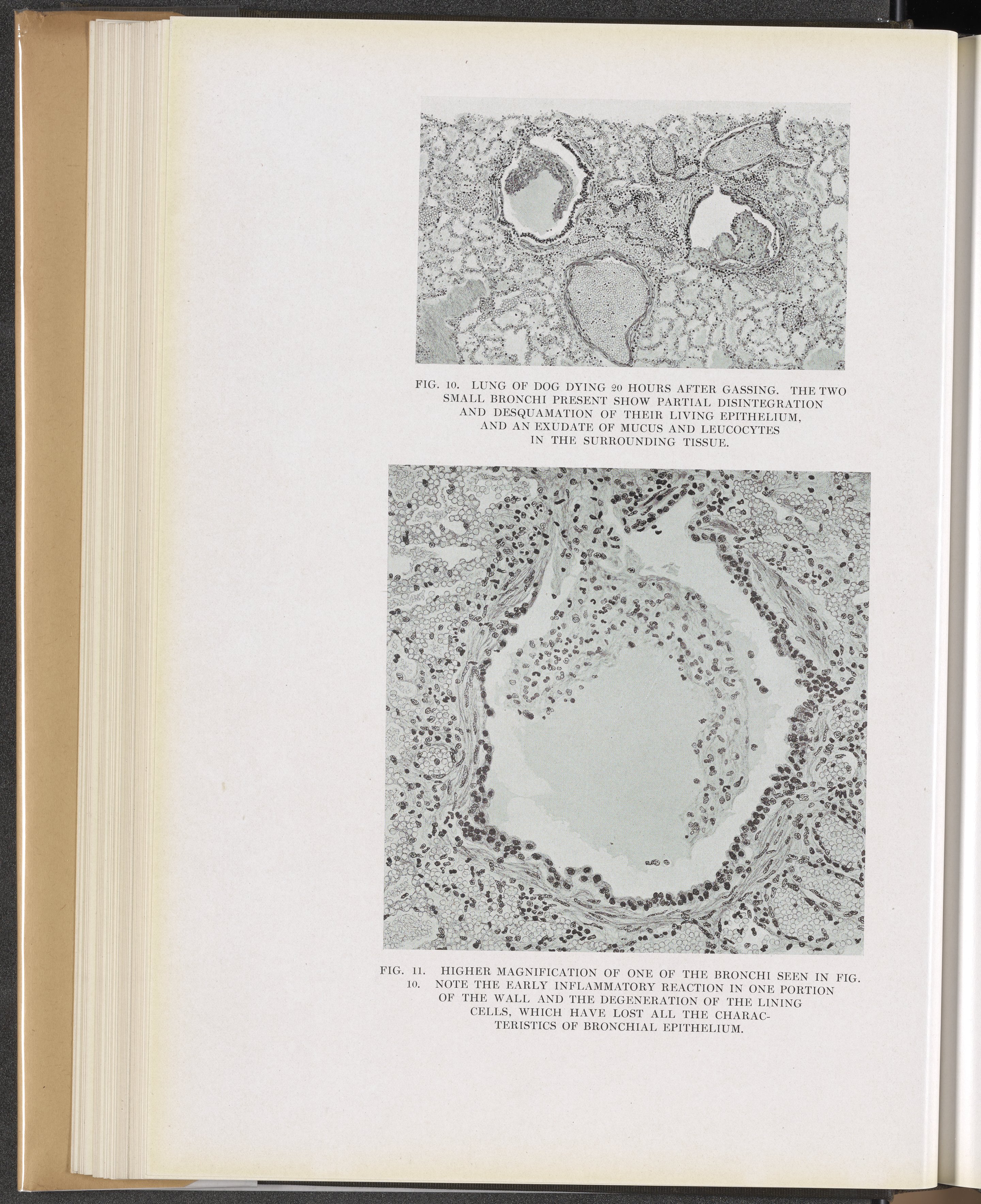 Winternitz, M. C. (Milton C.). “Fig. 10: Lung of Dog Dying 20 Hours after Gassing. Fig. 11: Higher Magnification of One of the Bronchi Seen in Fig. 10.” Collected Studies on the Pathology of War Gas Poisoning. New Haven, Connecticut: Yale University Press, 1920. https://digital.sciencehistory.org/works/4j03cz88g.