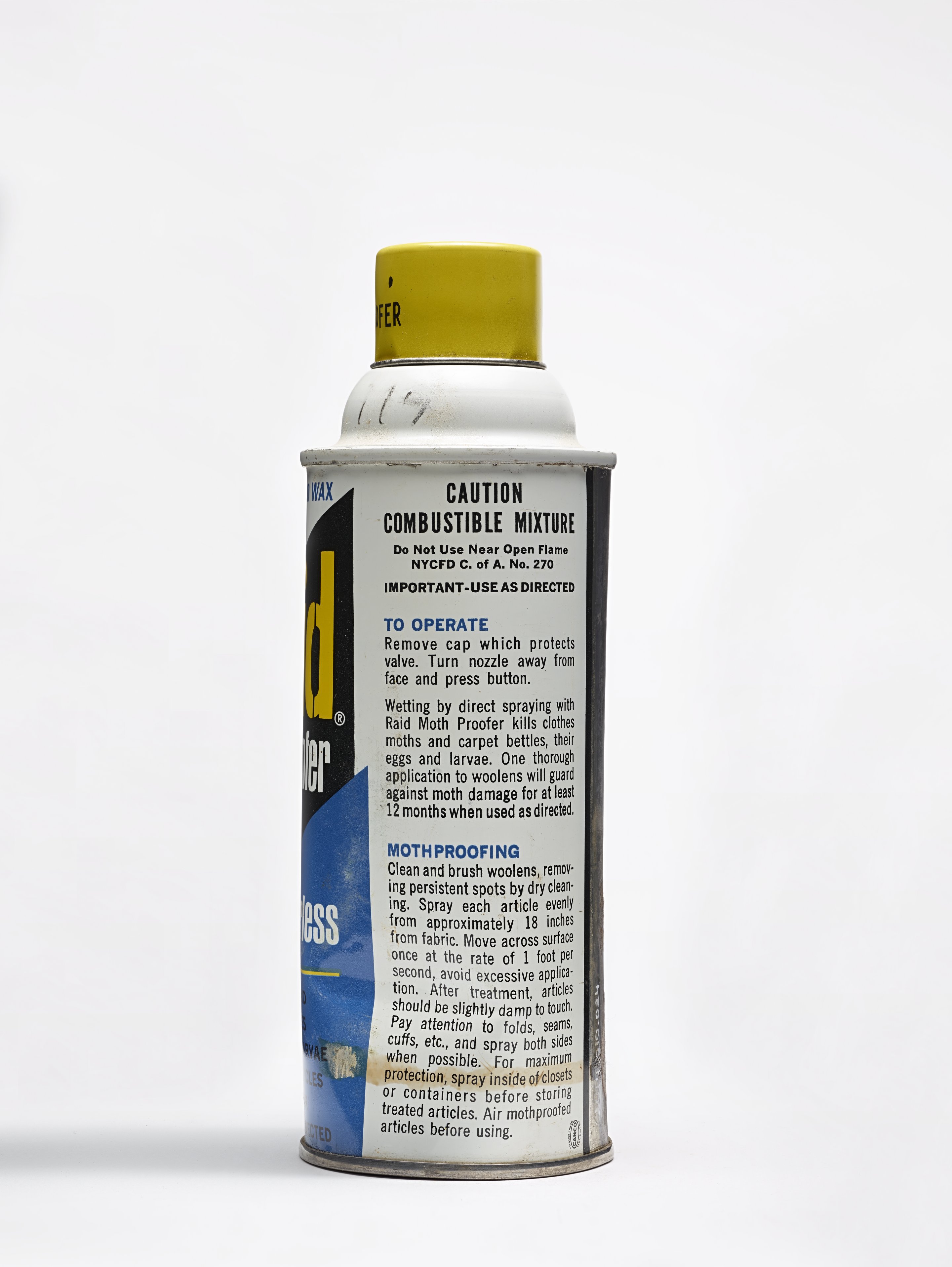 Small JPG1200 x 1597px — 126 KBLarge JPG2880 x 3833px — 554 KBFull-sized JPG7760 x 10328px — 3.1 MBOriginal fileTIFF — 7760 x 10328px — 229 MBRaid brand insecticide aerosol spray can with yellow, white, blue, and black text on white, black, and blue label. Round yellow cap.