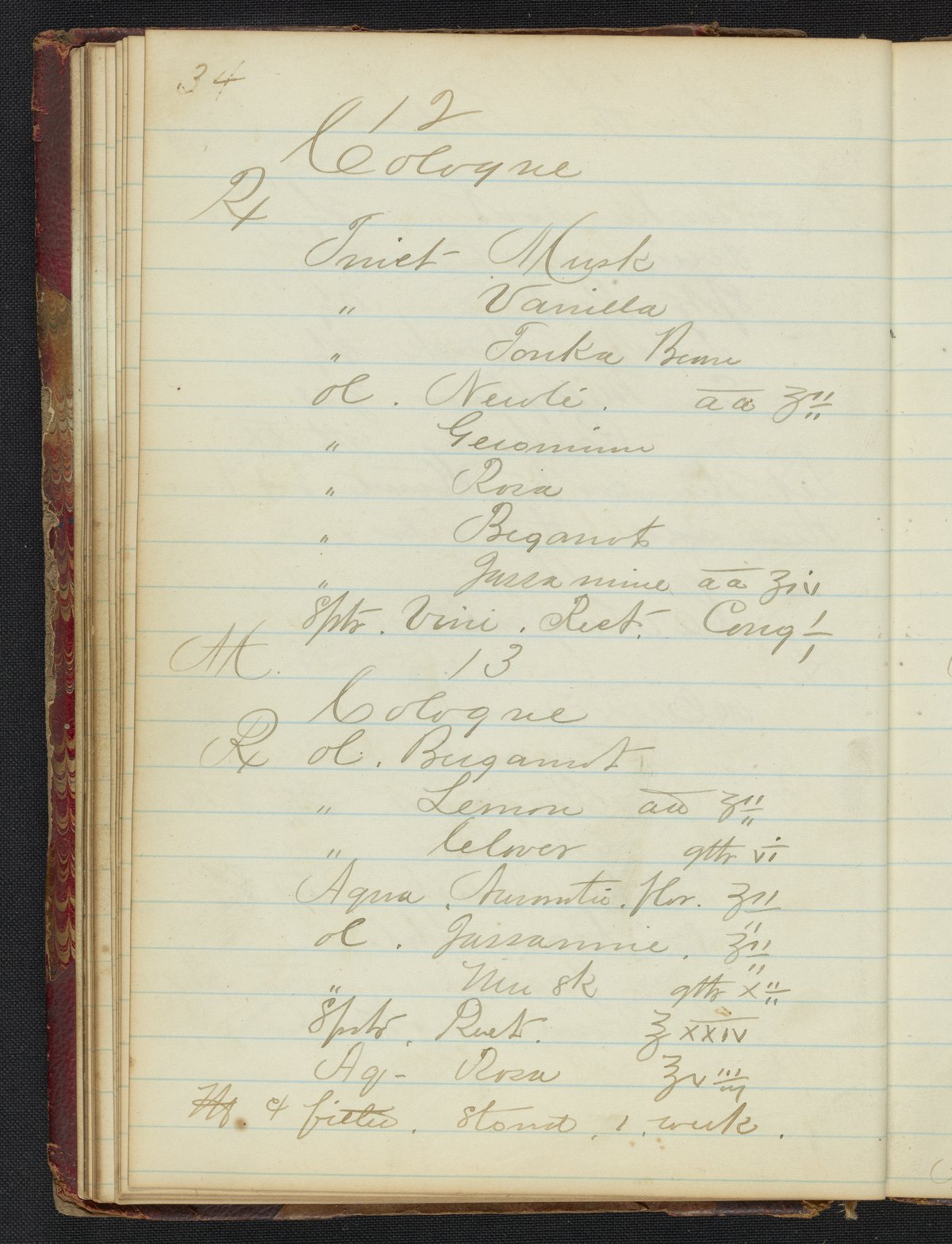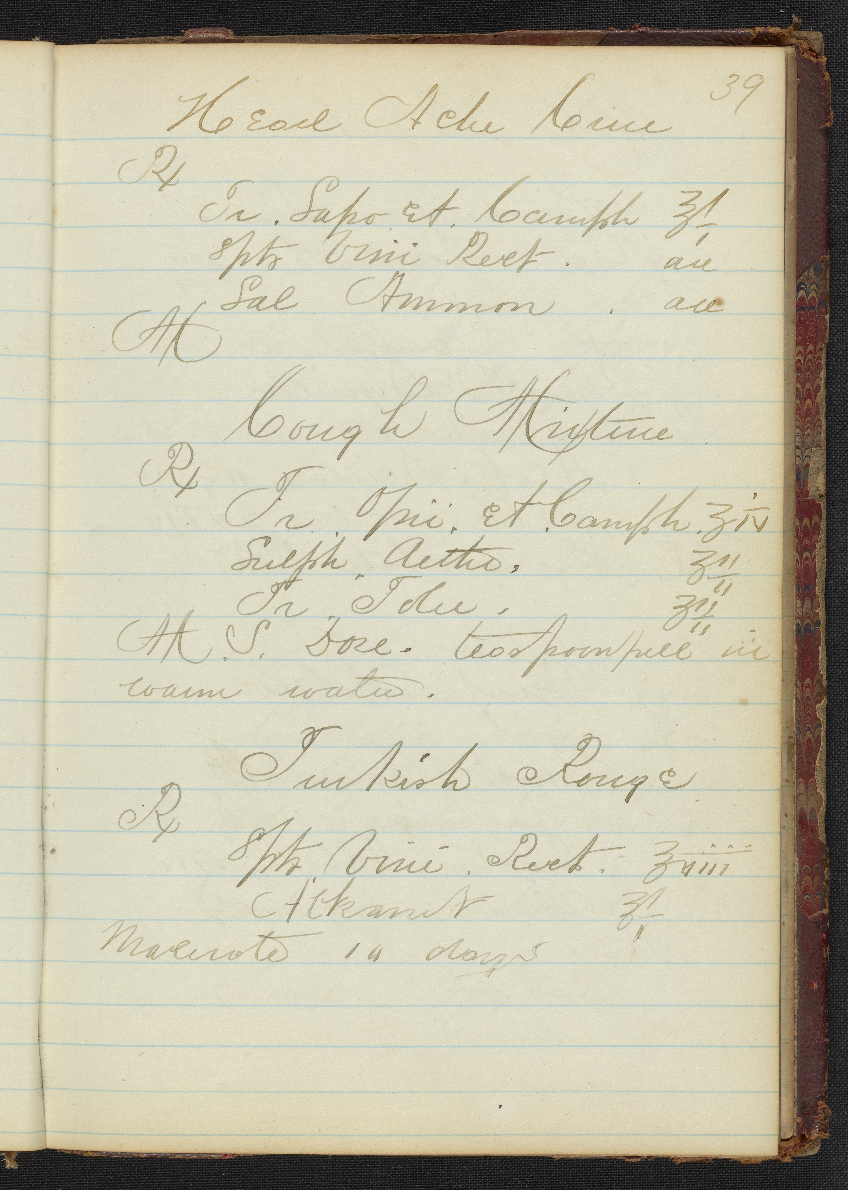 Small JPG1200 x 1633px — 472 KBLarge JPG2880 x 3920px — 2.5 MBFull-sized JPG3588 x 4884px — 3.6 MBOriginal fileTIFF — 3588 x 4884px — 50.2 MBThis notebook contains recipes and formulas developed or copied by E. F. Carey while working as an assistant pharmacist in Rhode Island and as the owner operator of a pharmacy in Massachusetts between 1863 and 1875. Includes recipes for hair wash and dye, cough syrup, writing ink, coloring billiard balls, rheumatism relief, and more.