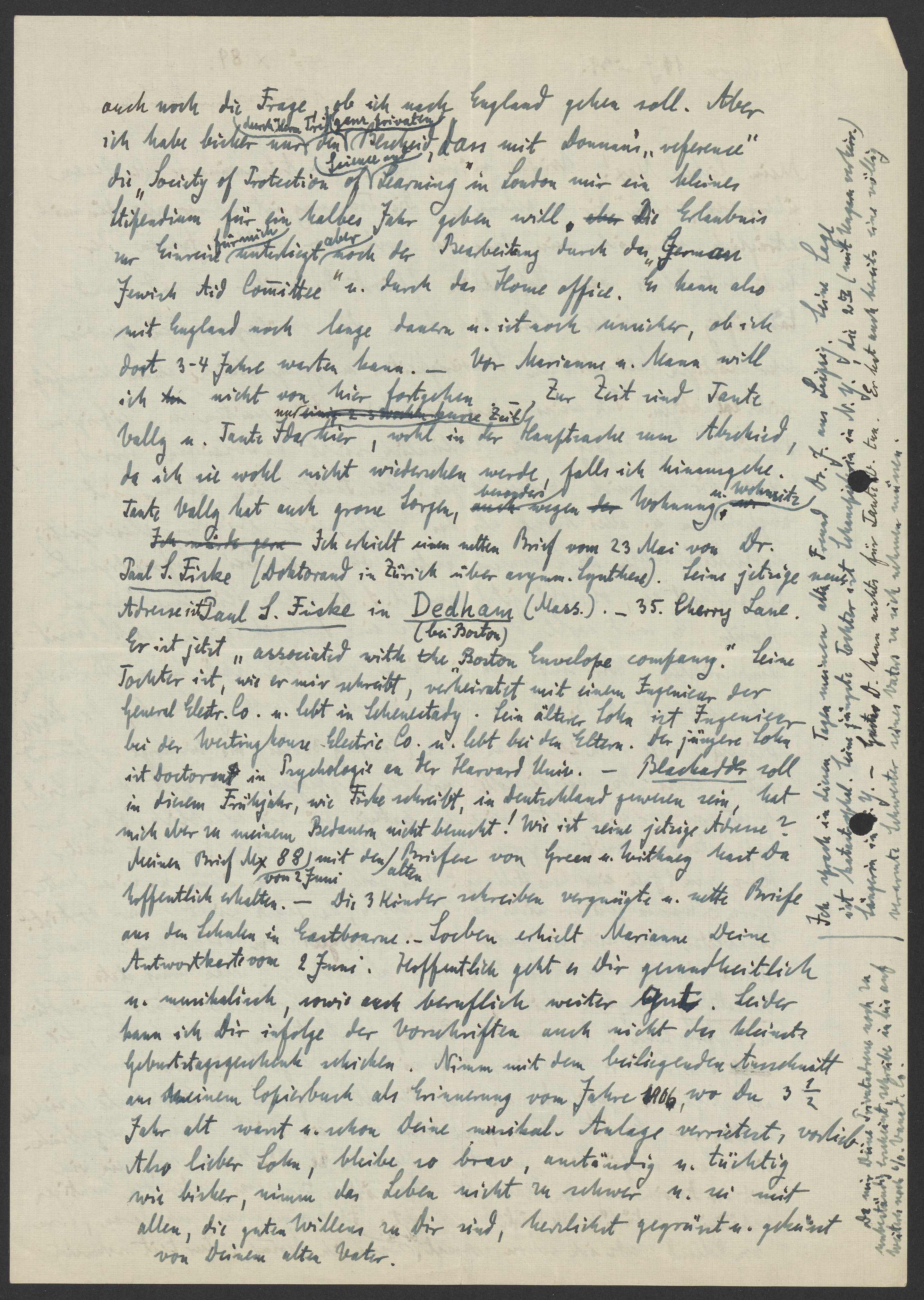 Ich erhielt einen netten Brief vom 23 Mai von Dr. Paul S. Fiske in Dedham (Mass). – 35 Cherry Lane. Er ist jetzt „associated with the Boston Envelope Company.“ Seine Tochter ist, wie er mir schreibt, verheiratet mit einem Ingenieur der General Electr. Co. u lebt in Schenectady. Sein älterer Sohn ist Ingenieur bei der Westinghouse Electric. Co. u. lebt bei den Eltern. Der jüngere Sohn ist Doktorand in Psychologie an der Harvard Univ. Blackader soll in diesem Frühjahr, wie Fiske schreibt, in Deutschland gewesen sein, hat mich aber zu meinem Bedauern nicht besucht! Wie ist sein jetzige Adresse? Meinen Brief Mx 88 vom Juni mit den alten Briefen von Green u. Withaeg hast Du hoffentlich erhalten. – Die 3 Kinder schreiben vergnügte u. nette Briefe aus den Schulen in Eastbourne. – Soeben erhielt Marianne Deine Antwortkarte vom 2. Juni. Hoffentlich geht es Dir gesundheitlich u. musikalisch, sowie auch beruflich weiter gut. Leider kann ich Dir infolge der Vorschriften auch nicht der kleinste Geburtstagsgeschenk schicken. Nimm mit den beiliegenden Ausschnitt aus meinen Copierbuch als Erinnerung vom Jahre 1906, wo Du 3 ½ Jahr alt warst u. schon Deine musikal. Anlage verrietest, vorlieb. Also lieber Sohn, bleibe so brav, anständig, u. tüchtig wie bisher, nimm das Leben nicht zu schwer u. sei mit allen die guten Willens zu Dir sind, herzlich gegrüsst u. geküsst.