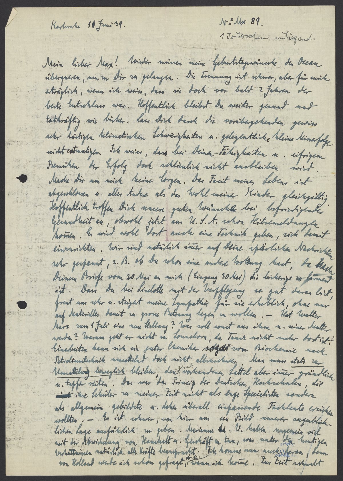 Mein lieber Max! Wieder müssen meine Geburtstagswünsche den Ozean überqueren, um zu Dir zu gelangen. Die Trennung ist schwer, aber für mich erträglich, wenn ich weiss, dass sie doch vor bald 2 Jahren der beste Entschluss war. Hoffentlich bleibst Du weiter gesund und tatkräftig wie bisher. Lass Dich durch die vorübergehenden gewiss sehr lästigen klimatischen Schwierigkeiten u. gelegentliche Klima Misserfolge nicht entmutigen. Ich weiss, dass bei Deinen Fähigkeiten u. eifrigem Bemühen der Erfolg doch schliesslich nicht ausbleiben wird. Mache Dir um mich keine Sorgen. Das Facit meines Lebens ist abgeschlossen u. alles Andere als das Wohl meiner Kinder gleichgültig. Hoffentlich treffen Dich unsere guten Wünsche bei befriedigter Gesundheit an, obwohl jetzt aus U.S.A. schon Hitzemeldungen kommen. Es wird wohl dort auch eine Technik geben, sich damit einzurichten. Wir sind natürlich immer auf Deine spärlichen Nachrichten sehr gespannt, z.B. ob Du schon eine andere Wohnung hast, da nach Deinem Briefe vom 20 Mai an mich (Eingang 30 Mai) die bisherige zu lärmend ist. Dass Du bei Liselotte mit der Verpflegung so gut daran bist, freut uns sehr u. steigert meine Sympathie fuer sie erheblich, ohne nur auf Materielles damit zu grosse Betonung legen zu wollen. – Hat Walter Marx zum 1. Juli eine neue Stellung? Was soll sonst aus ihm u. seiner Mutter werden? Warum geht er nicht zu Sonneborn, da Tausz nicht mehr dort ist? Einarbeiten kann sich ein guter Chemiker sogar von Biochemie nach Petroleumtechnik umsattelnd doch nicht allzuschwer. Man muss stets zur Umsattelung beweglich bleiben, den gerade vorhandenen Sattel aber immer gründlich u. tapfer reiten. Das war das Prinzip der Deutschen Hochschulen, die ihre Schüler zu meiner Zeit nicht als enge Spezialisten sondern als allgemein gebildete u. daher überall einpassende Fachleute erziehen wollten. – Es ist schwer, von hier aus ein Bild unserer augenblicklichen Lage ausführlich zu geben. Marianne u. V. haben ungemein viel mit der Abwickelung von Haushalt u. Geschäft zu tun, was unter den heutigen Verhältnissen natürlich alle Kräfte beansprucht. Ich komme nun auch daran, denn von Hollandwerde ich schon gefragt, ob u. wann ich komme. Zur Zeit schwebt