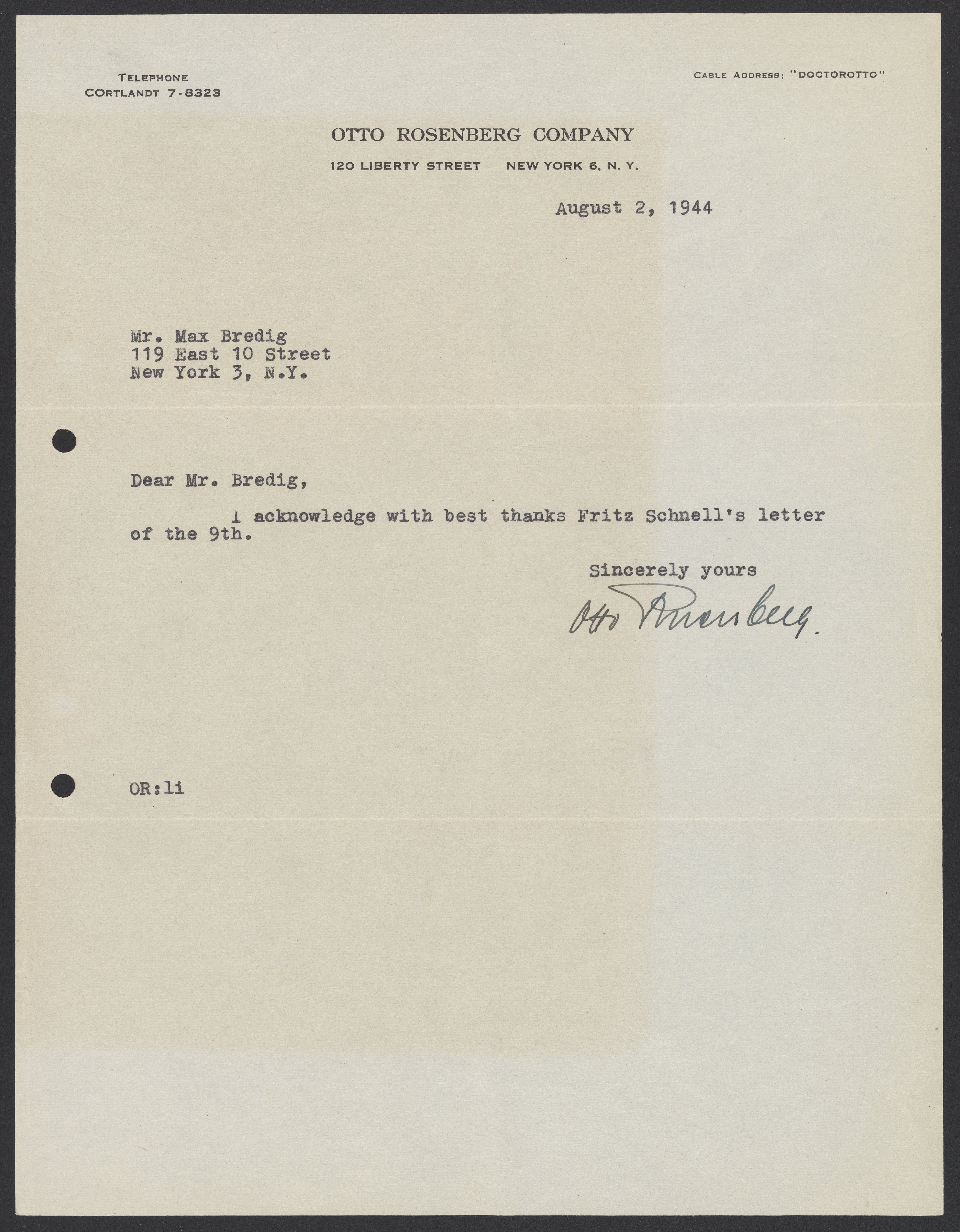 Letter from Otto Rosenberg to Max Bredig, August 2, 1944