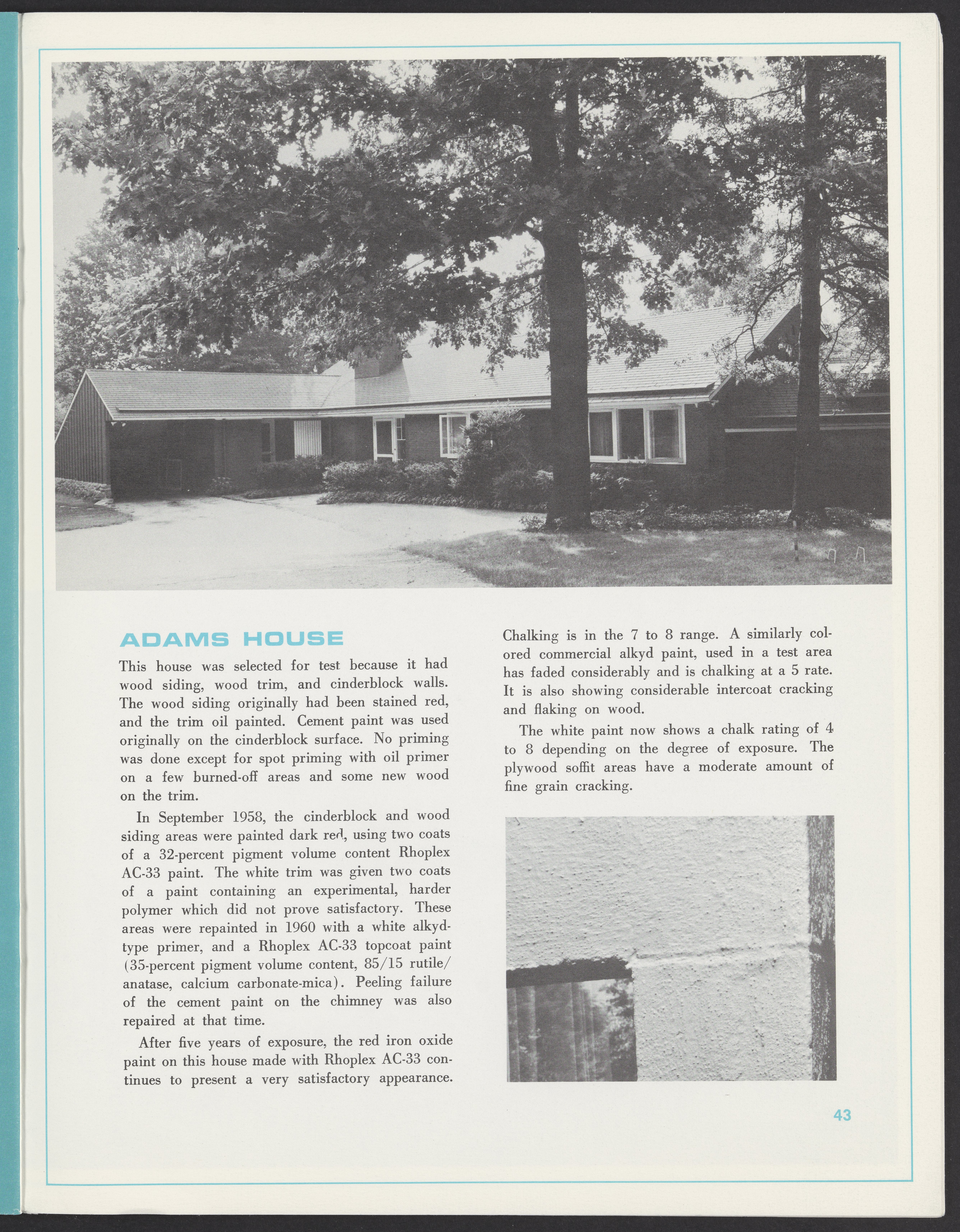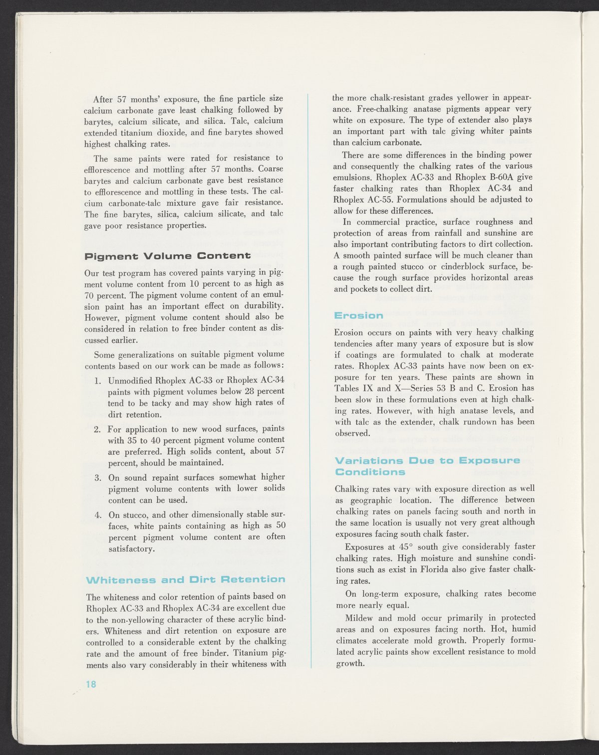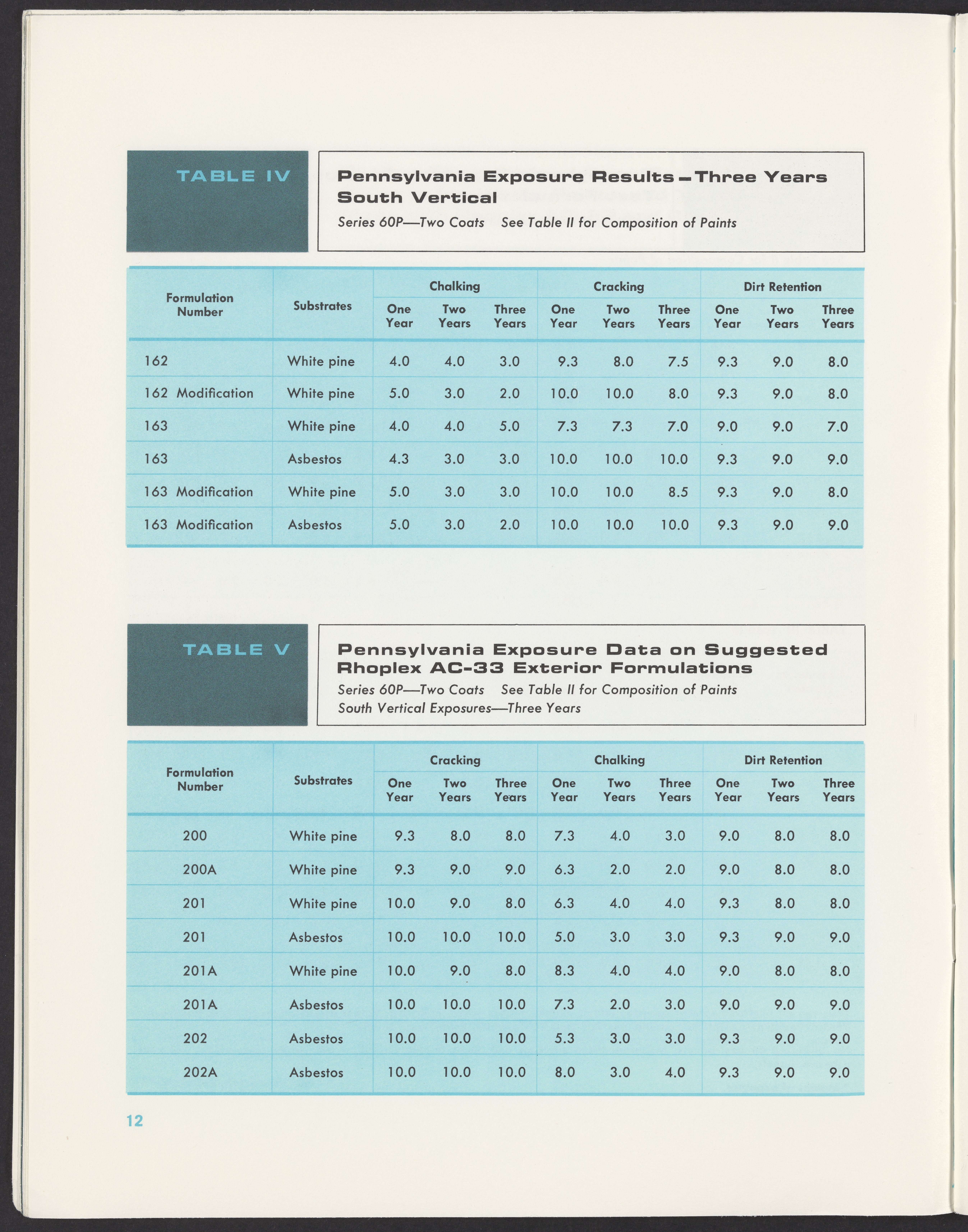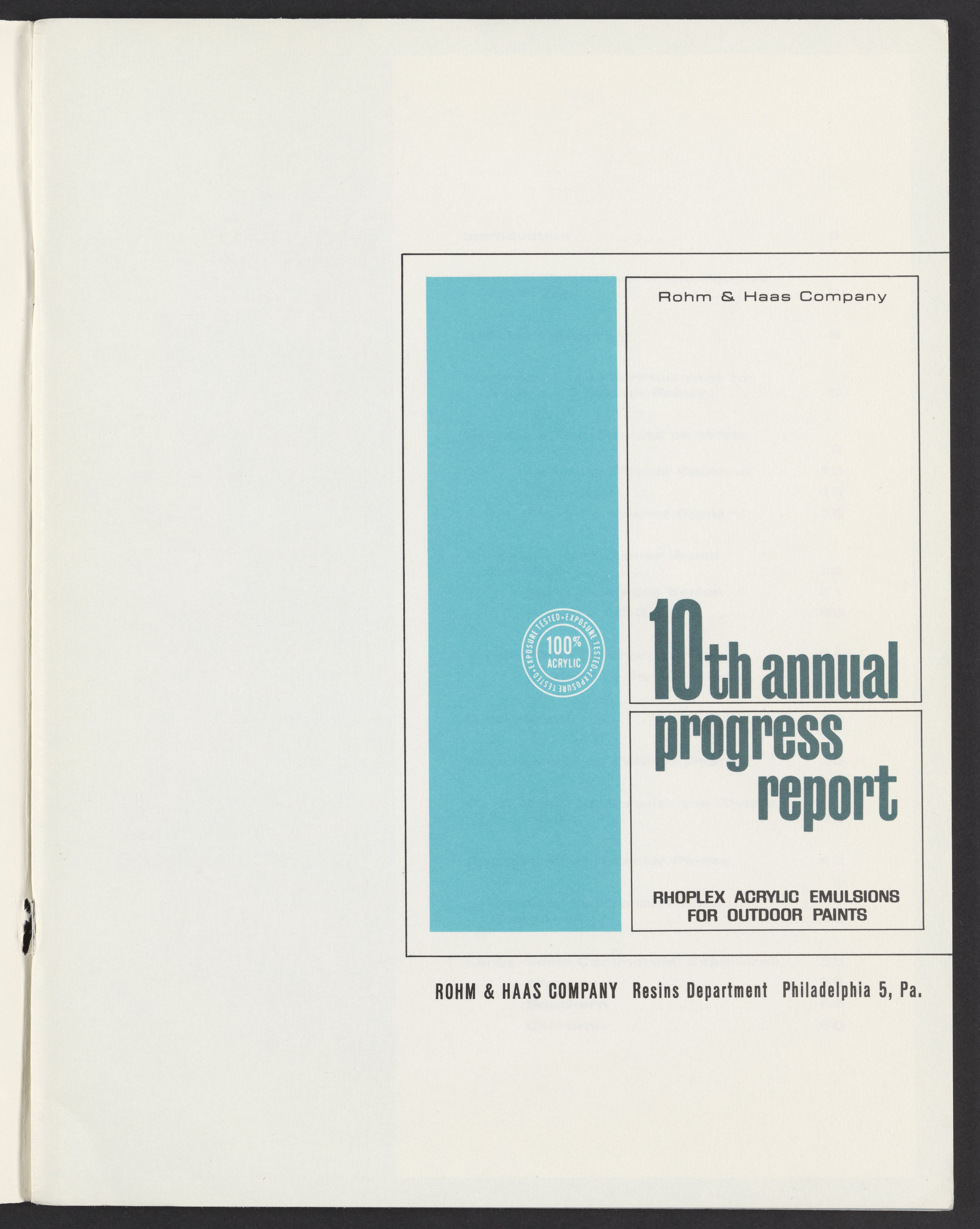 Small JPG1200 x 1531px — 289 KBLarge JPG2880 x 3676px — 1.8 MBFull-sized JPG5336 x 6810px — 5.7 MBOriginal fileTIFF — 5336 x 6810px — 104 MBThe 1963 annual report, titled Rhoplex Acrylic Emulsions for Exterior Paints, was published by the Resins Department of the Rohm & Haas Company. This report discusses how exterior paints performed on various materials and under different exposure conditions over a ten year span.