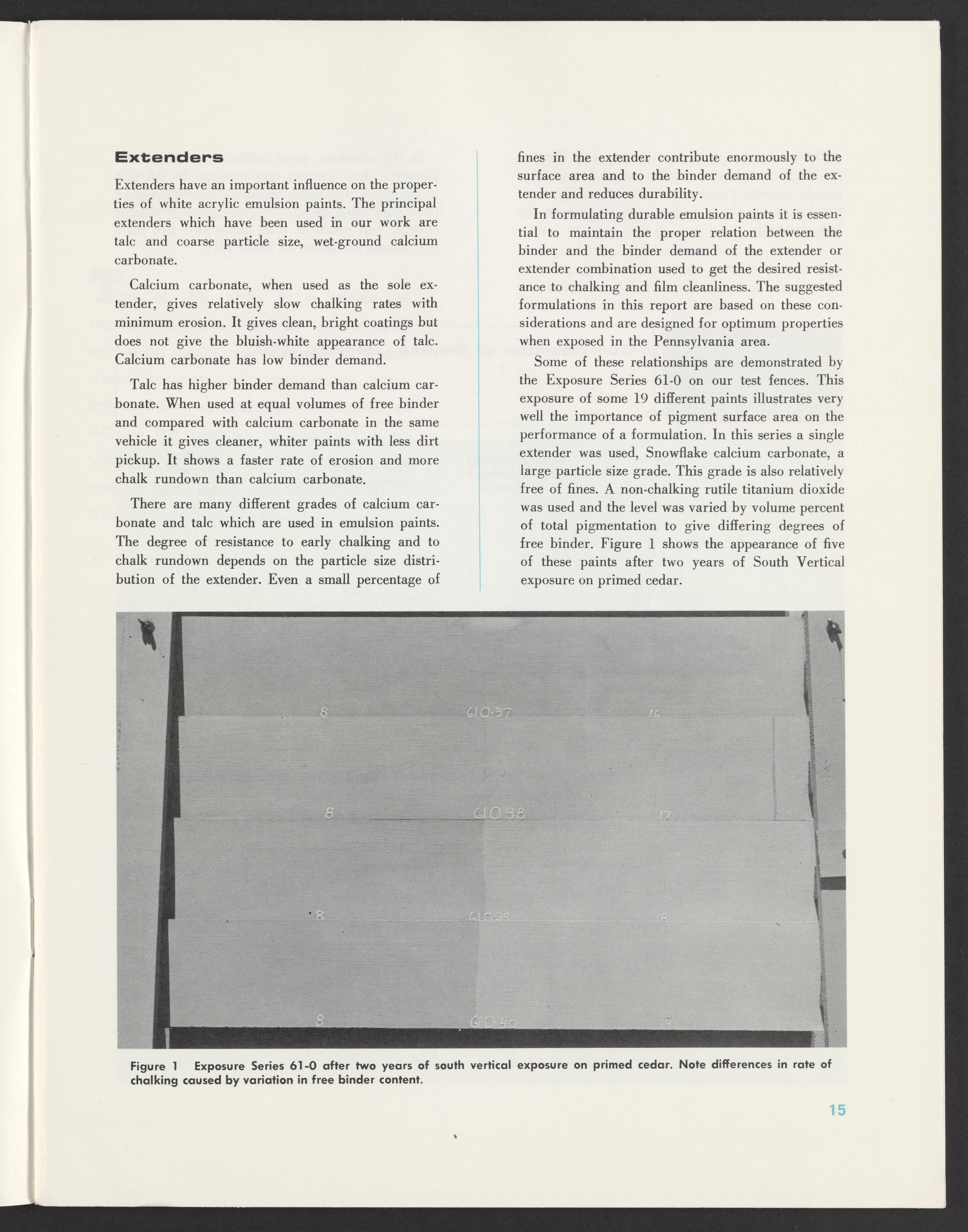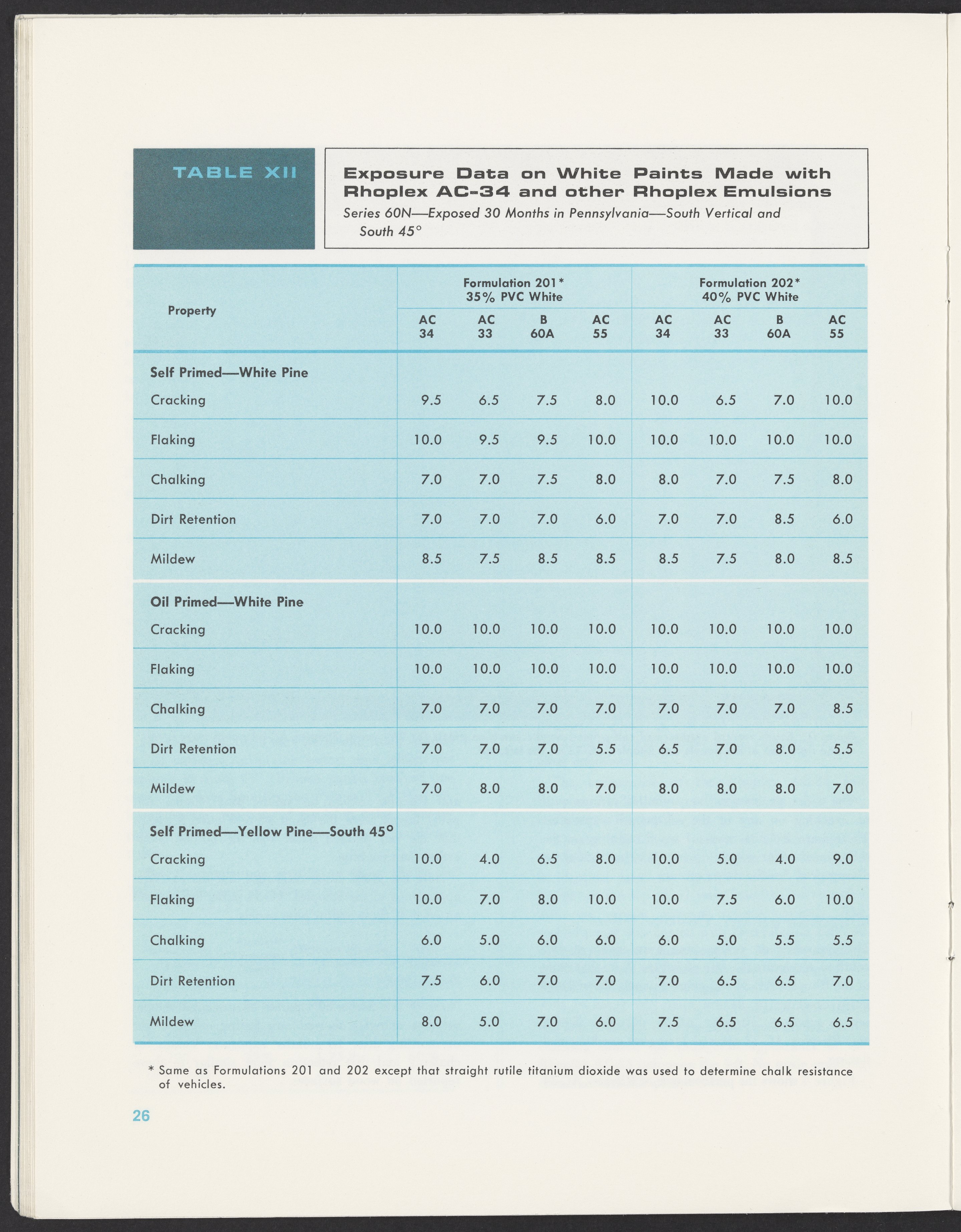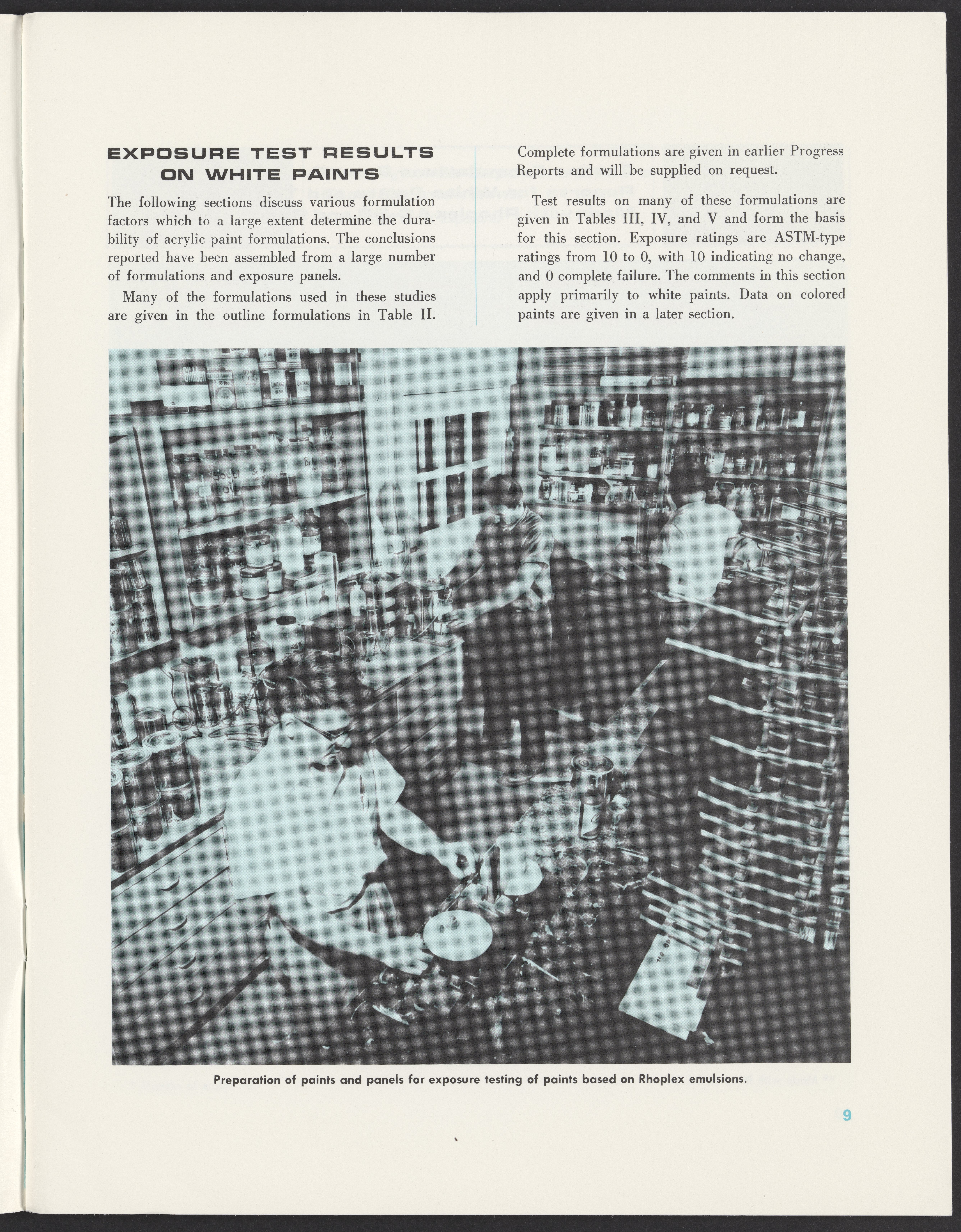 Small JPG1200 x 1531px — 289 KBLarge JPG2880 x 3676px — 1.8 MBFull-sized JPG5336 x 6810px — 5.7 MBOriginal fileTIFF — 5336 x 6810px — 104 MBThe 1963 annual report, titled Rhoplex Acrylic Emulsions for Exterior Paints, was published by the Resins Department of the Rohm & Haas Company. This report discusses how exterior paints performed on various materials and under different exposure conditions over a ten year span.