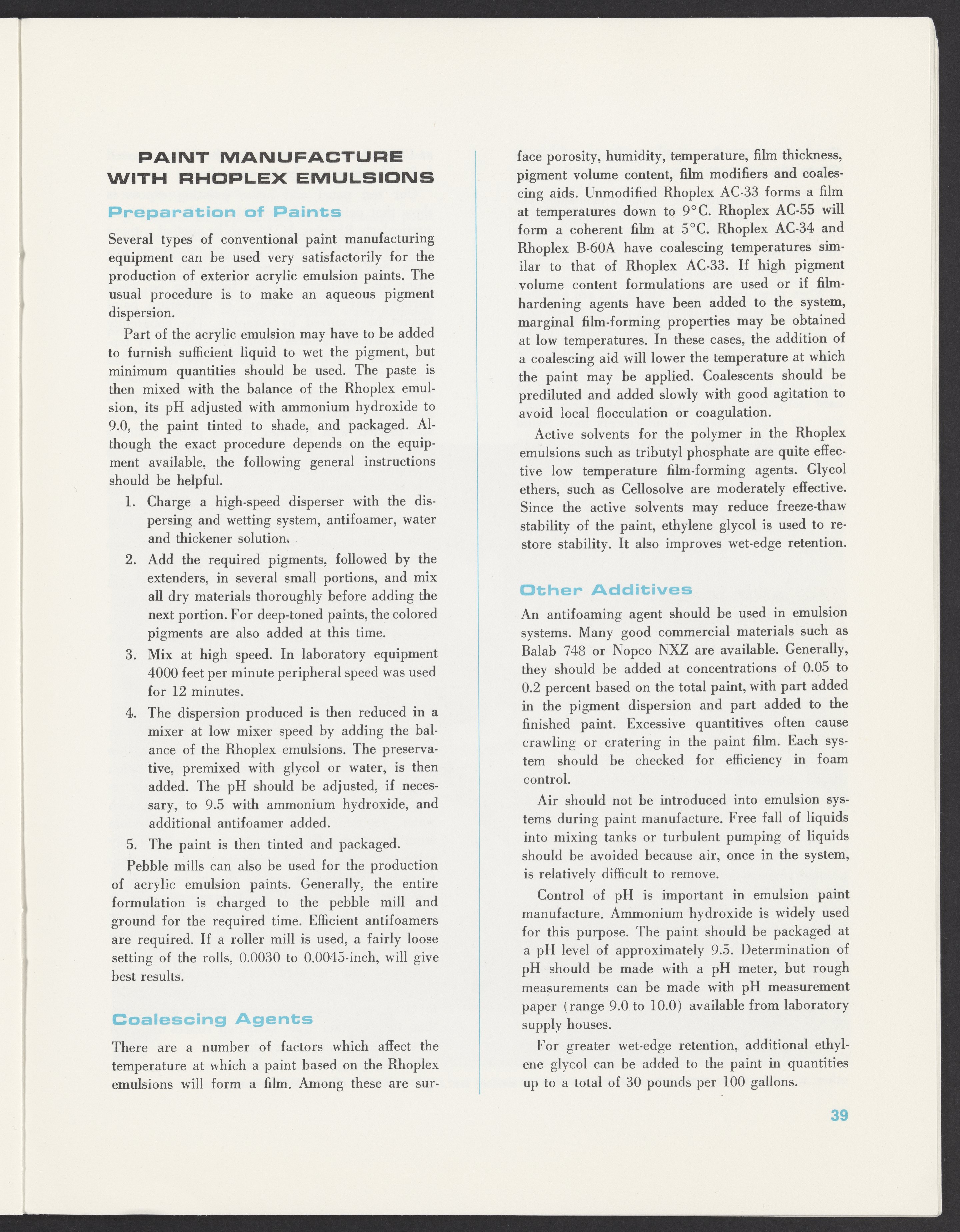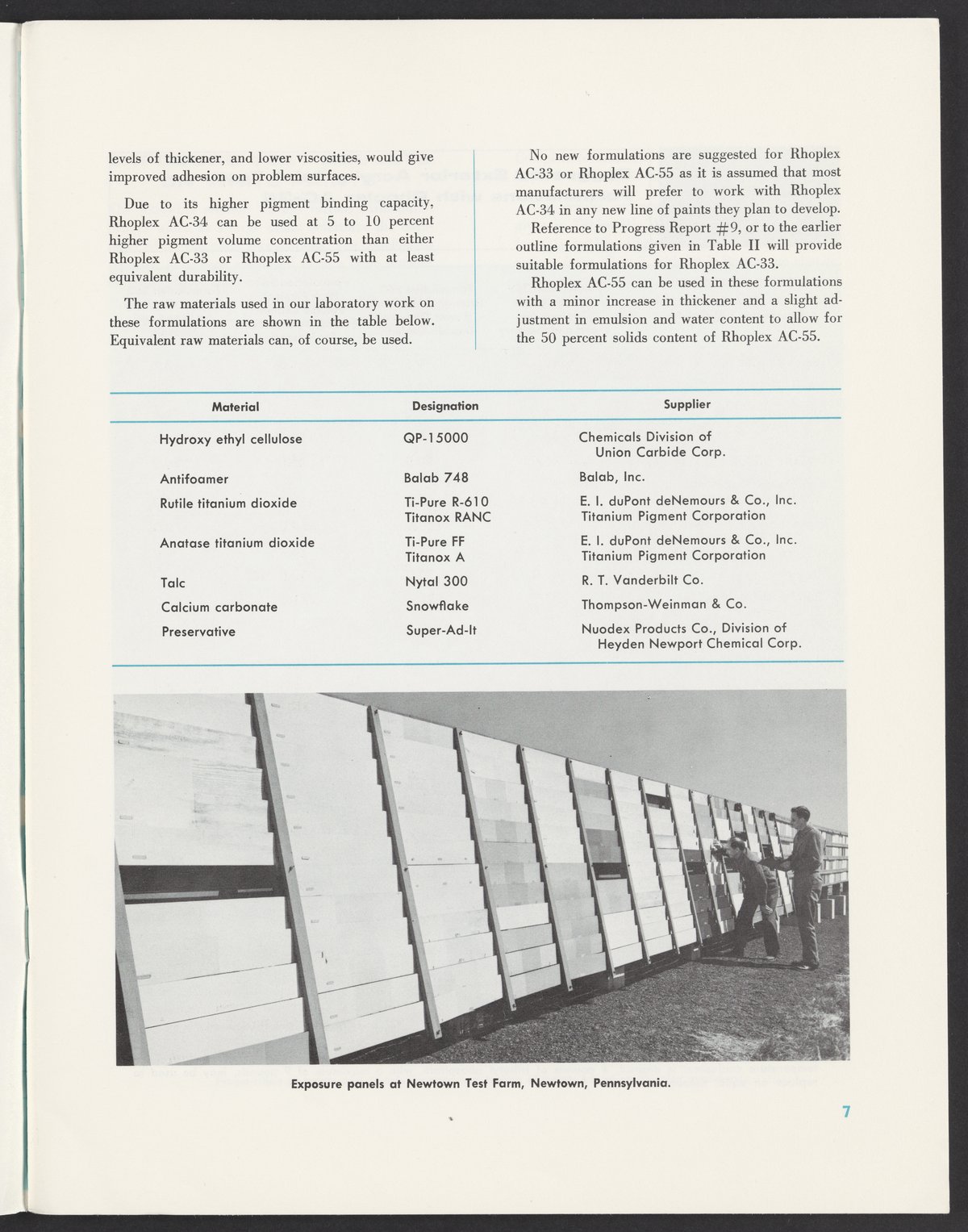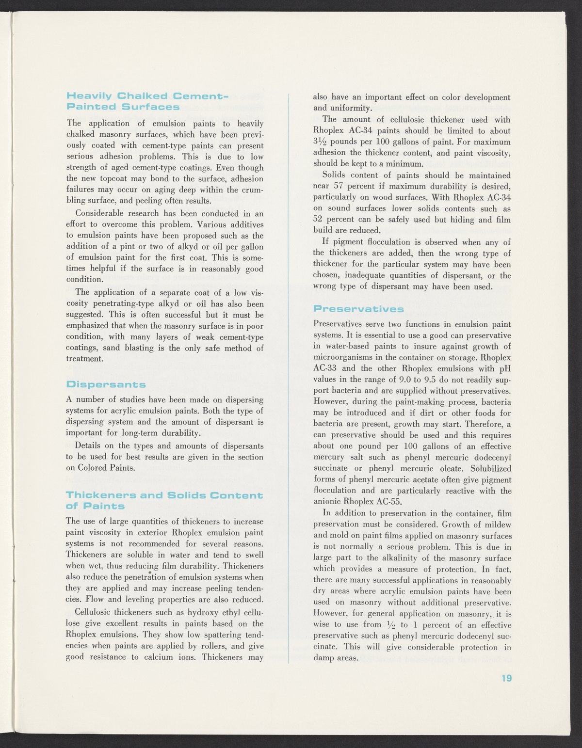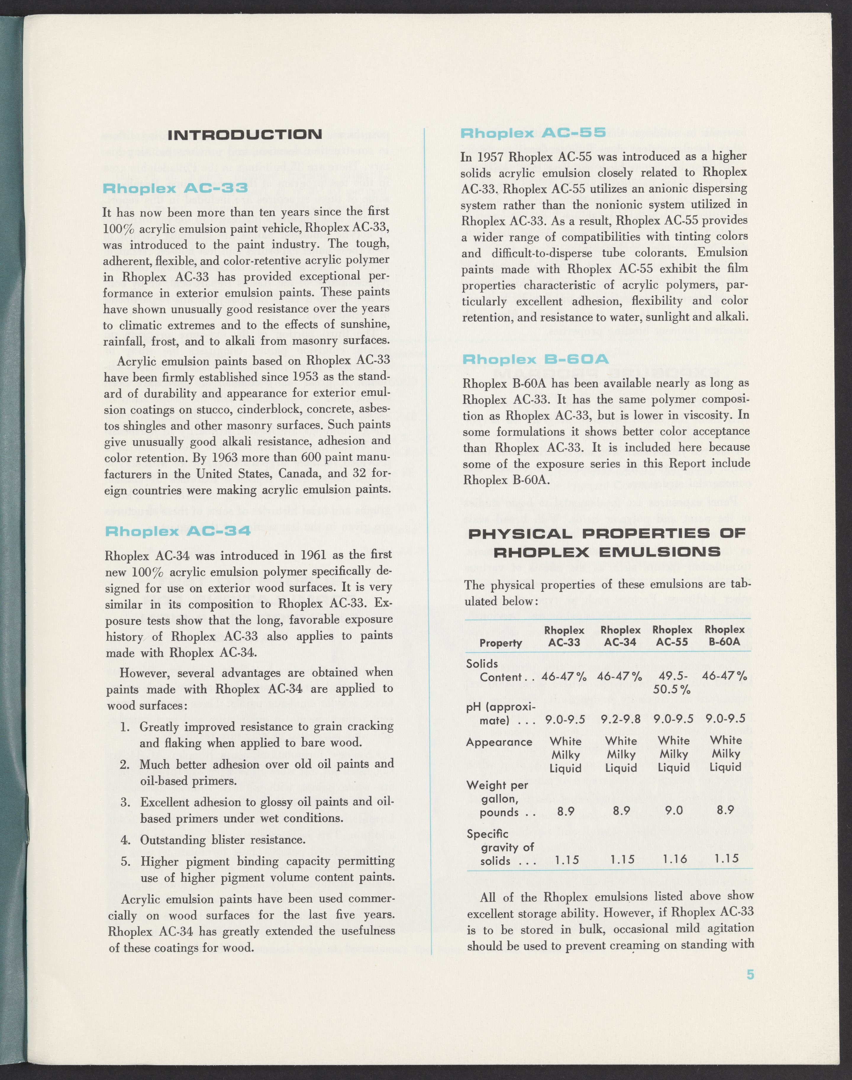 Rohm and Haas Company. “Rhoplex Acrylic Emulsions for Outdoor Paints.” Rohm and Haas Company. Resins Department, 1963. TP934.R64 1963. Science History Institute. Philadelphia. https://digital.sciencehistory.org/works/4lfyvpa.