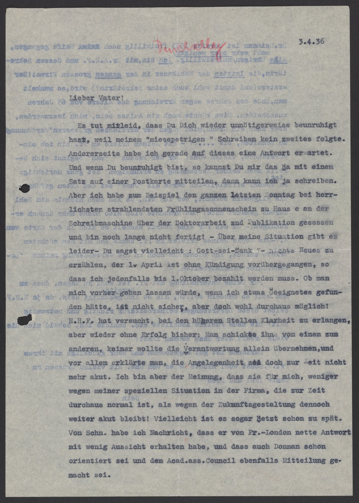 H.H.F hat versucht, bei dem höheren Stellen Klarheit zu erlangen, aber wieder ohne Erfolg bisher. Man schickte ihn von einem zum anderen, keiner wollte die Verantwortung allein übernehmen, und vor allem erklärte man, die Angelegenheit sei doch nur zur Zeit nicht mehr akut. Ich bin aber der Meinung, dass sie für mich, weniger wegen meiner speziellen Situation in der Firma, die zur Zeit durchaus normal ist, als wegen der Zukunftsgestaltung dennoch weiter akut bleibt! Vielleicht ist es sogar jetzt schon zu spät. Von Schn. habe ich Nachricht, dass er von Fr.- London nette Antwort mit wenig Aussicht erhalten haben und dass auch Donnan schon orientiert sei und dem Acad.ass.Council ebenfalls Mitteilung gemacht sei.
