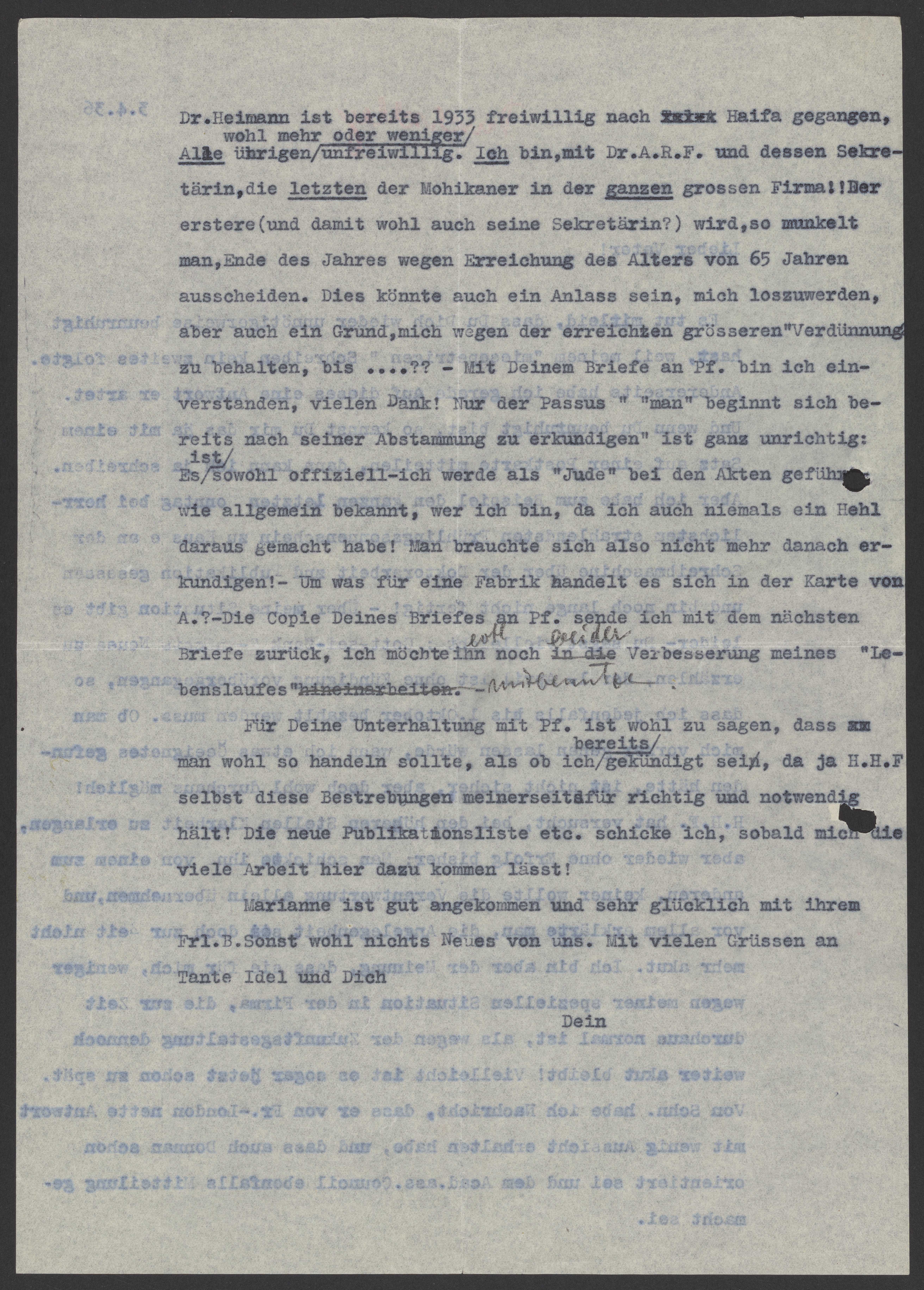 Dr. Heimann ist bereits 1933 freiwillig nach Haifa gegangen, Alle übrigen wohl mehr oder wenig unfreiwillig. Ich bin, mit Dr. A.R.F. und dessen Sekretärin, die letzten der Mohikaner in der ganzen grossen Firma!! Der erstere (und damit wohl auch sein Sekretärin?) wird, so munkelt man, Ende des Jahres wegen Erreichung des Alters von 65 Jahren ausscheiden. Dies könnte auch ein Anlass sein, mich loszuwerden, aber auch ein Grund, mich wegen der erreichten grösseren Verdünnung zu behalten, bis ….?? – Mit Deinem Briefe an Pf. Bin ich einverstanden, vielen Dank! Nur der Passus " "man" beginnt sich bereits nach seiner Abstammung zu erkundigen" ist ganz unrichtig: Es ist sowohl offiziell – ich werde als "Jude" bei den Akten geführt, wie allgemein bekannt, wer ich bin, da ich auch niemals ein Hehl daraus gemacht habe! Man brauchte sich also nicht mehr danach erkundigen! – Um was für eine Fabrik handelt es sich in der Karte von A.? – Die Copie Deines Briefes an Pf. sende ich mit dem nächsten Briefe zurück., ich möchte ihn evtl. noch bei der Verbesserung meines „Lebenslaufes“ hineinarbeiten.
