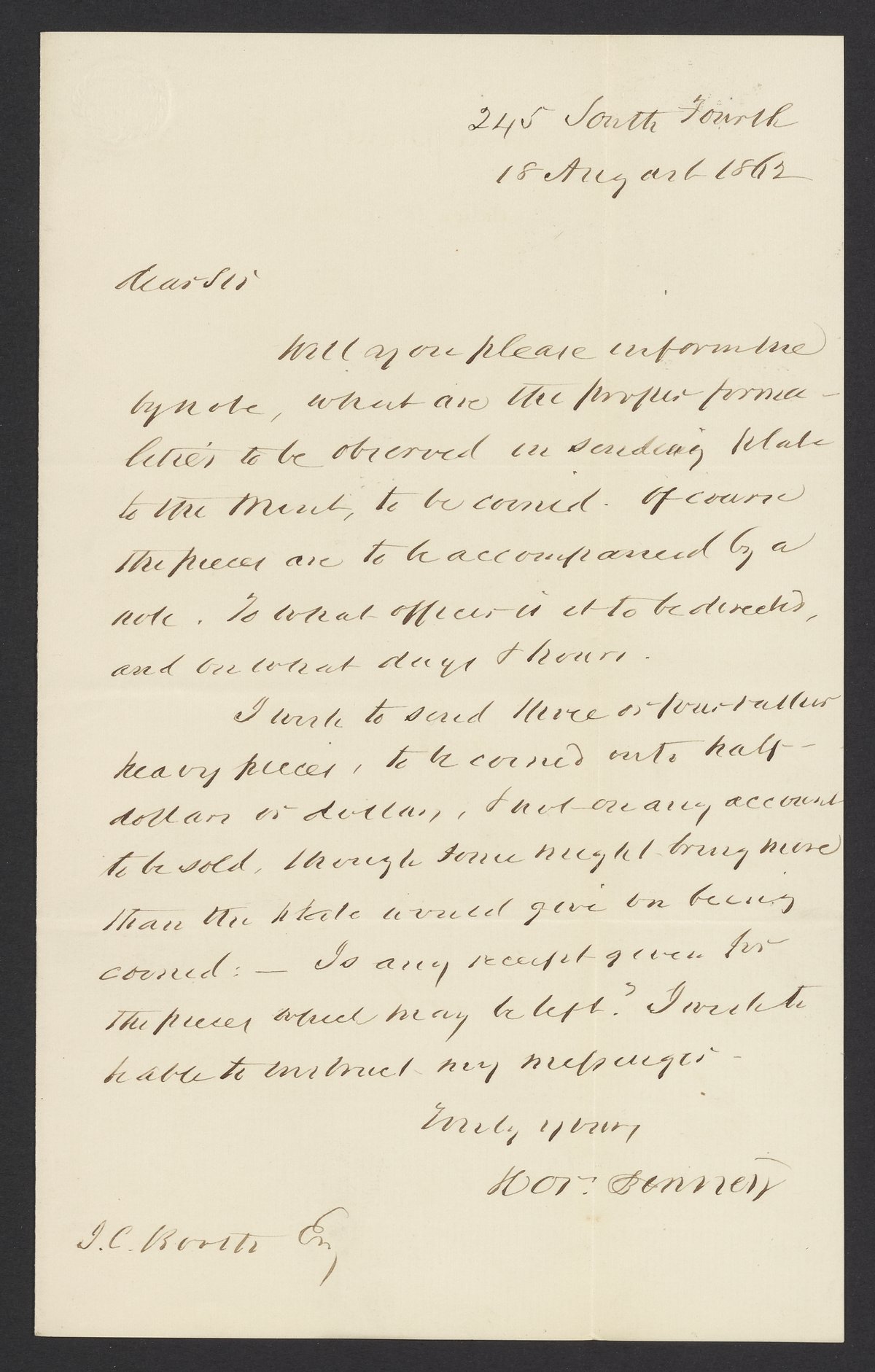 Letter from Horace Binney to James Curtis Booth, August 18, 1862