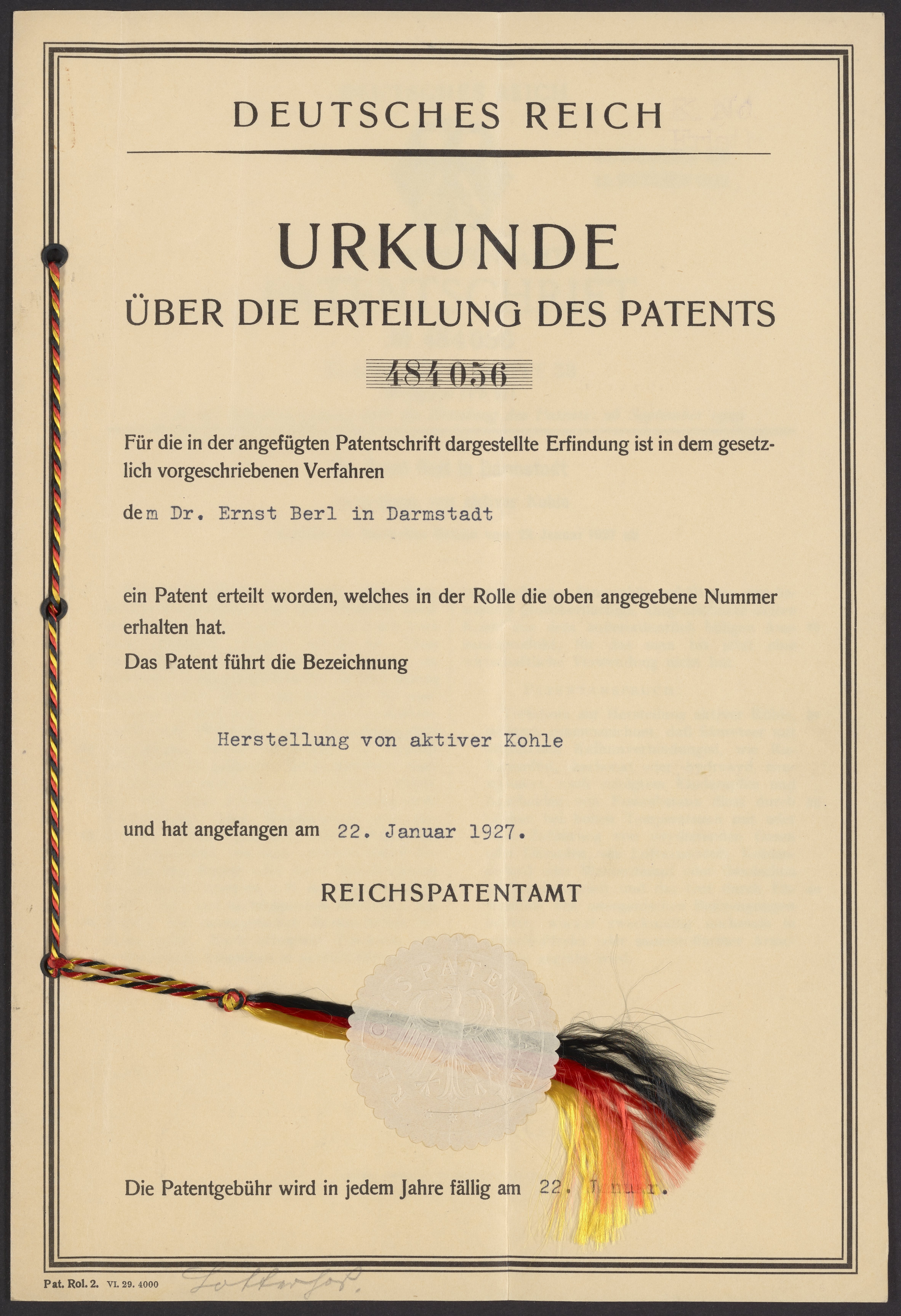 German patent #484056 for the production of activated carbon, awarded to Ernst Berl (1877-1946).
