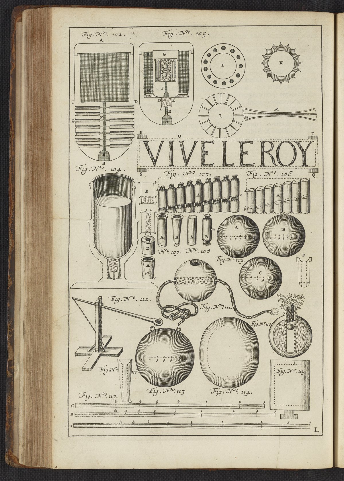 Siemienowicz, Kazimierz. “Plate L: Fireballs Shot from a Mortar; Crackers; Military Hand Grenades; Military Mortar-Fired Grenades; Military Grenade Parts and Instruments.” In Artis Magnae Artilleriae. Amsterdam, Netherlands: Jan Jansson, 1650. https://digital.sciencehistory.org/works/4q77fr380.