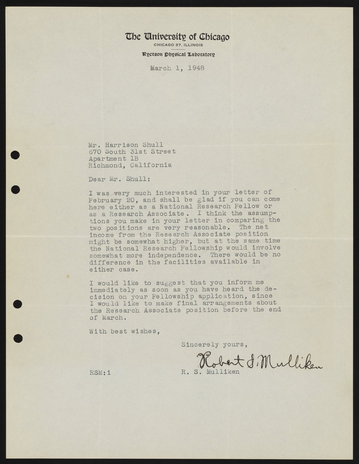 Letter from Robert S. Mulliken to Harrison Shull, 1948