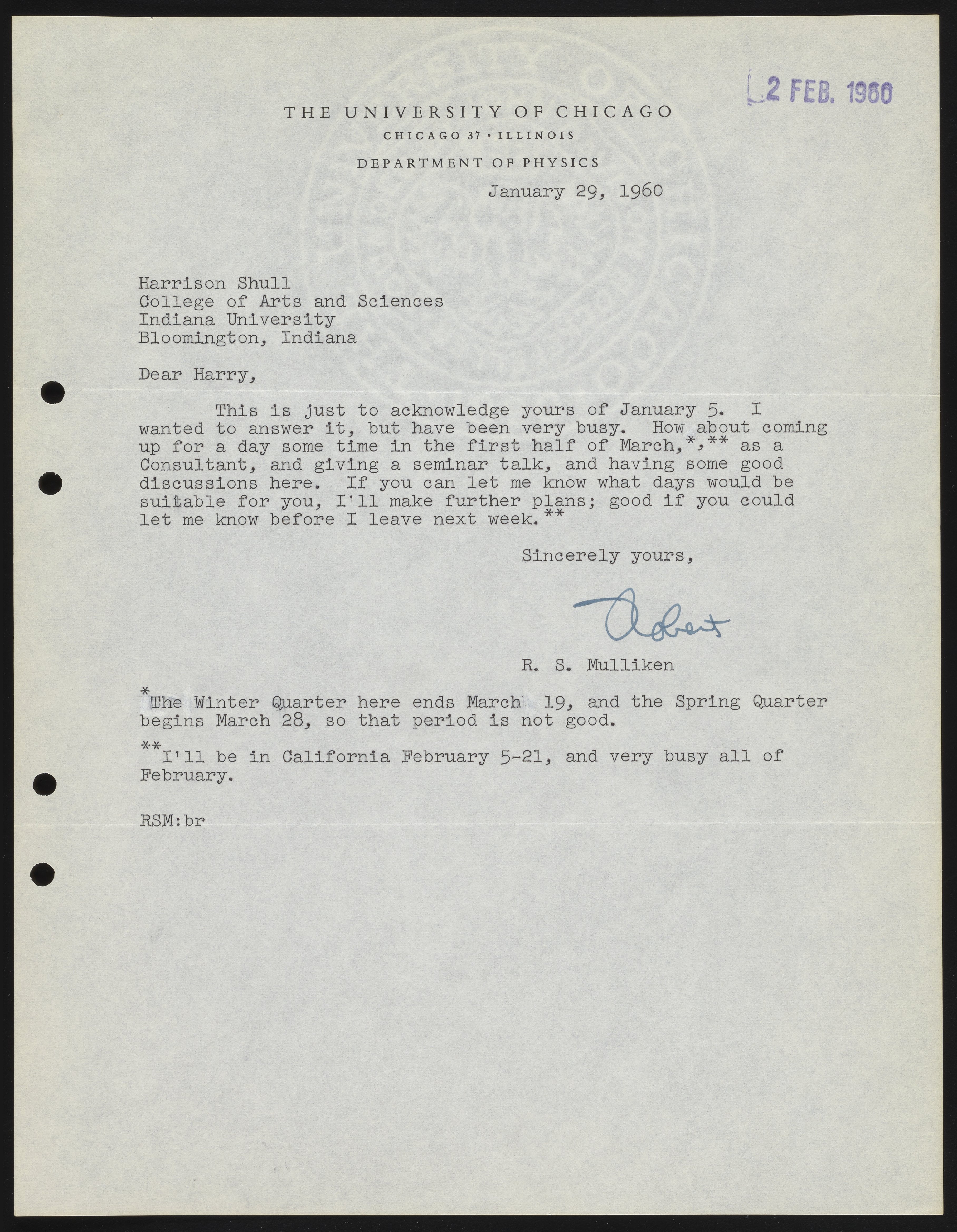 Mulliken, Robert Sanderson. “Letter from Robert S. Mulliken to Harrison Shull, 1960,” January 29, 1960. Robert S. Mulliken & Harrison Shull Correspondence, Box 1. Science History Institute. Philadelphia. https://digital.sciencehistory.org/works/4q77fr42k.