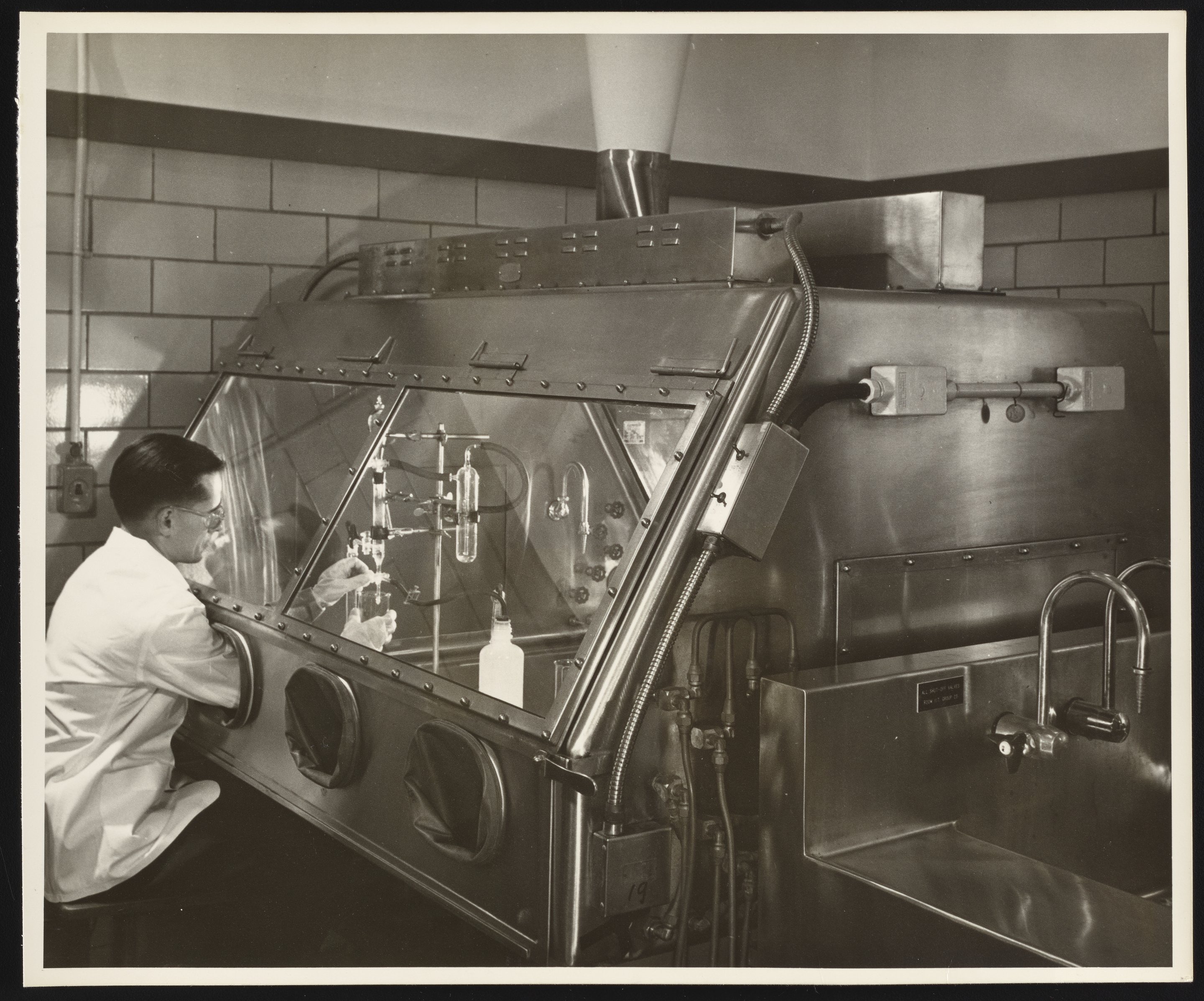 General view of an unidentified technician working within a stainless steel hood used to grow experimental plants at the Dow Chemical Company's Spectroscopy Laboratory. At the laboratory, radioactive isotopes were used to study the effects of various agricultural chemicals on plants.