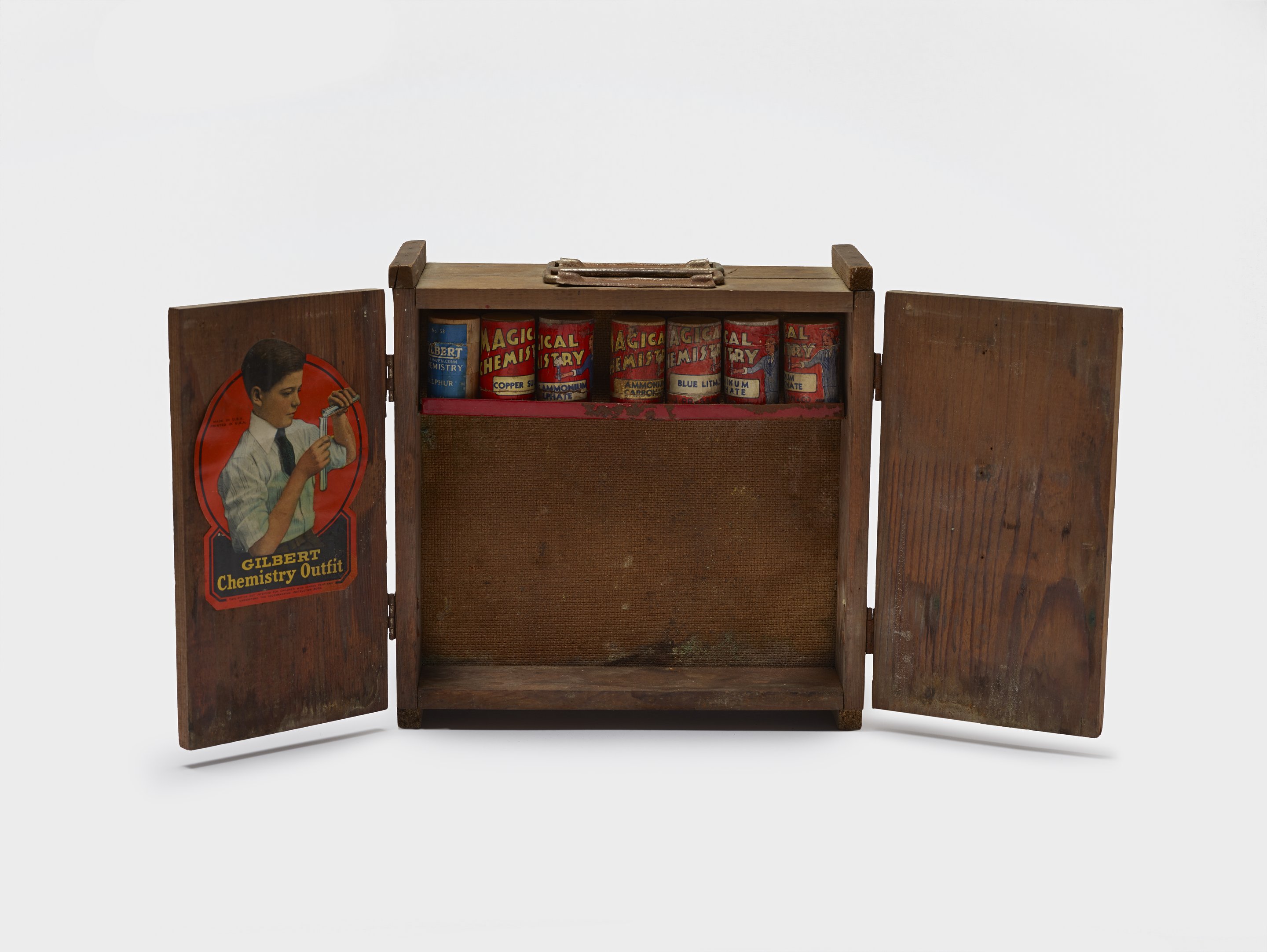 Small JPG1200 x 902px — 114 KBLarge JPG2880 x 2165px — 492 KBFull-sized JPG10330 x 7765px — 5.1 MBOriginal fileTIFF — 10330 x 7765px — 230 MBWooden case with two steel handles on top and cabinet doors on both sides which are secured with a steel latch; on one side, case inside has a steel red shelf with seven wooden chemical containers; below the shelf is a cardboard test-tube rack with the following: two corked glass test-tubes filled with chemicals; steel tongs; steel scoop; green glass stir rod; steel spoon; and a test-tube with a corked top and glass tube insert; on the right door are two packages of litmus and sulfide test paper and circular pieces of circular paper; packages and paper are fastened to the door with steel pins; the other side of the case has the same red steel shelf with seven wooden chemical containers; set contains the following chemicals: