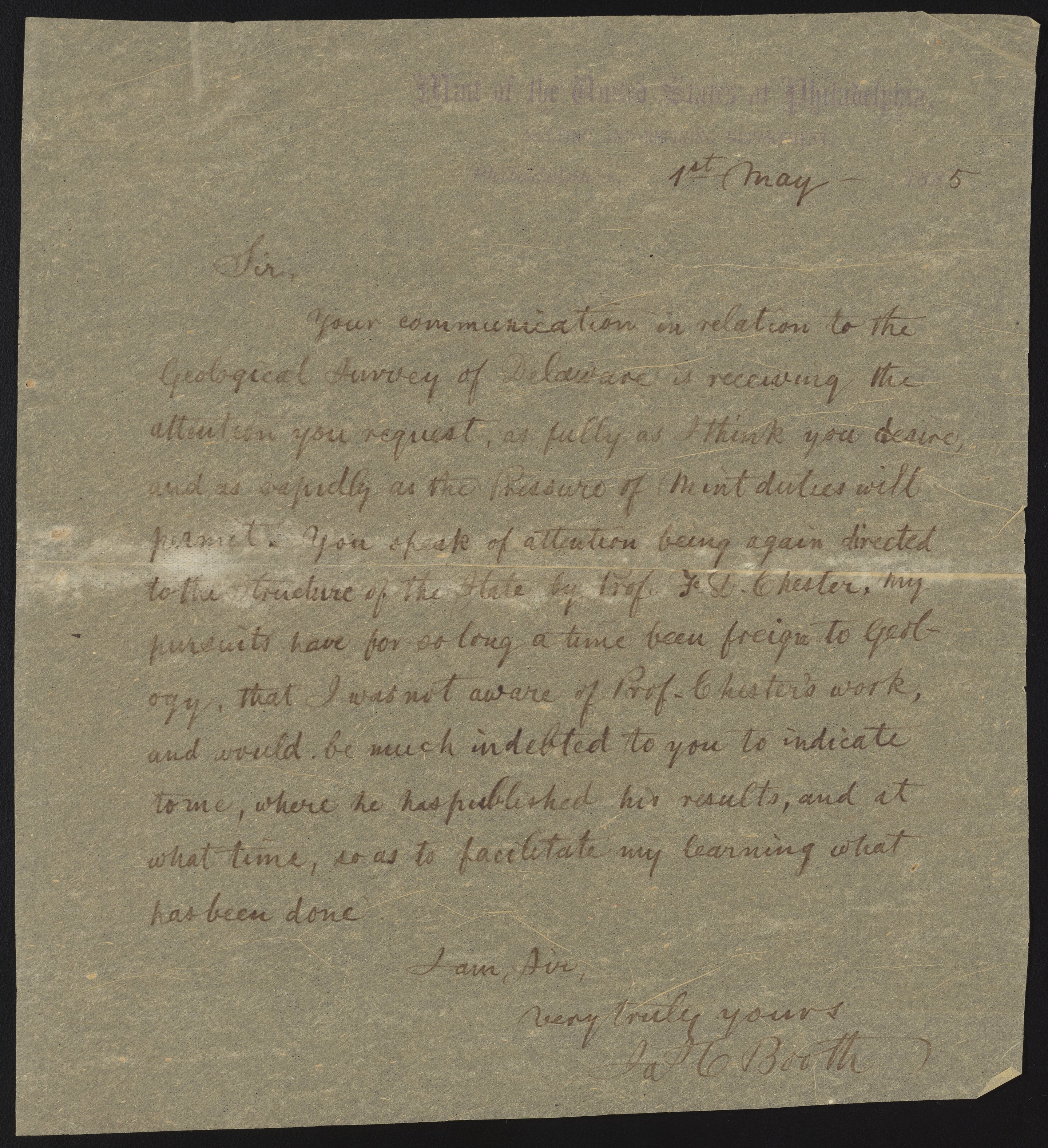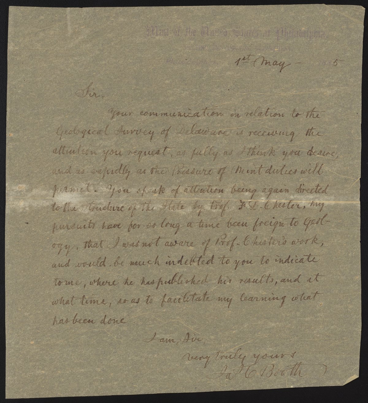 Letter from James Curtis Booth to John Wesley Powell