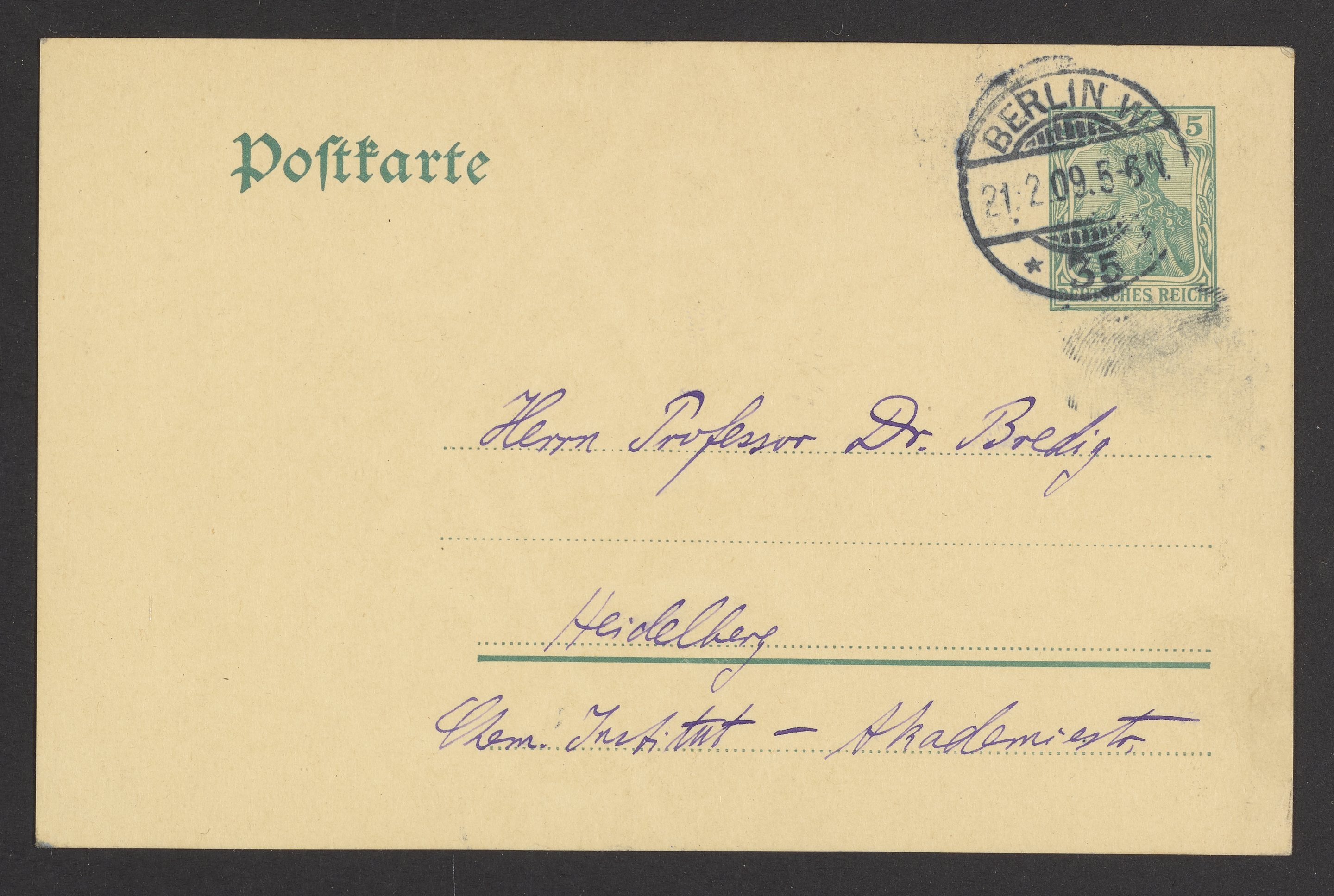 Taevby, Martin. “Postcard to Georg Bredig from Martin Taevby,” February 27, 1909. Papers of Georg and Max Bredig, Box 3, Folder 20. Science History Institute. Philadelphia. https://digital.sciencehistory.org/works/4rlrn83.