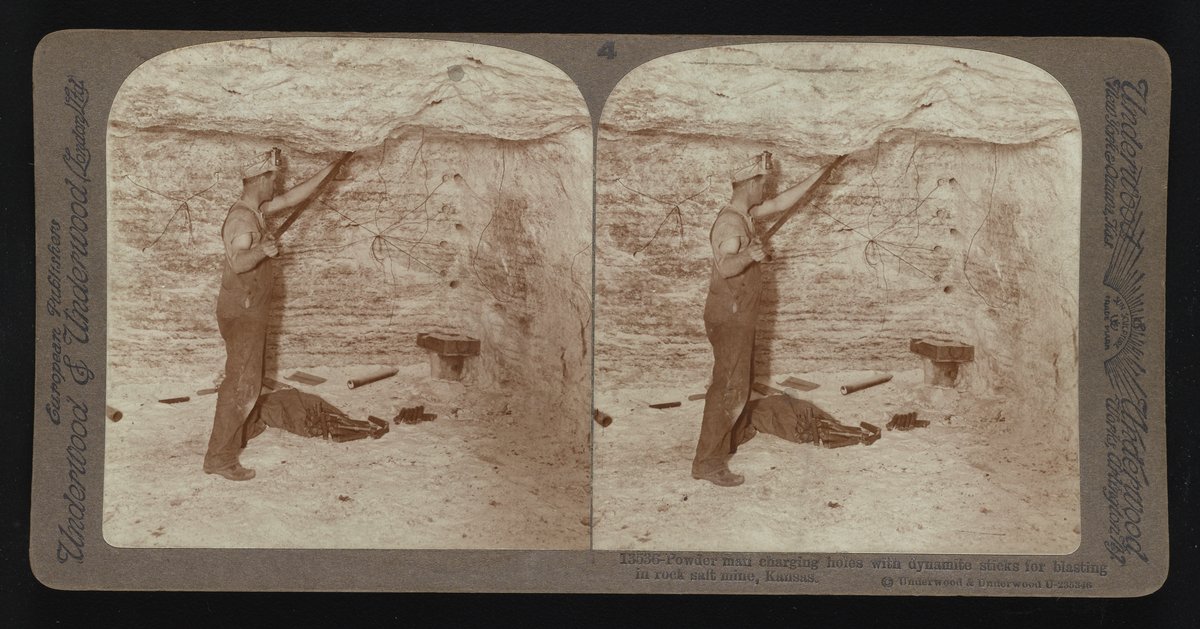“Powder Man Charging Holes with Dynamite Sticks for Blasting in Rock Salt Mine, Kansas.” Underwood & Underwood, n.d. Underwood & Underwood Stereographs of Manufacturing Industries. Science History Institute. Philadelphia. https://digital.sciencehistory.org/works/4t64gn17g.