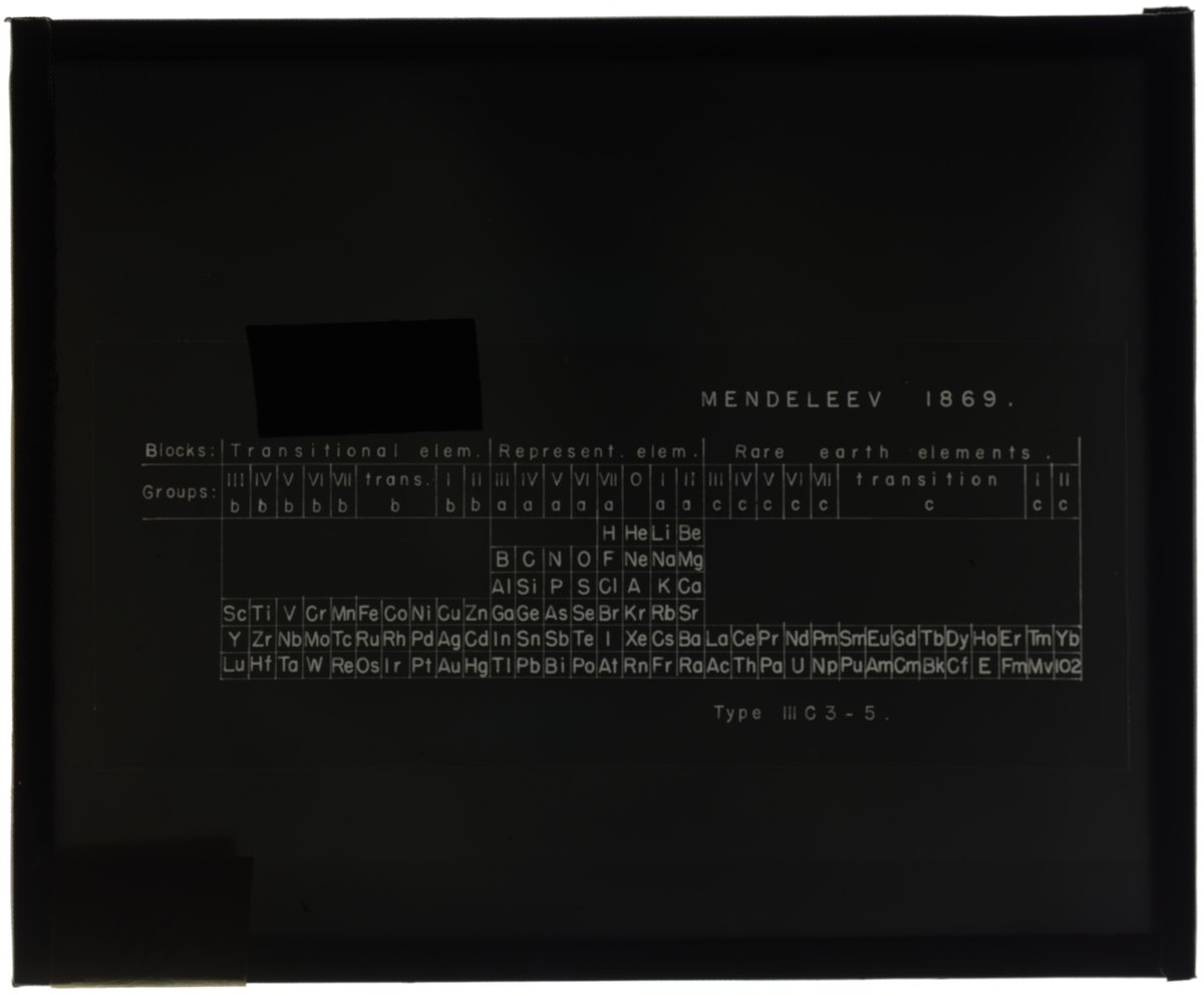 Left-step series table designed by Dmitri Mendeleev1871 (Original design), 1957 – circa (Date attributed to slide)