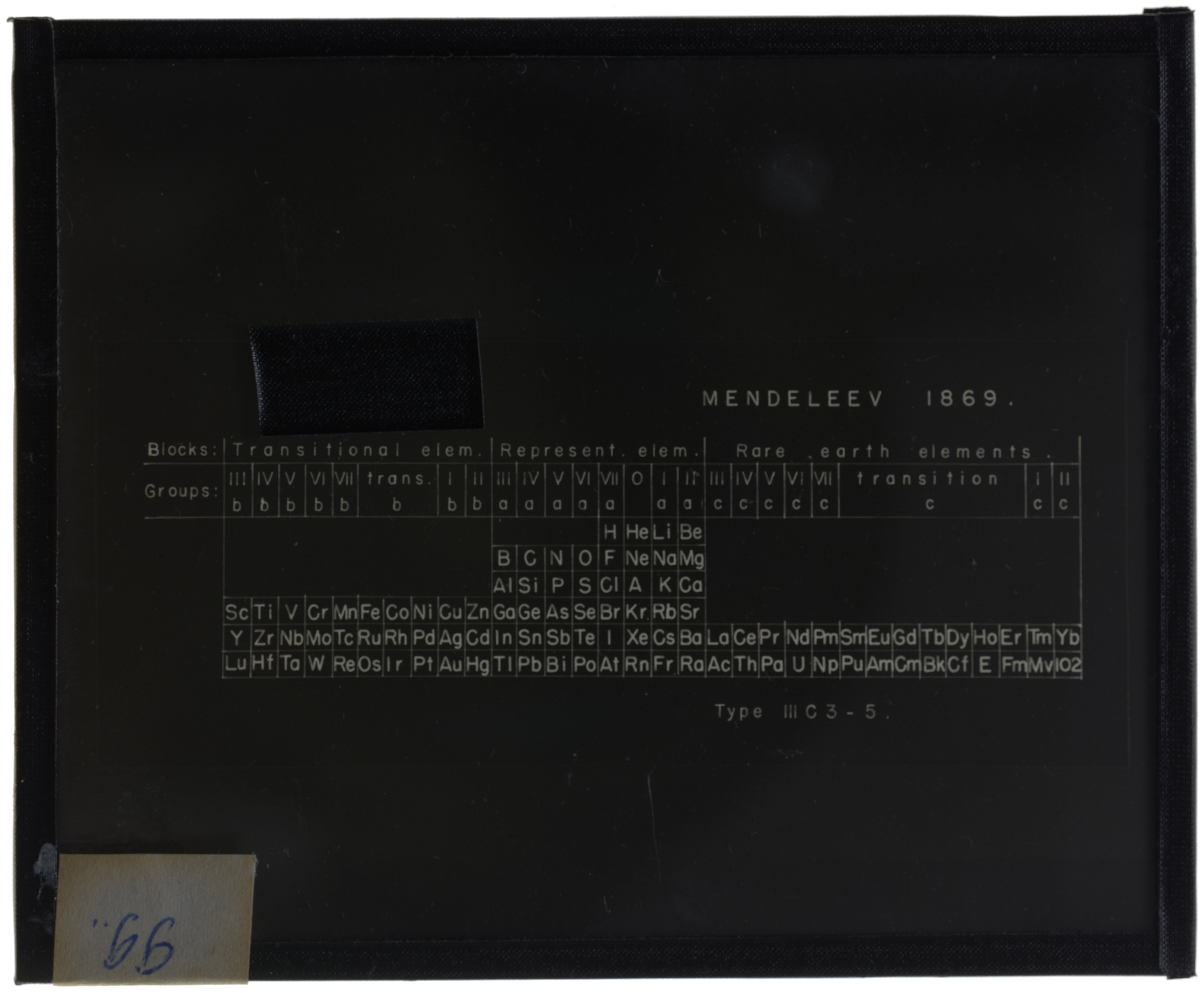 Symmetrical series table by Dmitri Mendeleev1870 (Original design), Circa 1957 (Date attributed to slide)