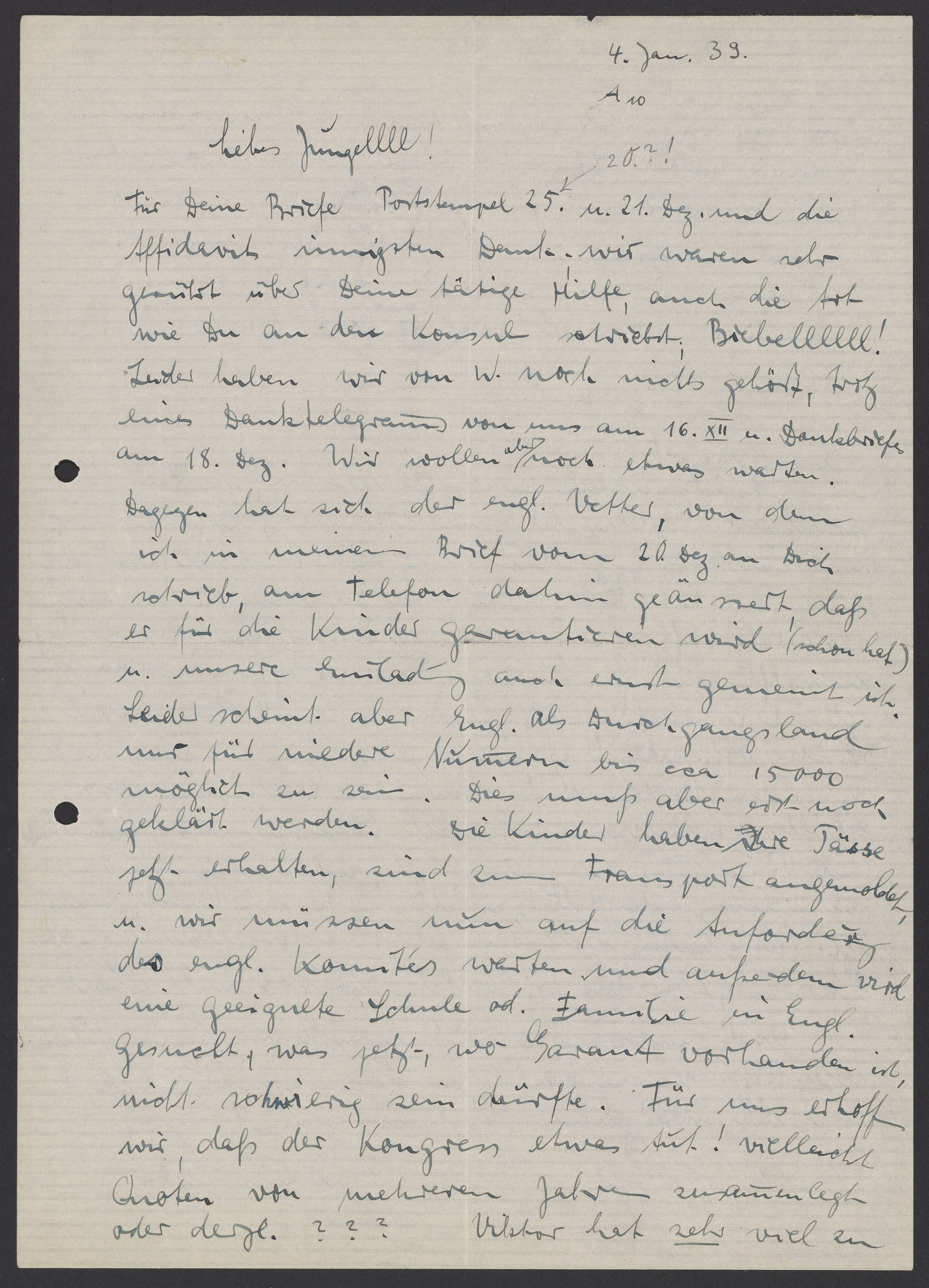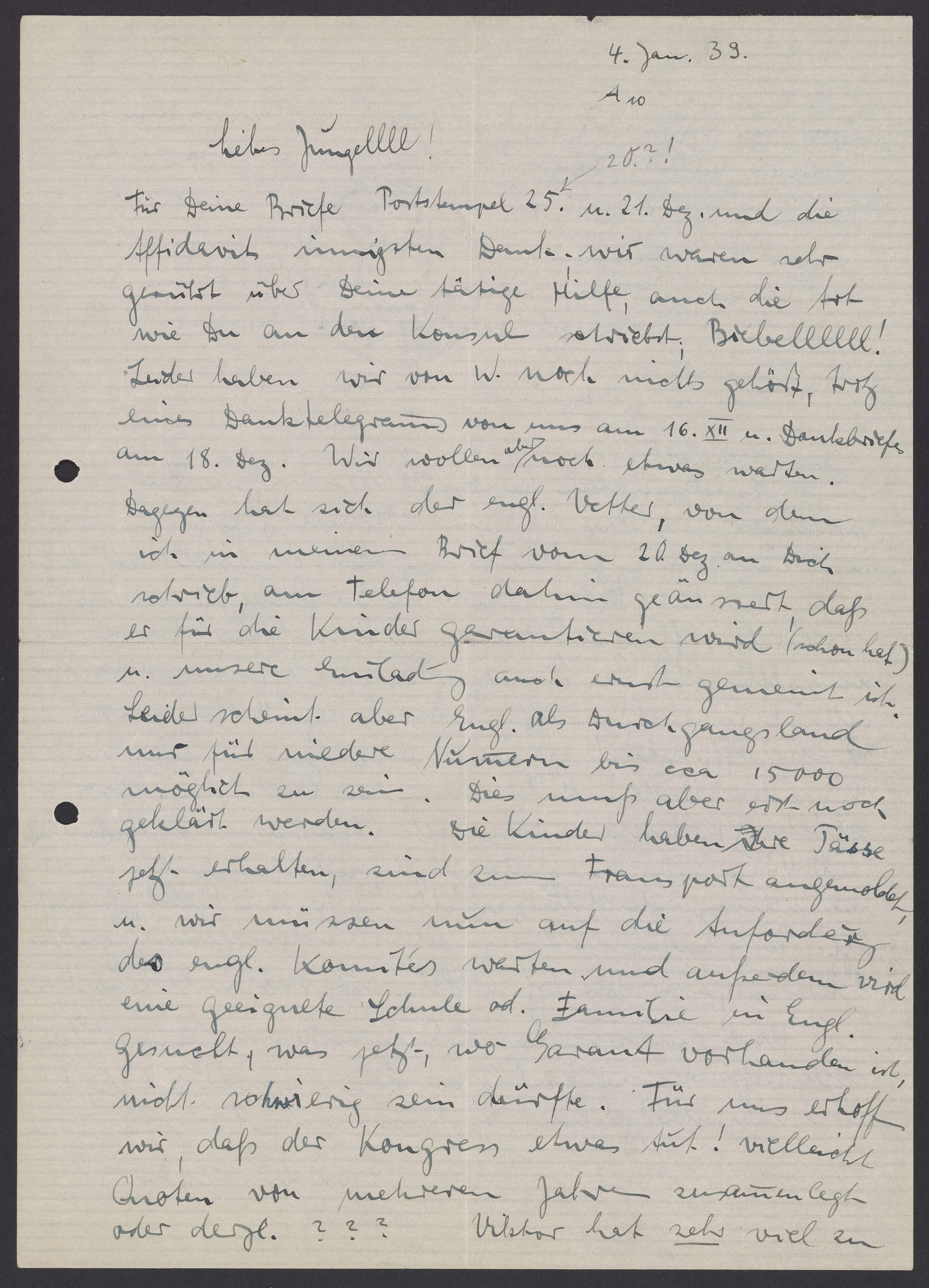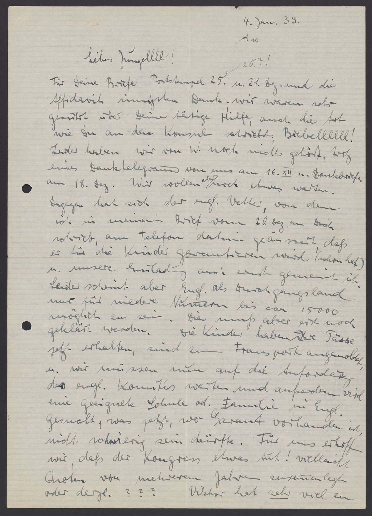 Dagegen hat sich der engl. Vetter, von dem ich in meinem Brief vom 20 Dez. an Dich schrieb, am Telefon dahin geäußert, dass er für die Kinder garantieren wird (schon hat) u. unsere Einladung auch ernst gemeint ist. Leider scheint Engl. als Durchgangsland nur für niedere Nummern bis ca 15000 möglich zu sein. Dies muss aber erst noch geklärt werden. Die Kinder haben ihre Pässe jetzt erhalten, sind zum Transport angemeldet, u. wir müssen nun auf die Anforderung des engli. Kommites warten und außerdem wird eine geeignete Schule oder Familie in Engl. Gesucht, was jetzt, wo Garantie vorhanden ist, nicht schwierig sein dürfte. Für uns erhoffen wir, dass der Kongress etwas tut! Vielleicht Quoten von mehreren Jahren zusammen oder dergl.??? Viktor hat sehr viel zu tun!