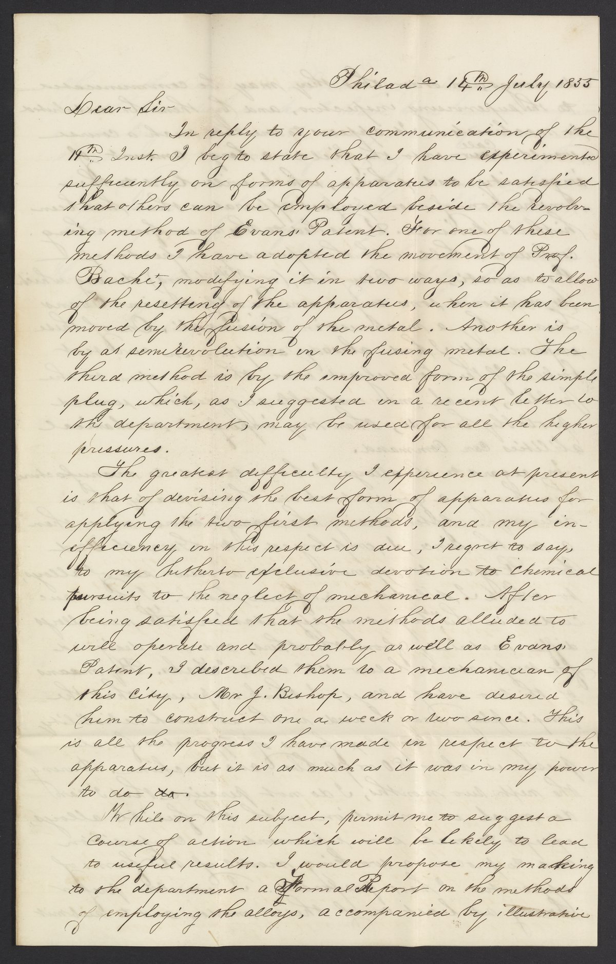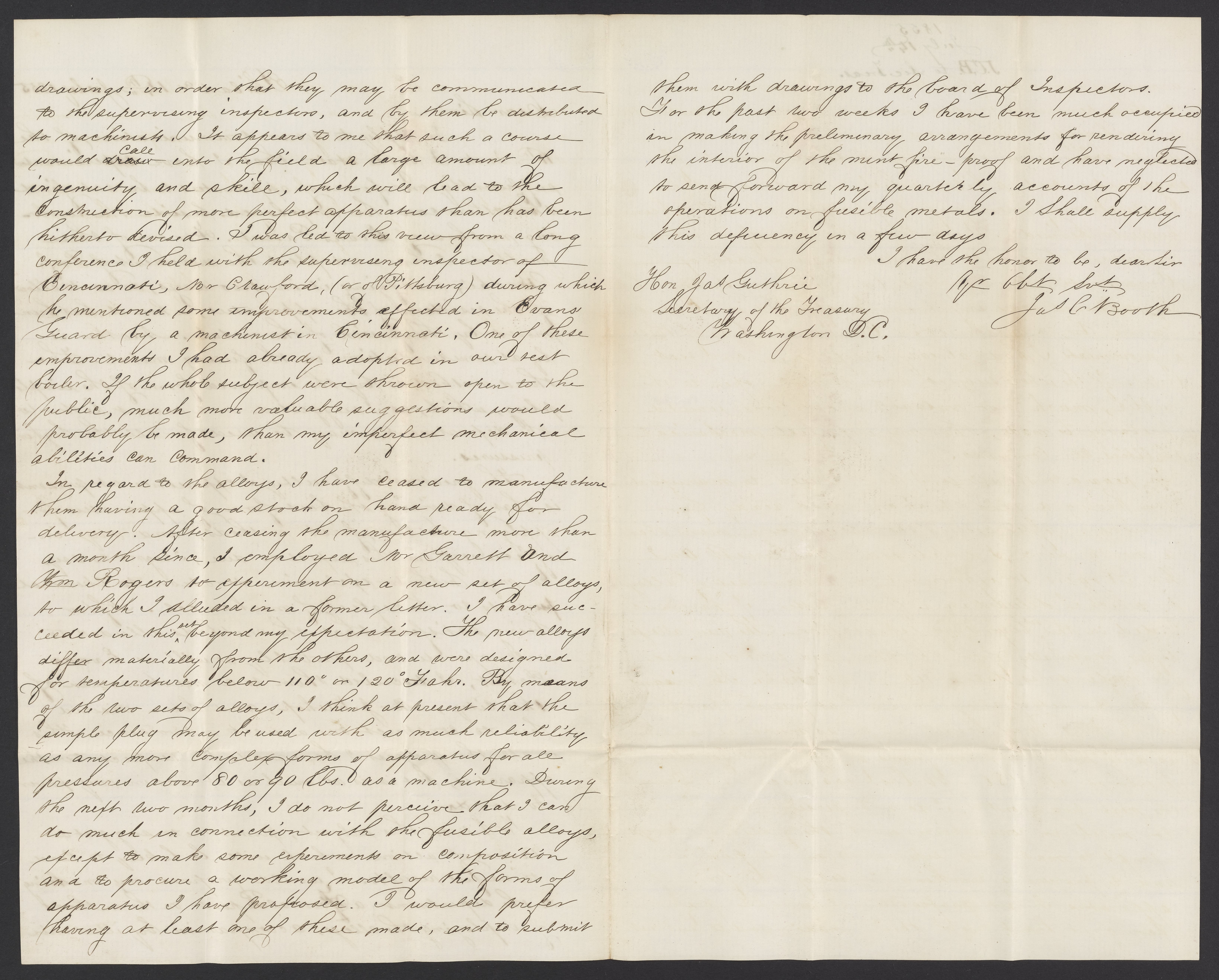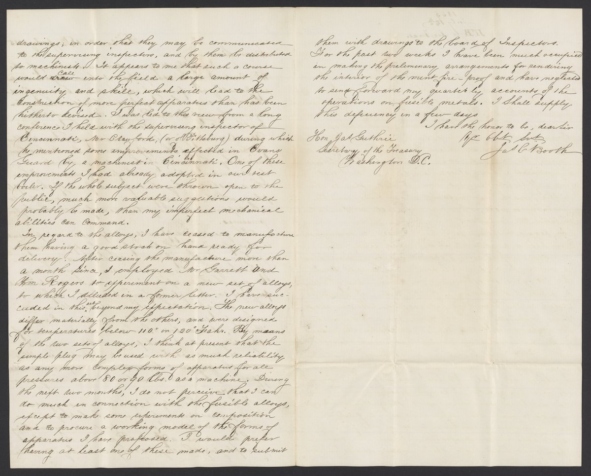 Small JPG1200 x 1878px — 404 KBLarge JPG2880 x 4506px — 1.6 MBFull-sized JPG3361 x 5259px — 2.0 MBOriginal fileTIFF — 3361 x 5259px — 50.6 MBJames Curtis Booth (1810-1888), melter and refiner of the United States Mint, writes to James Guthrie (1794-1869), Secretary of the Treasury, to discuss alternatives to the fusible alloy production process patented by Evans.