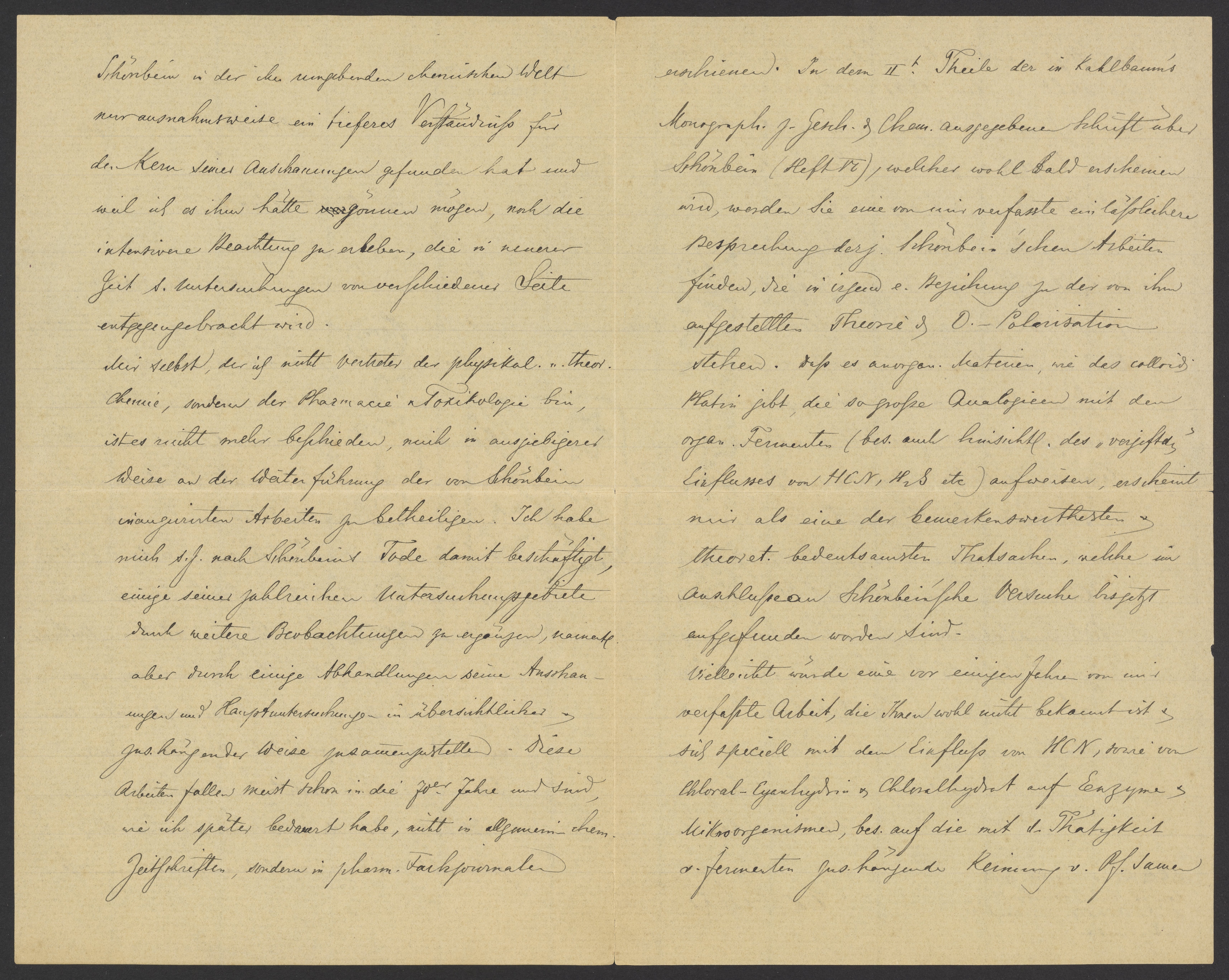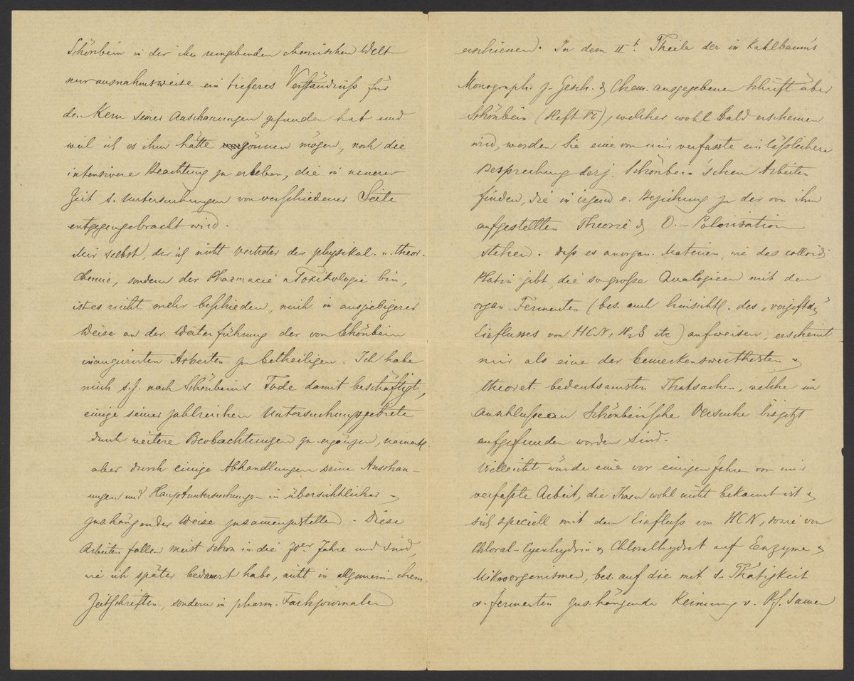 In dem IIten Theile der Kahlbaums Monographie zur Geschichte der Chemie ausgegeben Schrift über Schönbein (Heft VI), welcher wohl bald erscheinen wird, werden Sie eine von mir verfasste einlässlichere Besprechung derjenigen Schönbein‘schen Arbeiten finden, die in irgendeine Beziehung zu der von ihm aufgestellten Theorie von O. Polarisation stehen. Daß es anorganischen Materien, wie das colloidische Platin gibt, die so große Analogien mit den organischen Fermenten (besonders auch hinsichtlich des „verjagtes Einflusses von HCN, H2O, etc) aufweisen, erscheint mir als eine der bemerkenswerthesten theoretischen bedeutsamsten Thatsachen, welche im Anschlüsse an Schönbein’sche Versuche bis jetzt aufgefunden worden sind.