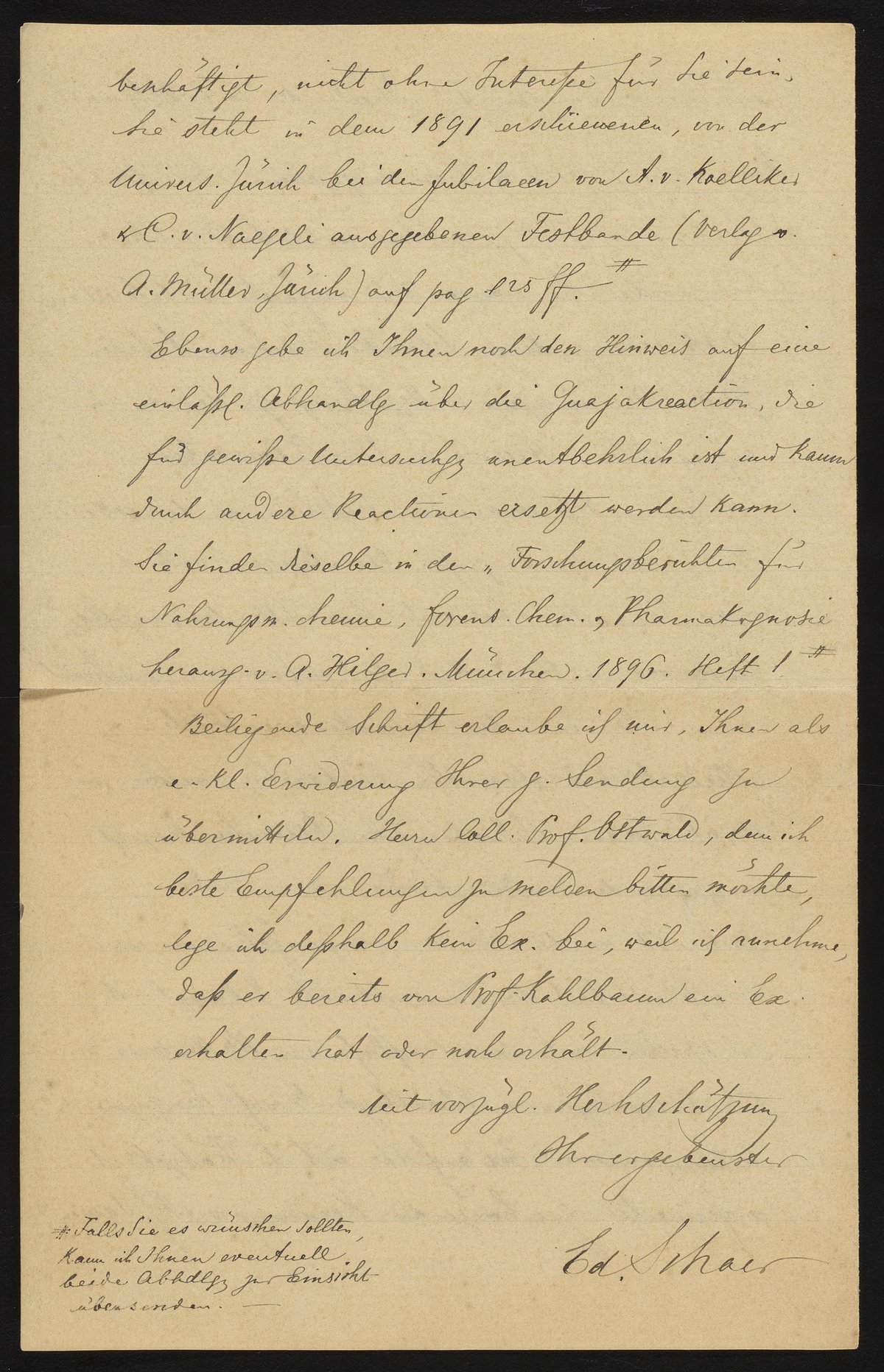 Beiliegende Schrift erlaube ich mir, Ihnen als eine kleine Erwiderung Ihrer geehrten Sendung zu übermitteln Herr Professor Ostwald, dem ich beste Empfehlungen zu melden bitten möchte, lege ich deshalb kein Exemplar bei, weil ich annehme, dass er bereits von Professor Kahlbaum ein Exemplar erhalten hat oder noch erhält.