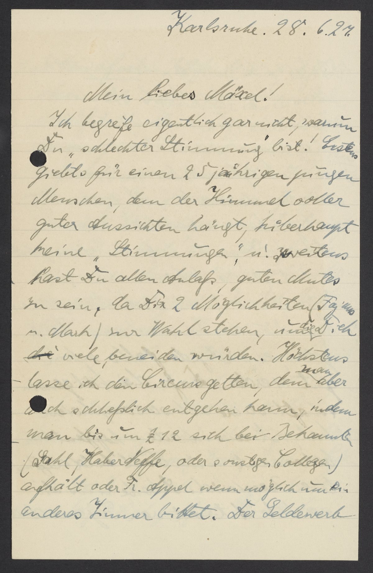Ich begreife eigentlich gar nicht, warum Du „schlechter Stimmung“ bist! Erstens giebts für einen 25[-]jährigen jungen Menschen, dem der Himmel voller guter Aussichten hängt, überhaupt keine „Stimmungen“, u. zweitens hast Du allen Anlaß, guten Mutes zu sein, da Dir 2 Möglichkeiten (Fajans u. Mark) zur Wahl stehen, um die Dich viele beneiden würden. Höchstens lasse ich den Circus gelten, dem man aber auch schließlich entgehen kann, indem man bis um ½ 12 sich bei Bekannten (Gahl, Haber-Neffe, oder sonstigen Collegen) aufhält oder Frau Appel wenn möglich um ein anderes Zimmer bittet. Der Gelderwerb