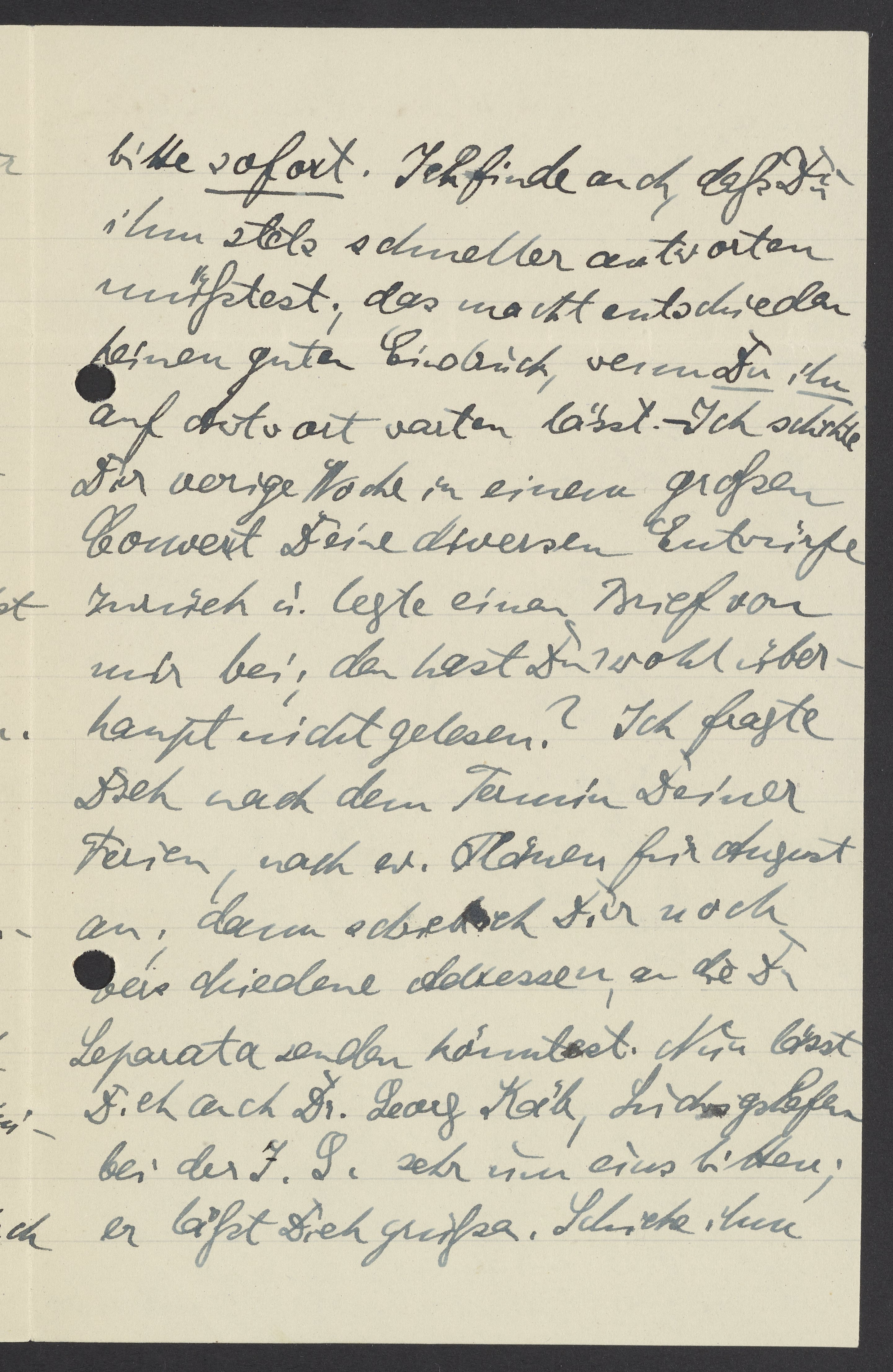 bitte sofort. Ich finde auch, daß Du ihm stets schneller antworten müßtest; das macht entschieden keinen guten Eindruck, wenn Du ihn auf Antwort warten lässt. – Ich schickte Dir vorige Woche in einem großen Couvert Deine diversen Entwürfe zurück u. legte einen Brief von mir bei; den hast Du wohl überhaupt nicht gelesen? Ich fragte Dich nach dem Termin Deiner Ferien, nach ev. Plänen für August an; dann schrieb ich Dir noch verschiedene Adressen, an die Du Separata senden könntest. Nun lässt Dich auch Dr. Georg Käb, Ludwigshafen bei der I. G. sehr um eins bitten; er läßt Dich grüßen. Schicke ihm