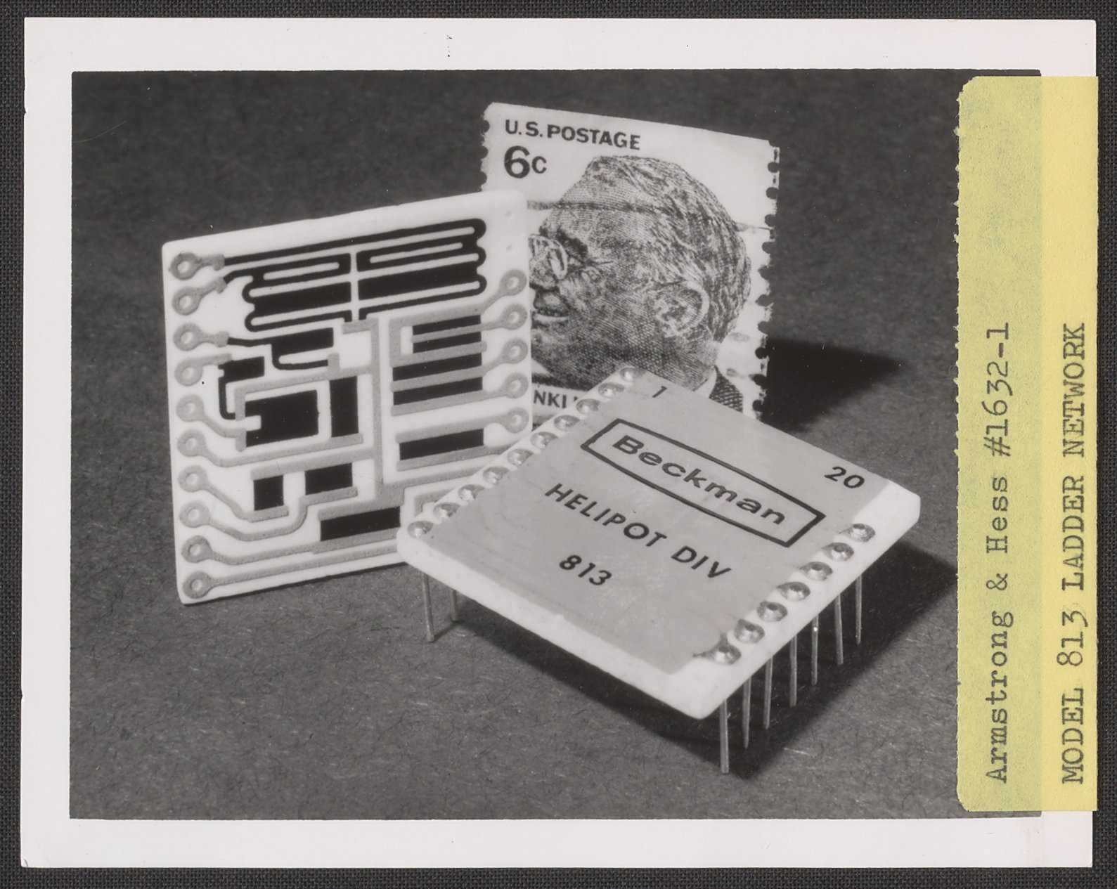 Armstrong & Hess. “Beckman Model 813 Ladder Network with Franklin Delano Roosevelt Stamp,” 1950–1969. Beckman Historical Collection, Box 85. Science History Institute. Philadelphia. https://digital.sciencehistory.org/works/4x51hj38g.