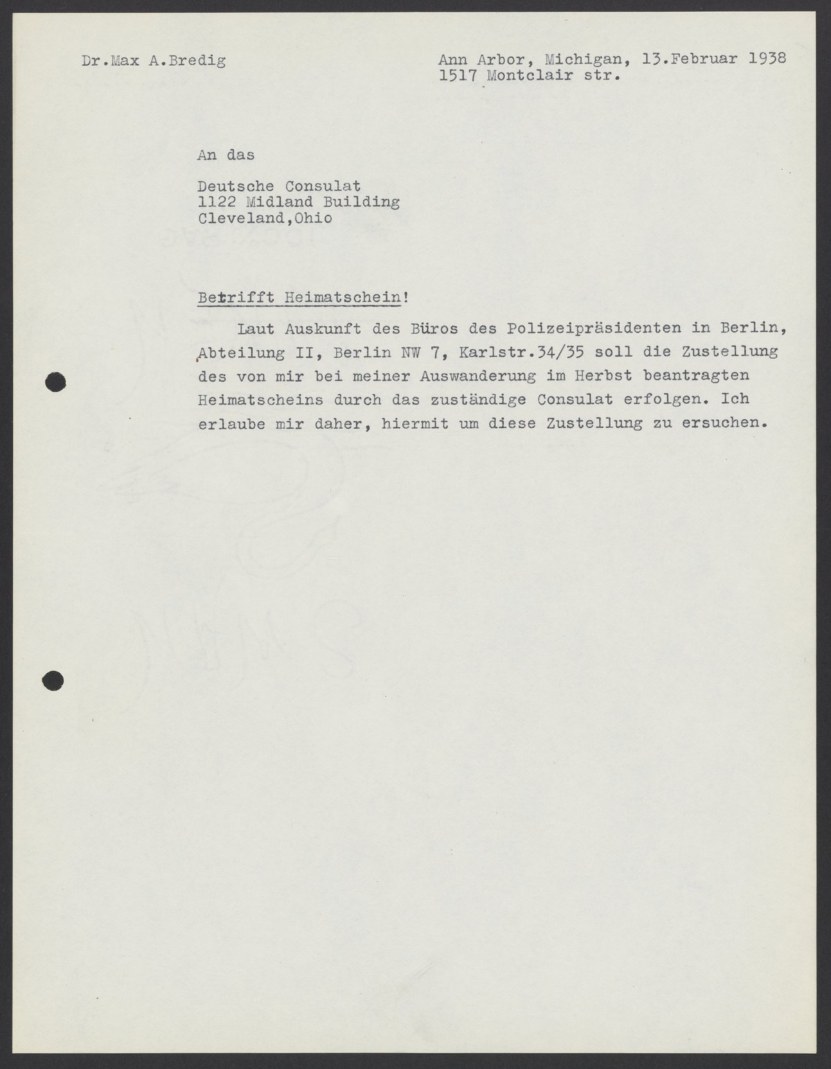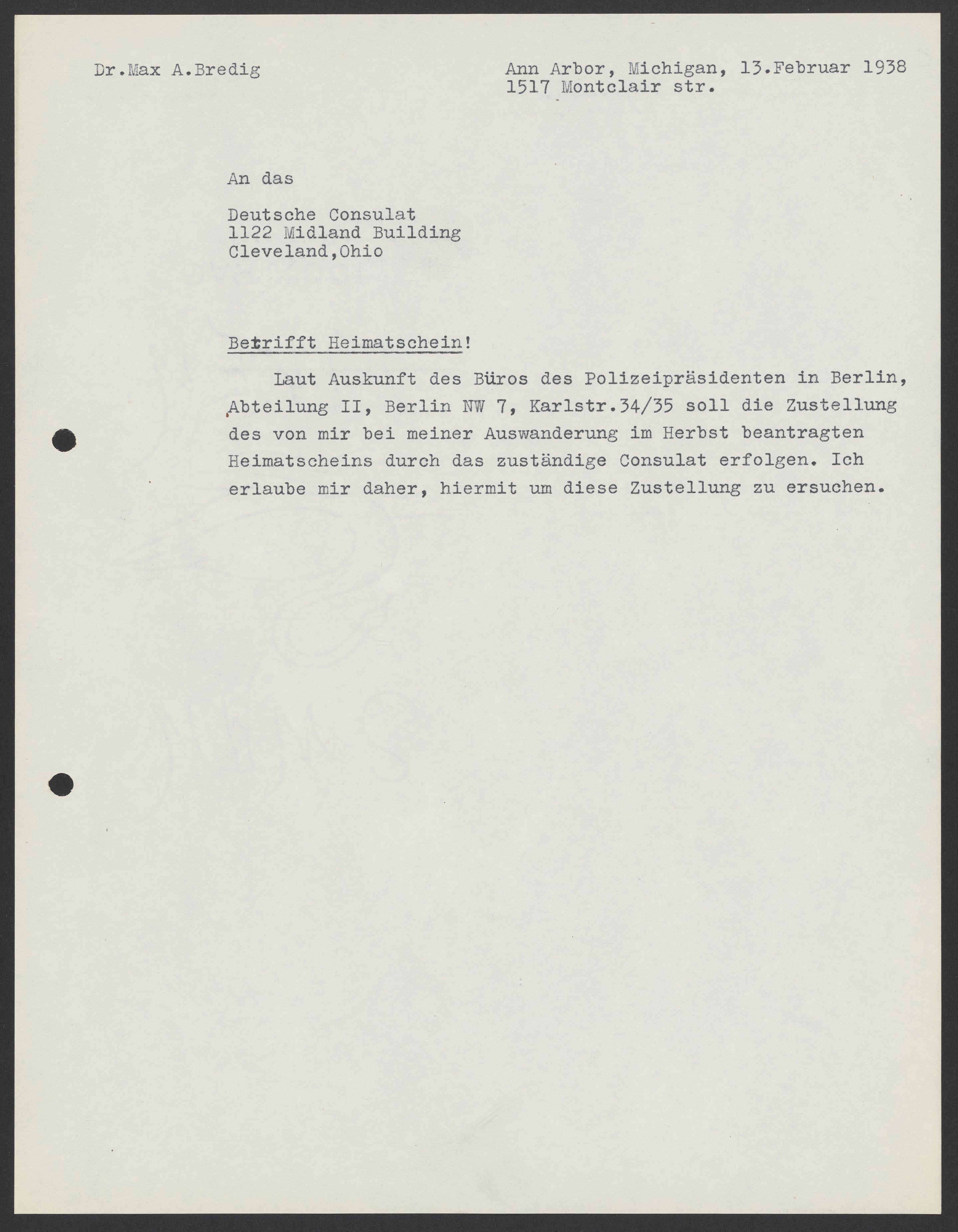 Letter from Max Bredig to the German Consulate, February 13, 1938