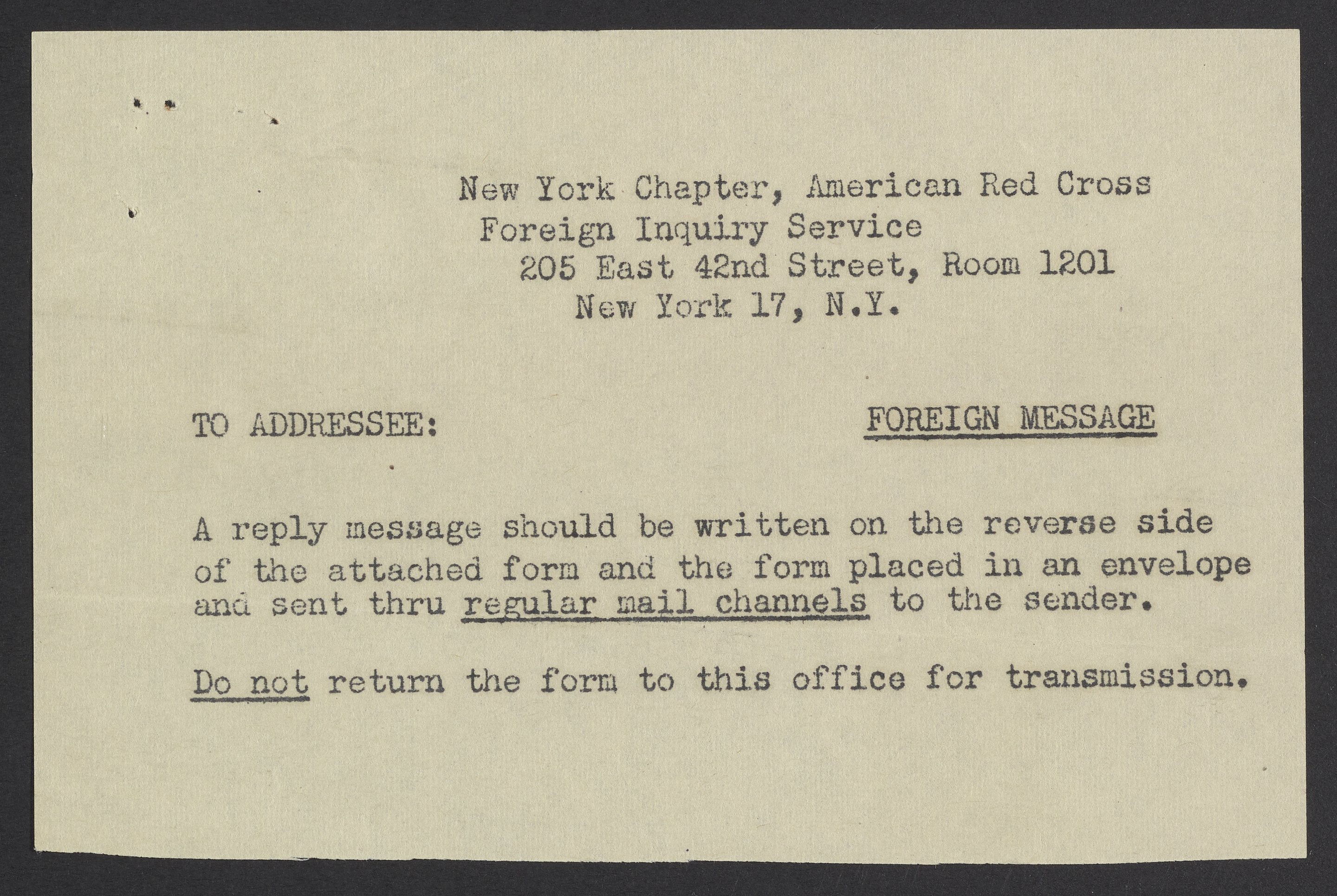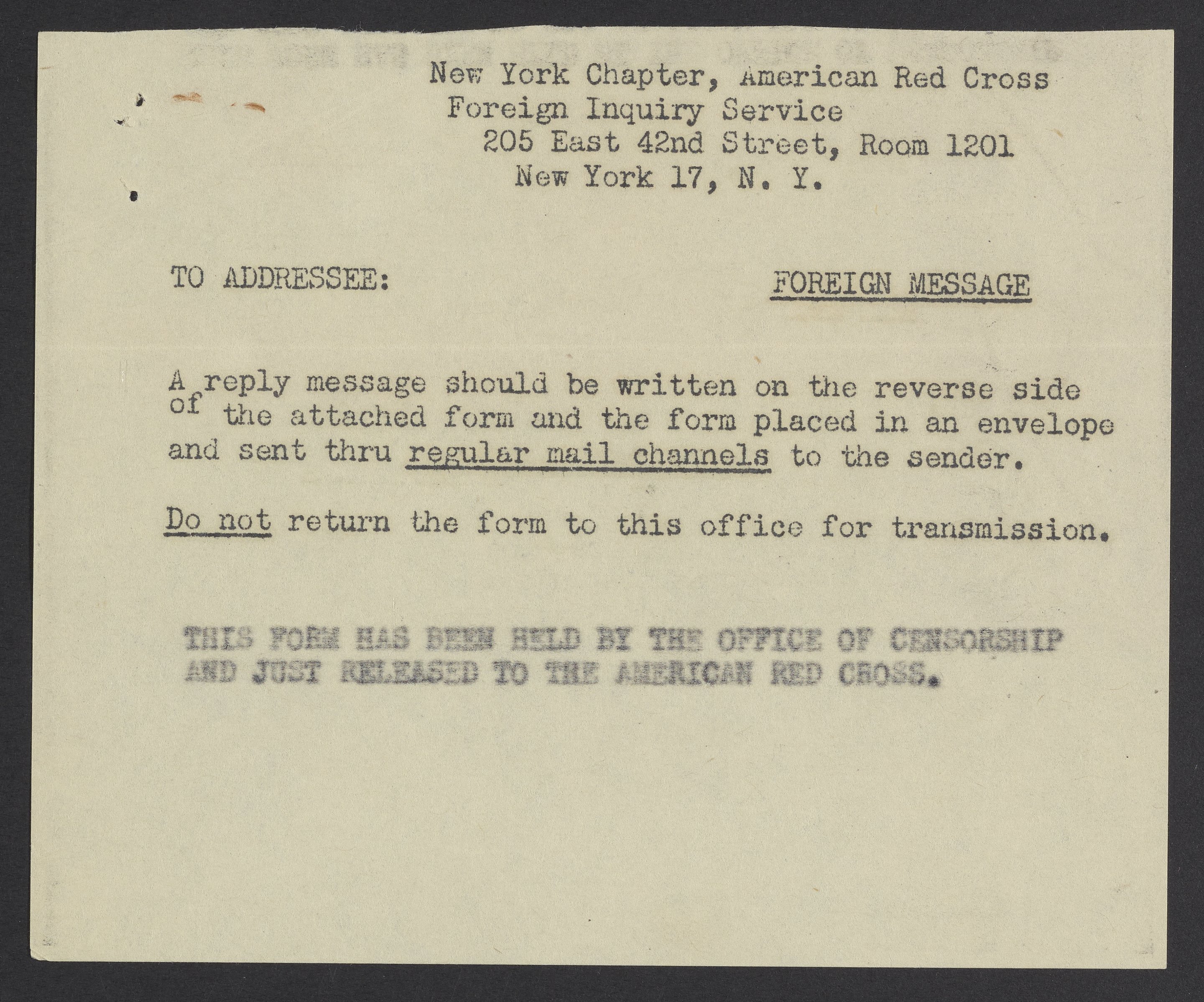 Small JPG1200 x 999px — 184 KBLarge JPG2880 x 2397px — 1.2 MBFull-sized JPG3550 x 2955px — 1.8 MBOriginal fileTIFF — 3550 x 2955px — 30.1 MBCensorship information provided by the American Red Cross. During the Second World War, international correspondence was censored by the United States Military and Post Office to protect sensitive information.