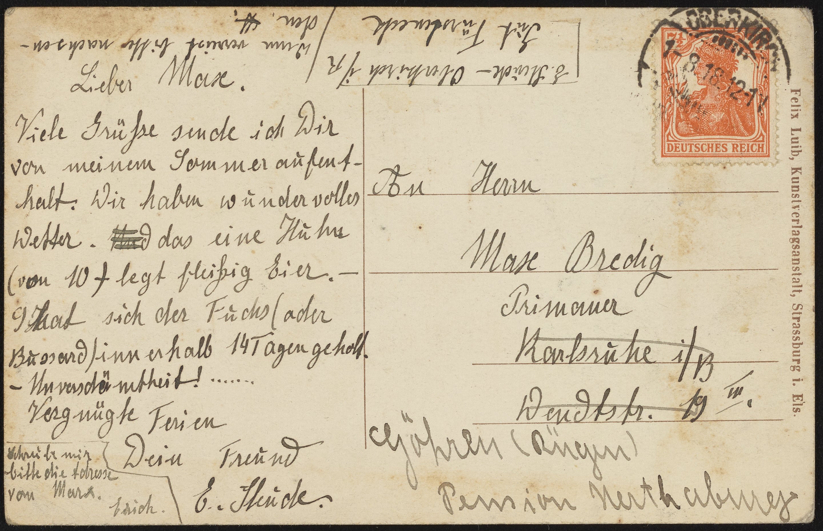 1919 postcard of Oberkirch, Germany to Max Bredig
